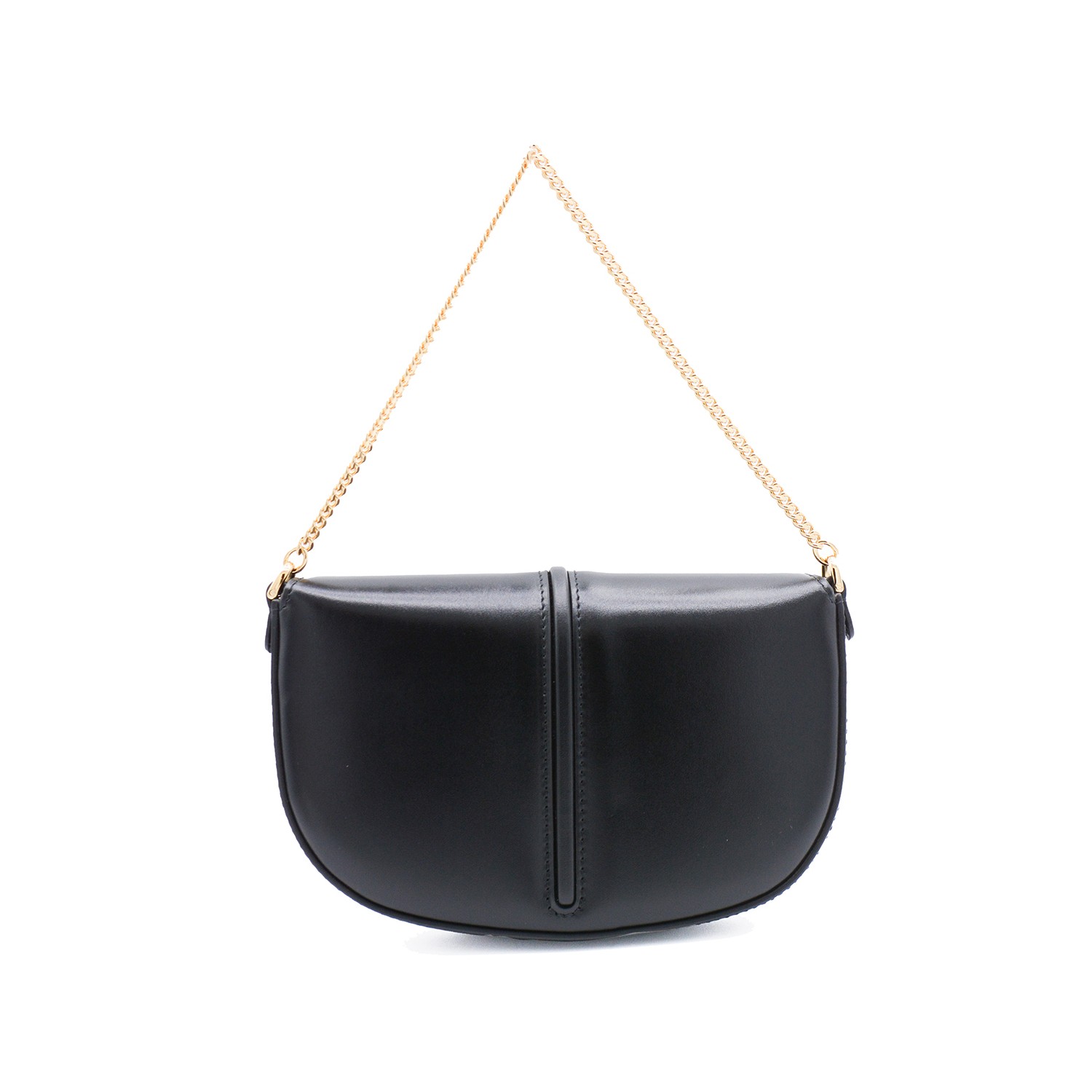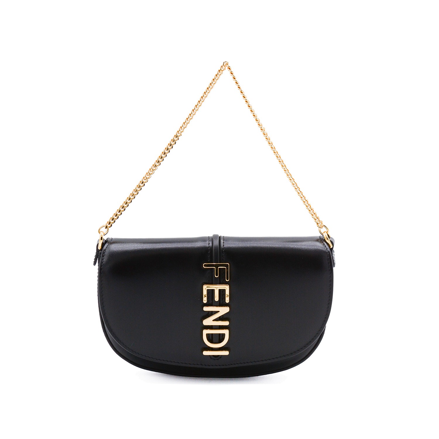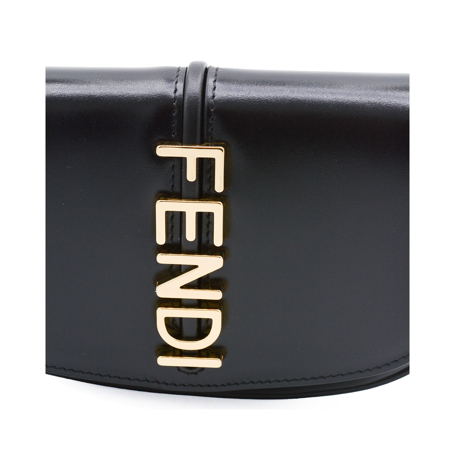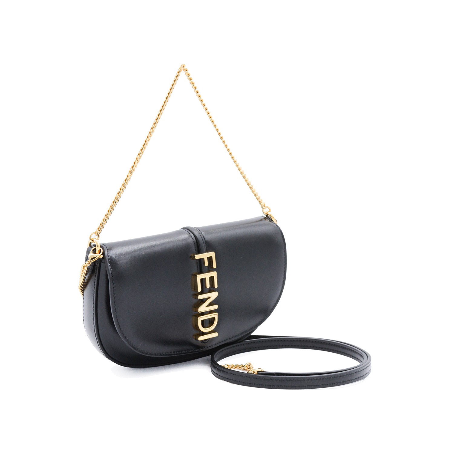Black leather Fendigraphy mini bag from Fendi featuring gold tone hardware, metal logo lettering, removable chain shoulder strap, magnetic closure and main compartment.