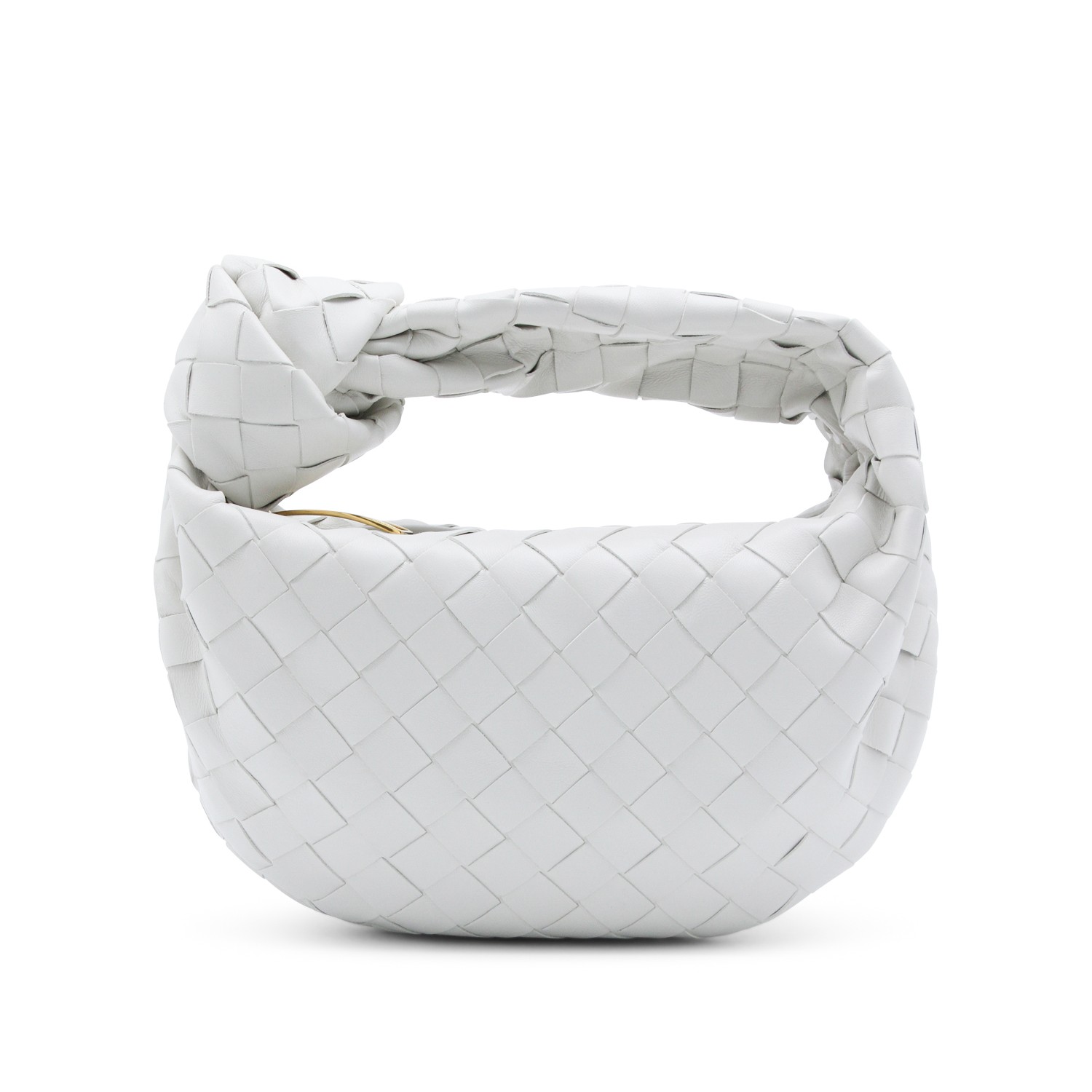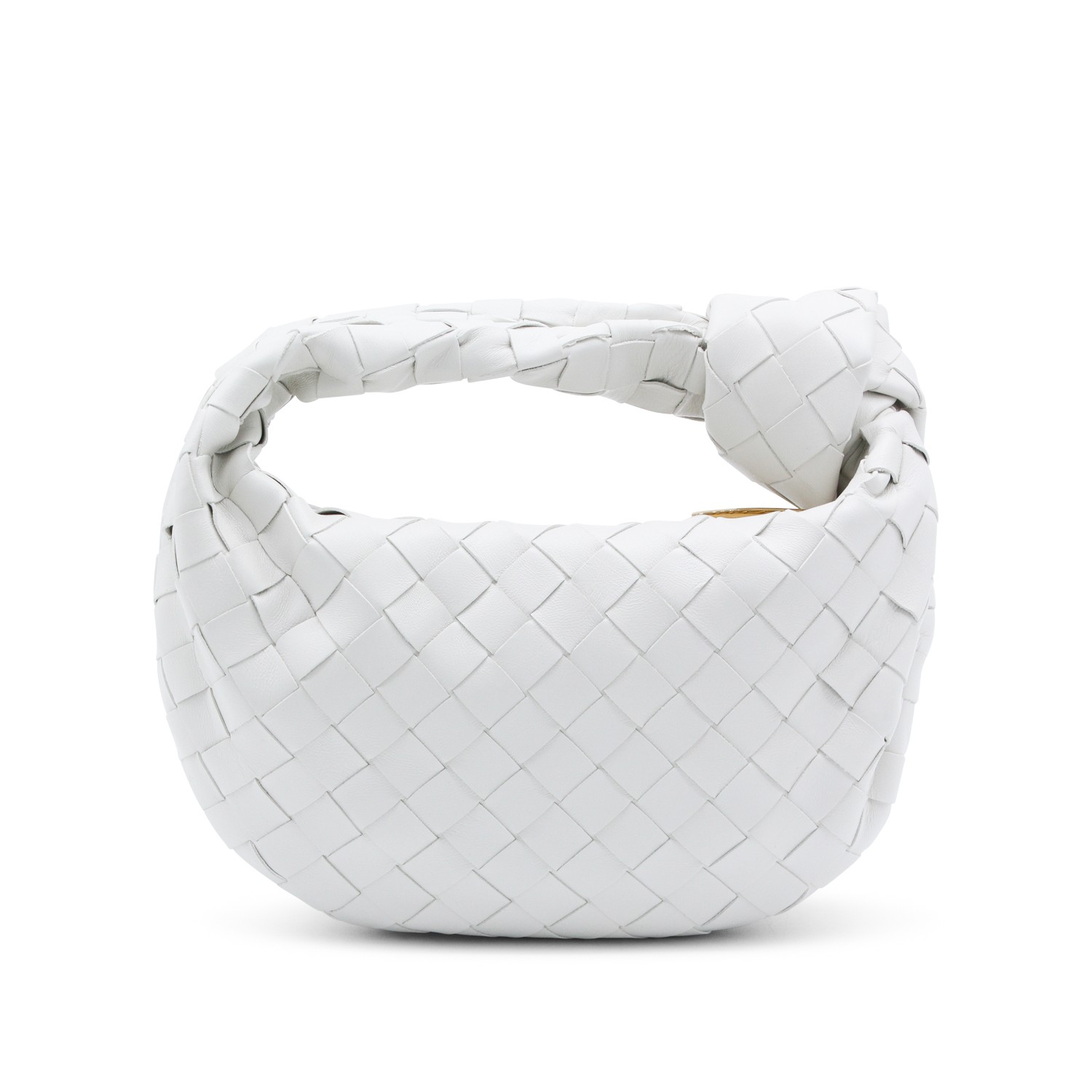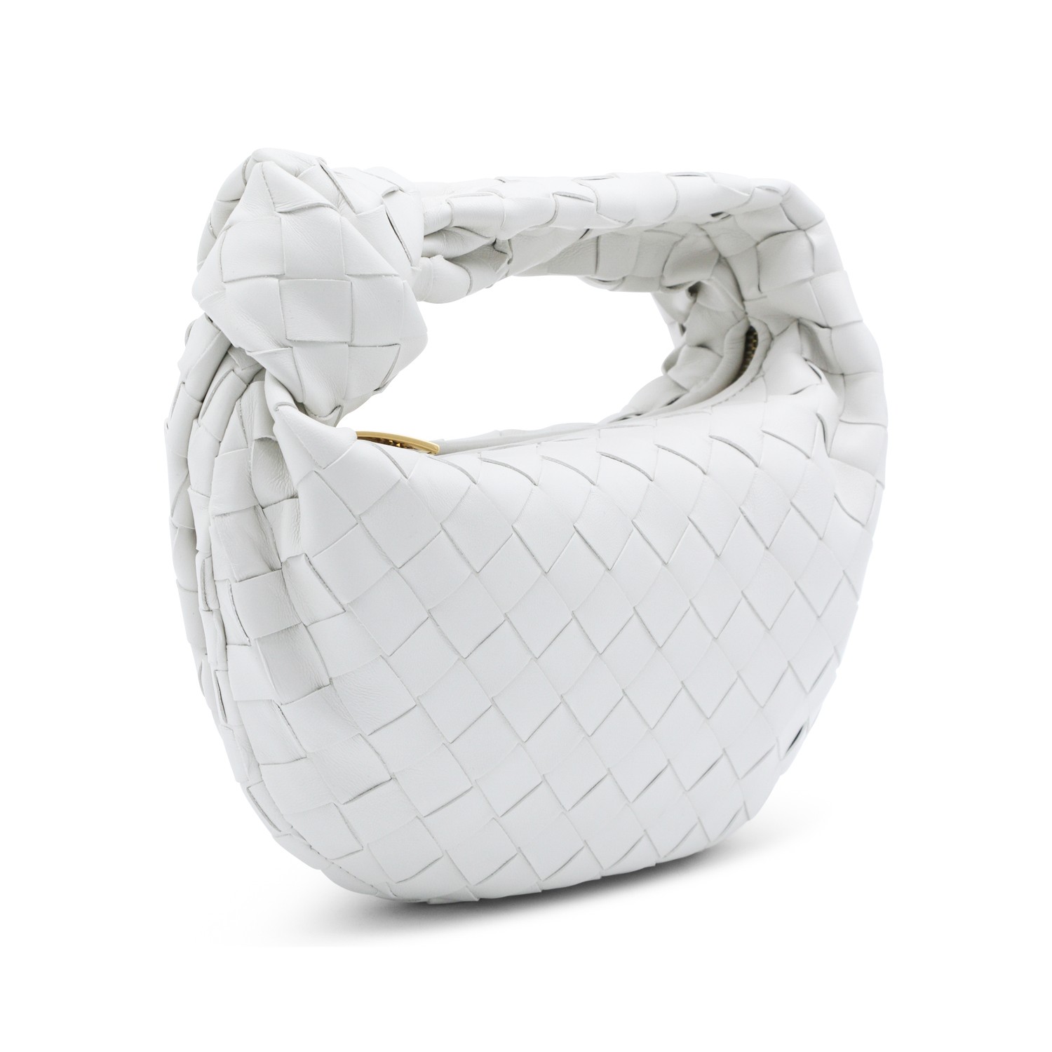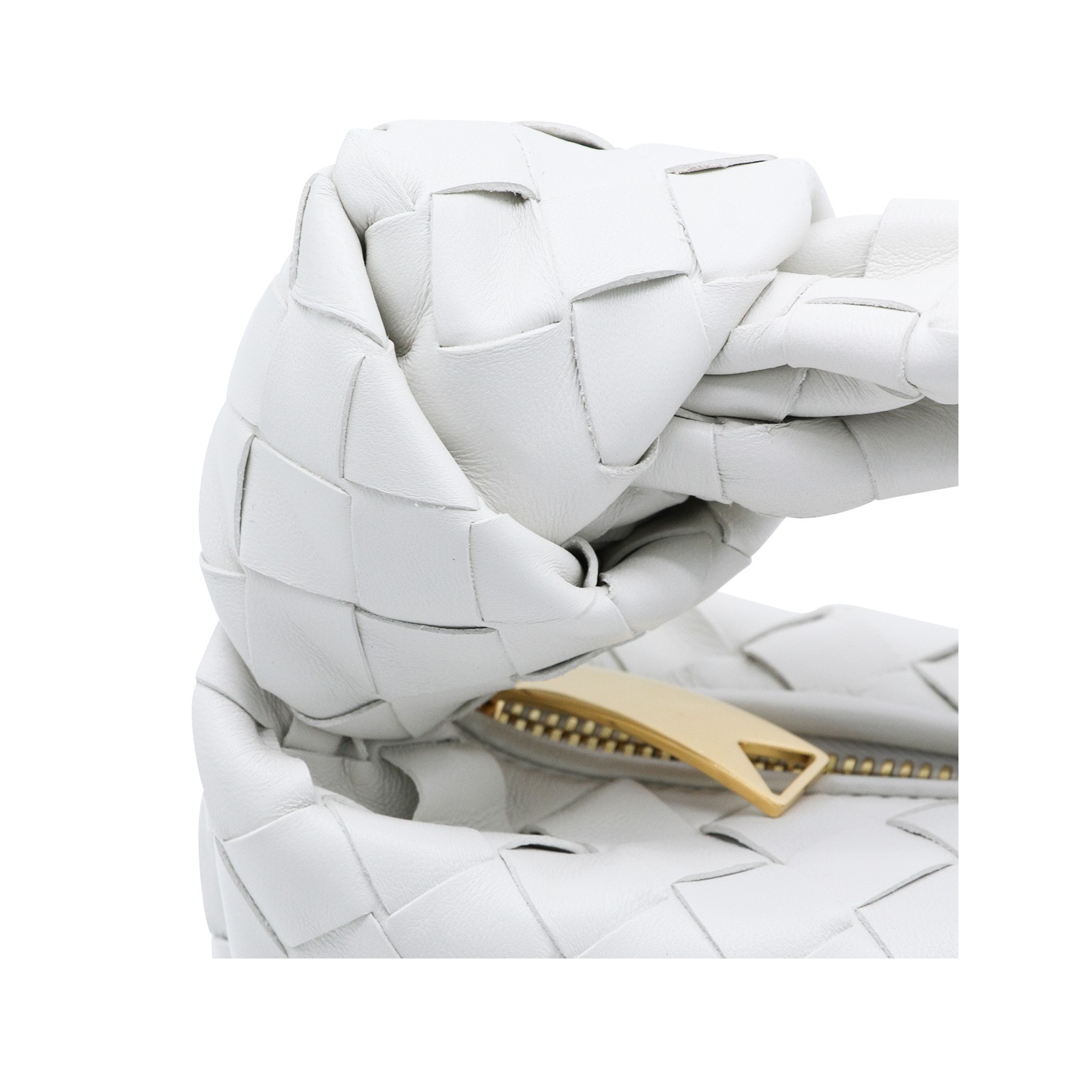 White leather Mini Jodie bag from Bottega Veneta featuring all over Intreccio motif, top handle, top zip closure and main compartment.