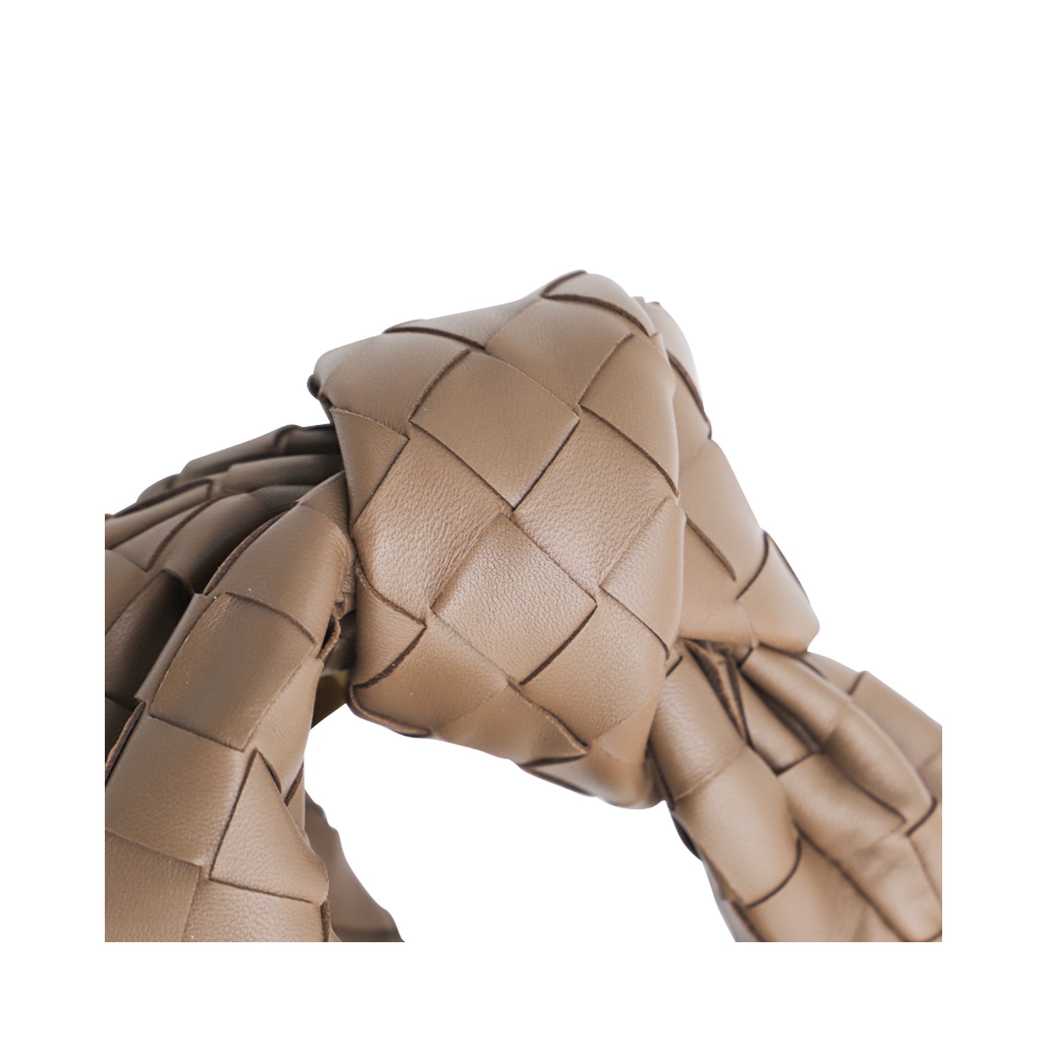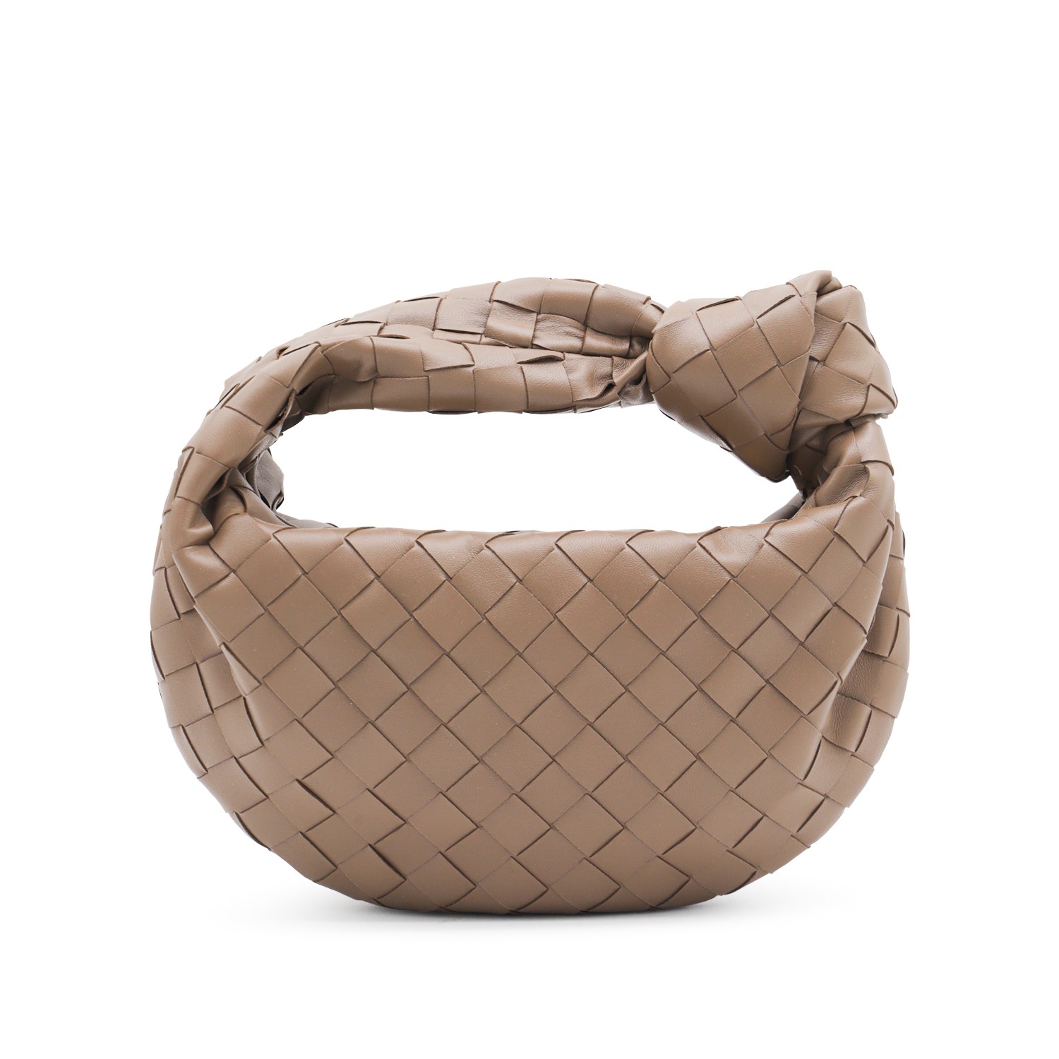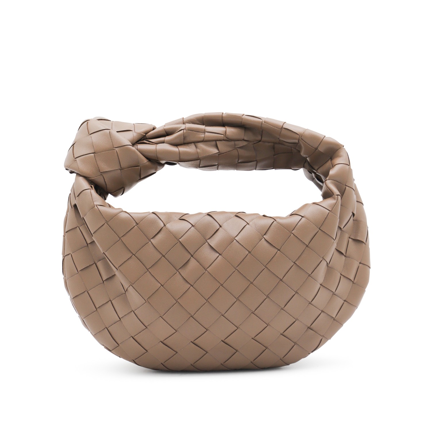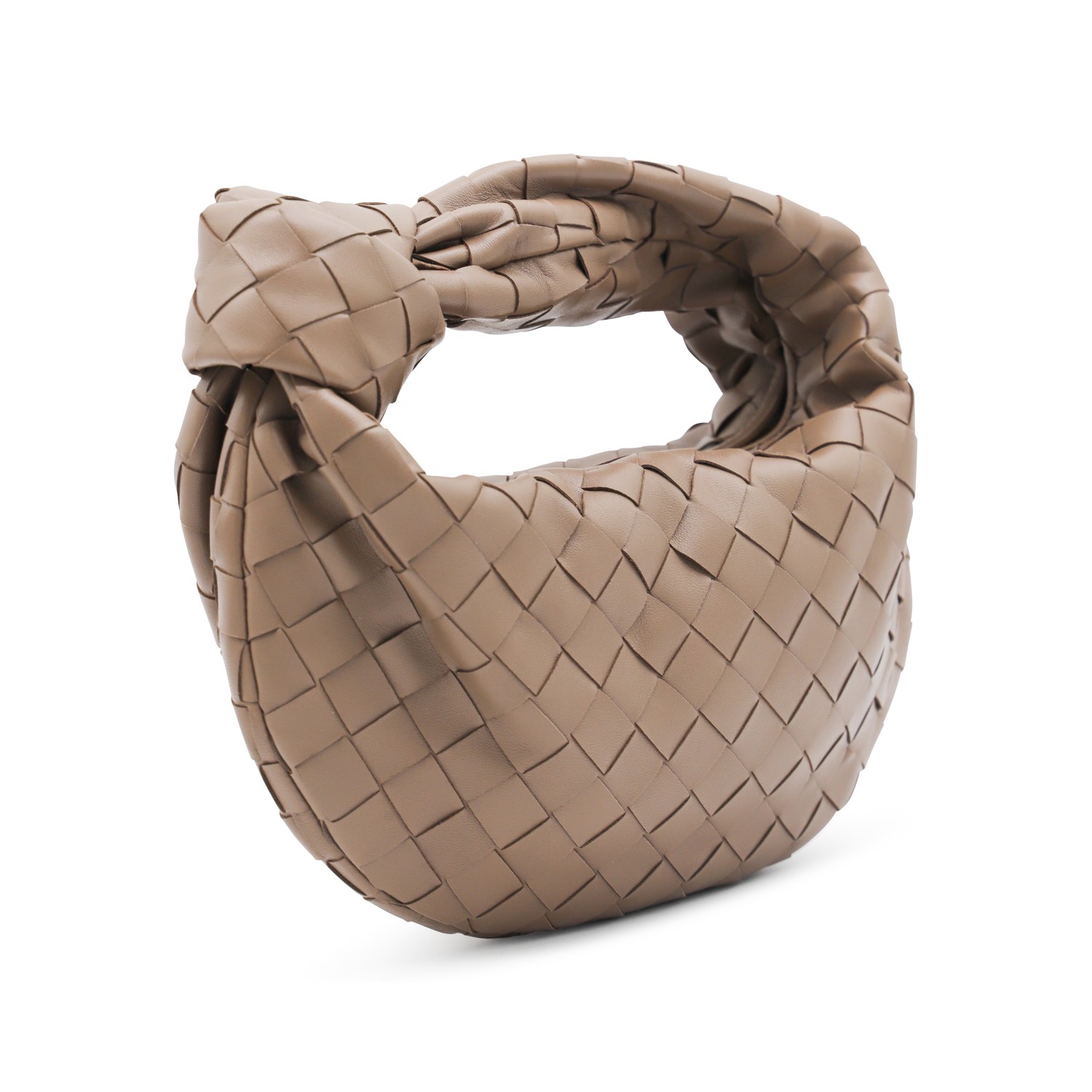 Beige leather Mini Jodie bag from Bottega Veneta featuring all-over Intrecciato motif, gold tone metal hardware, zip fastening, iconic knot detail and single compartment.