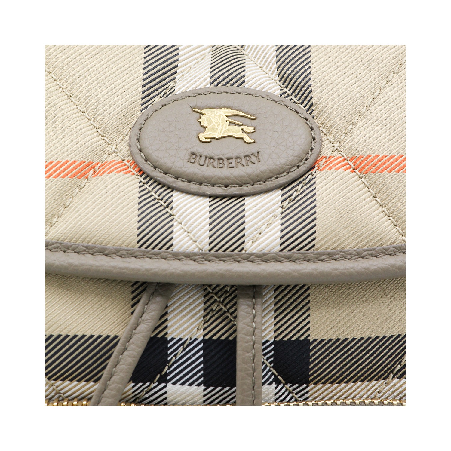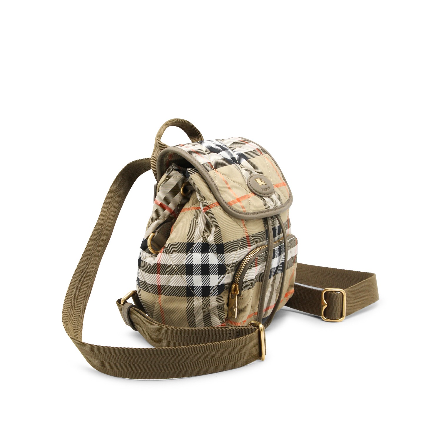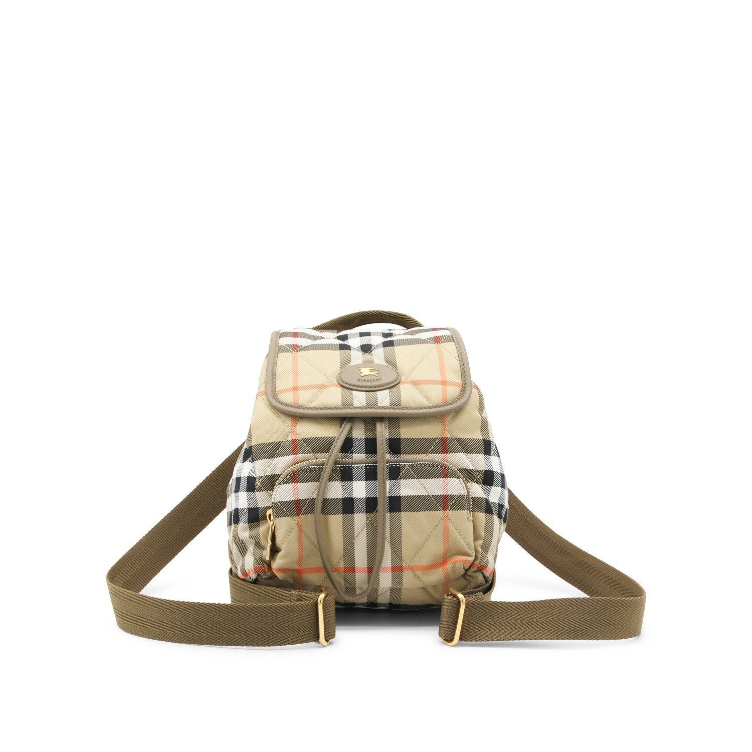 Beige backpack from Burberry featuring top handle, main compartment, button fastening, frontal pocket, adjustable straps and all over iconic stamp.