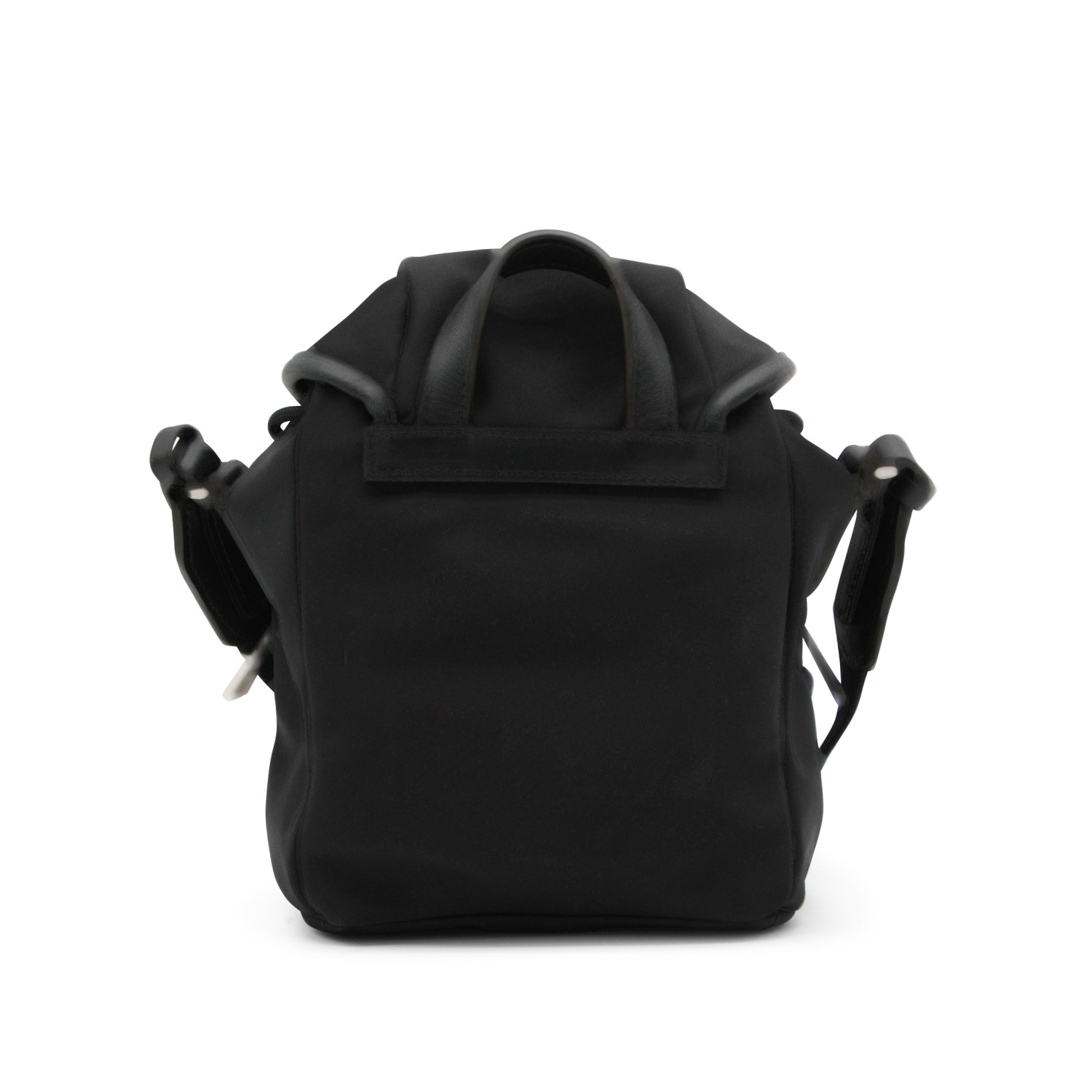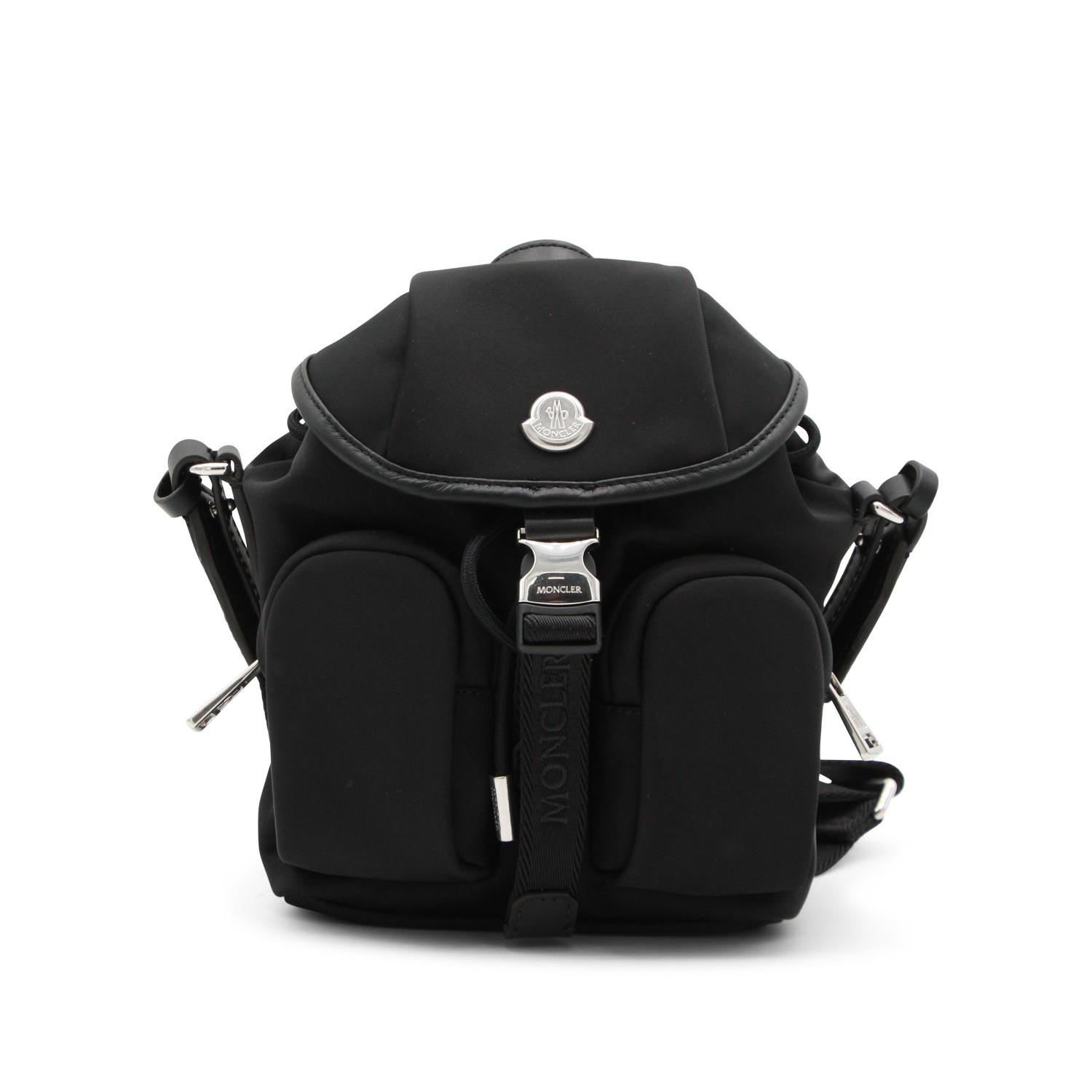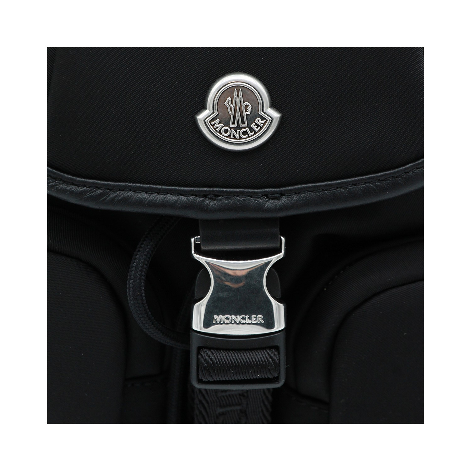 Black backpack from Moncler featuring leather top handle, flap closure with buckle, frontal pockets, adjustable straps, metal logo and compartments.