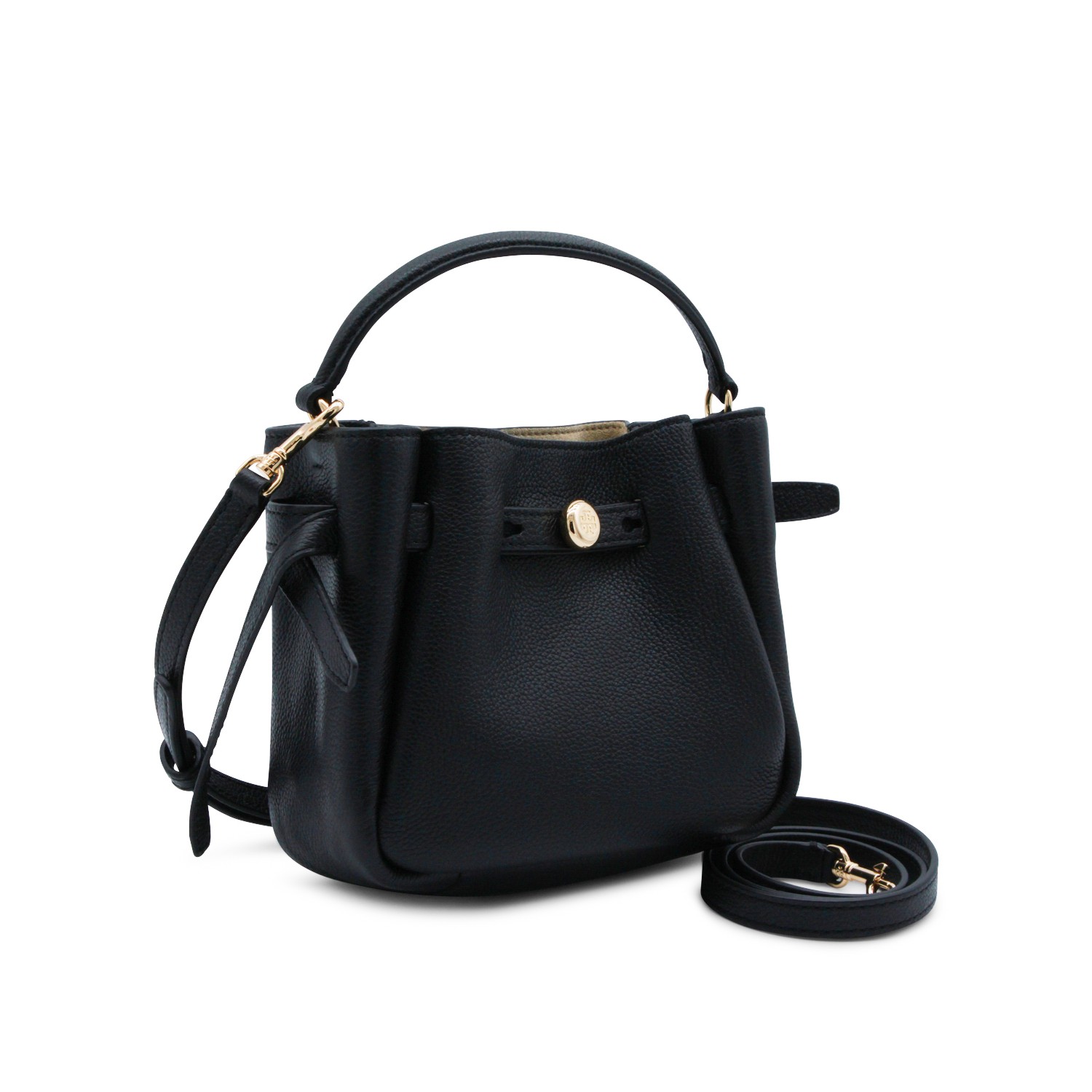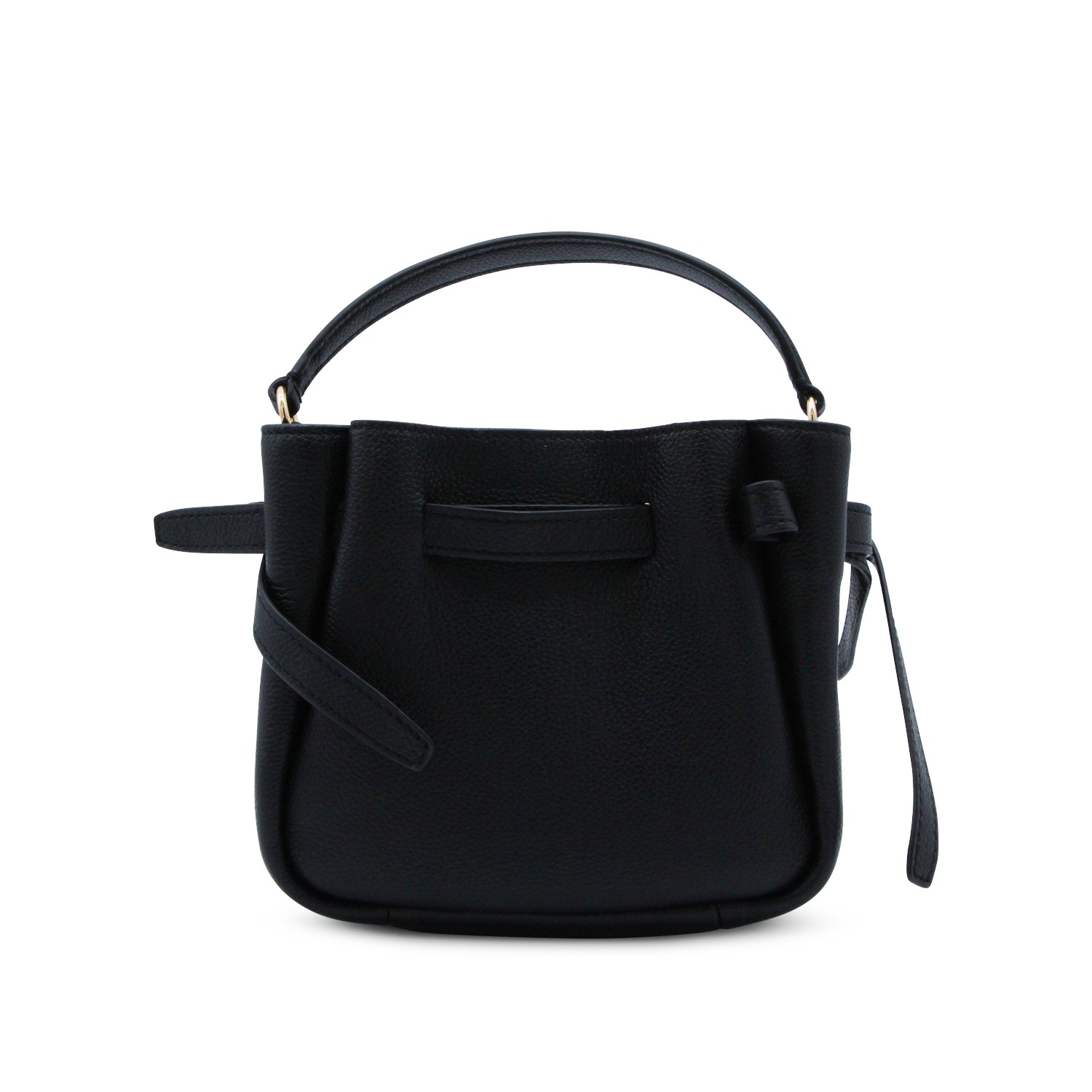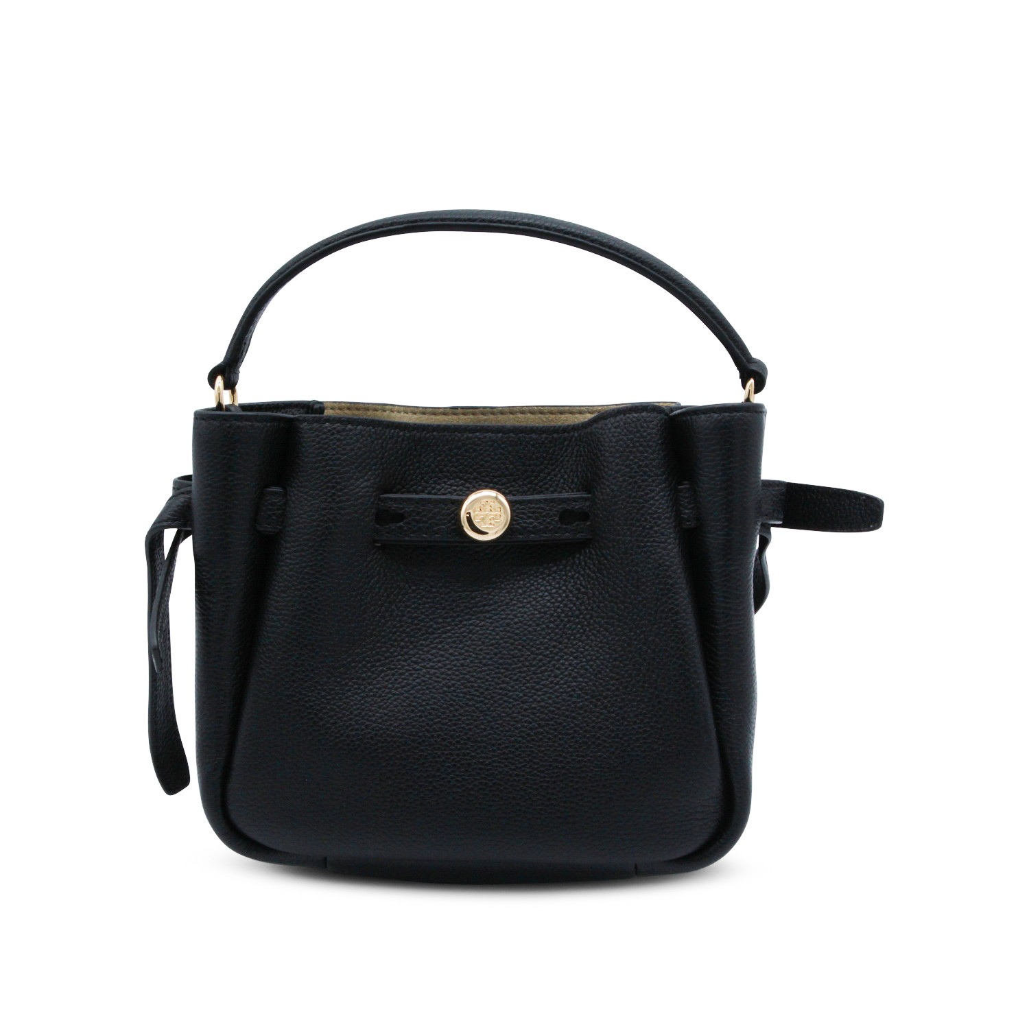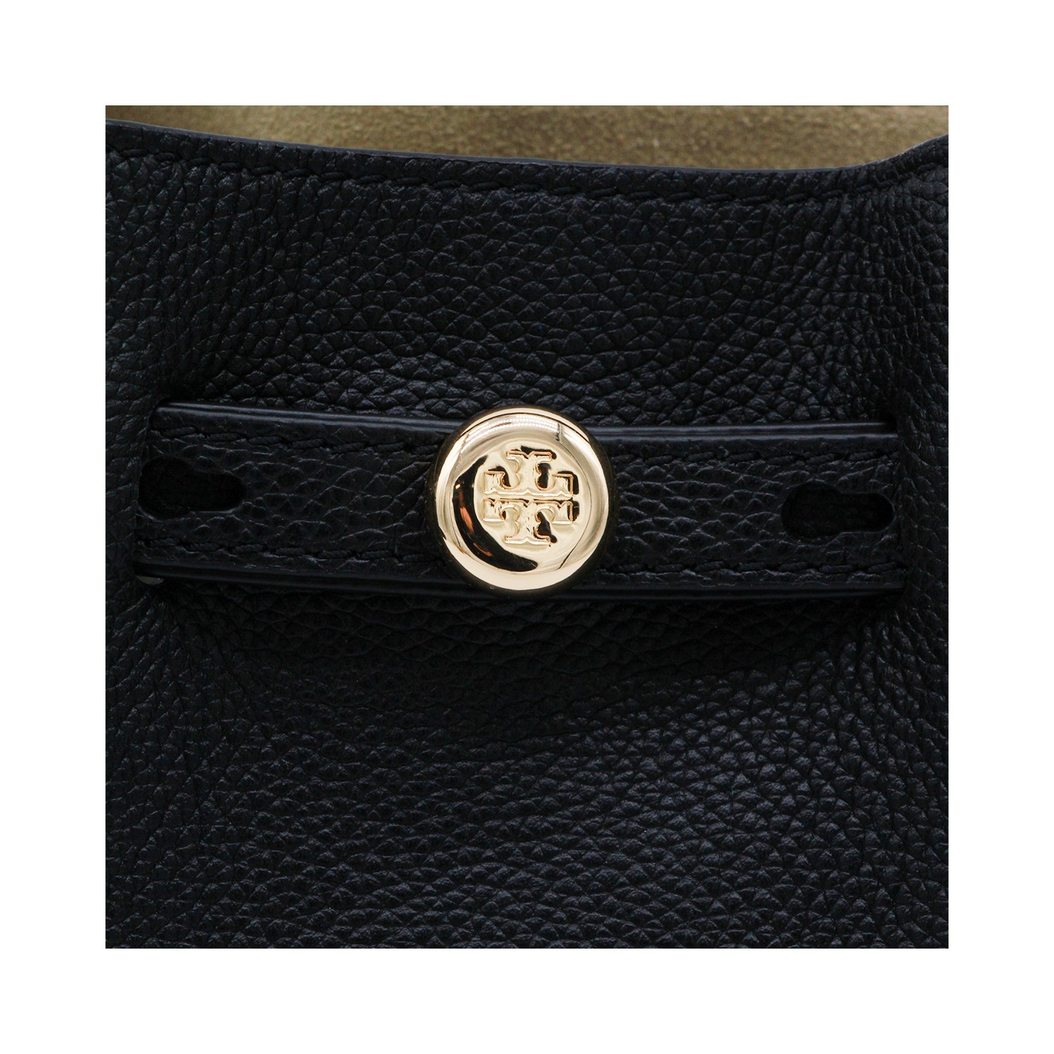 Black leather satchel from Tory Burch featuring top handle, gold tone hardware, upper fastening, inside pocket and adjustable strap.