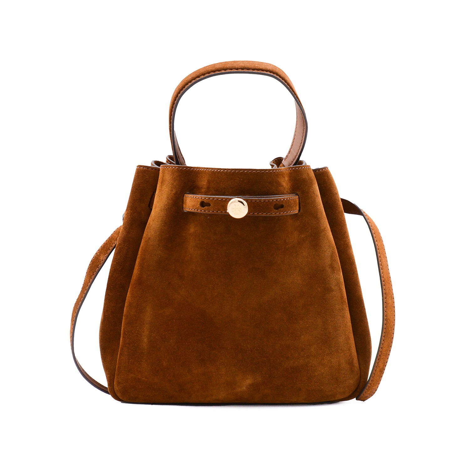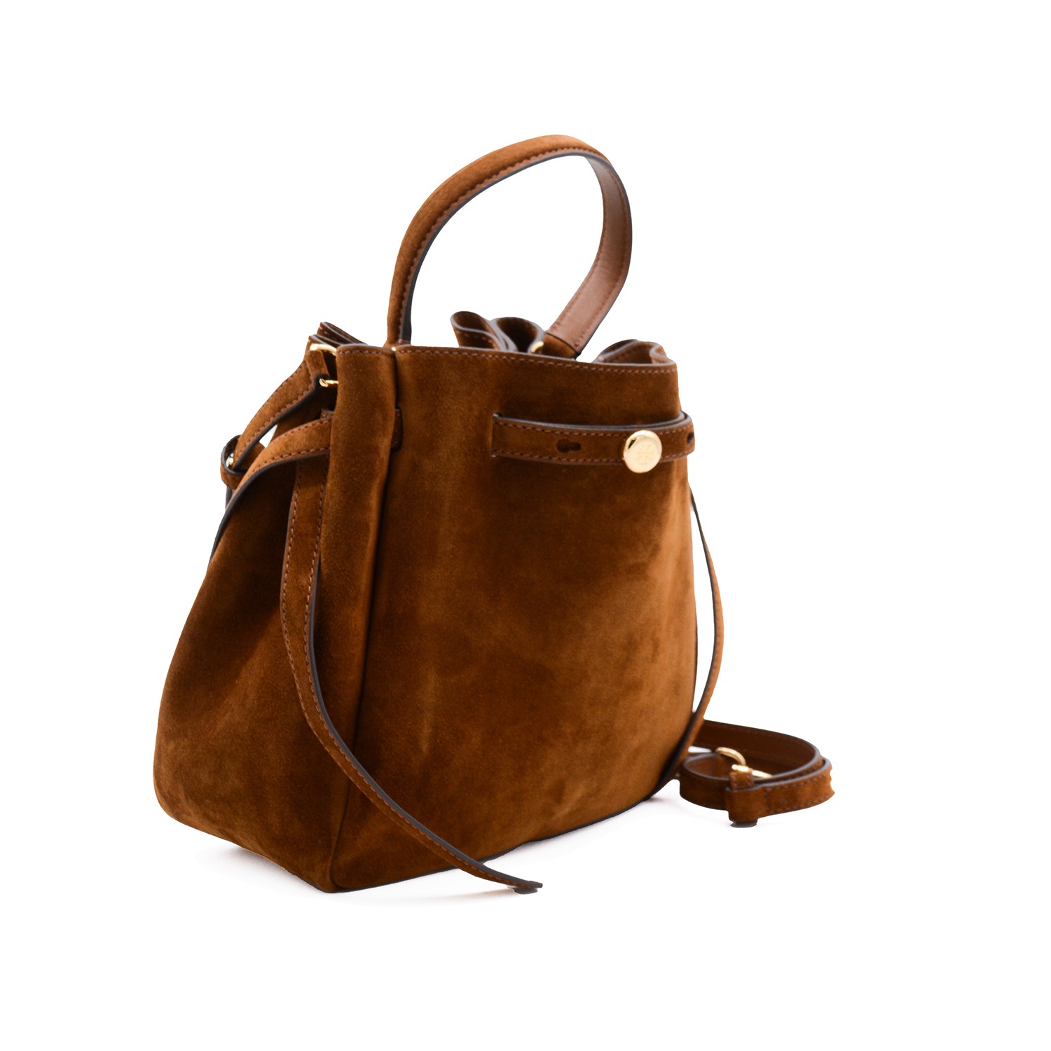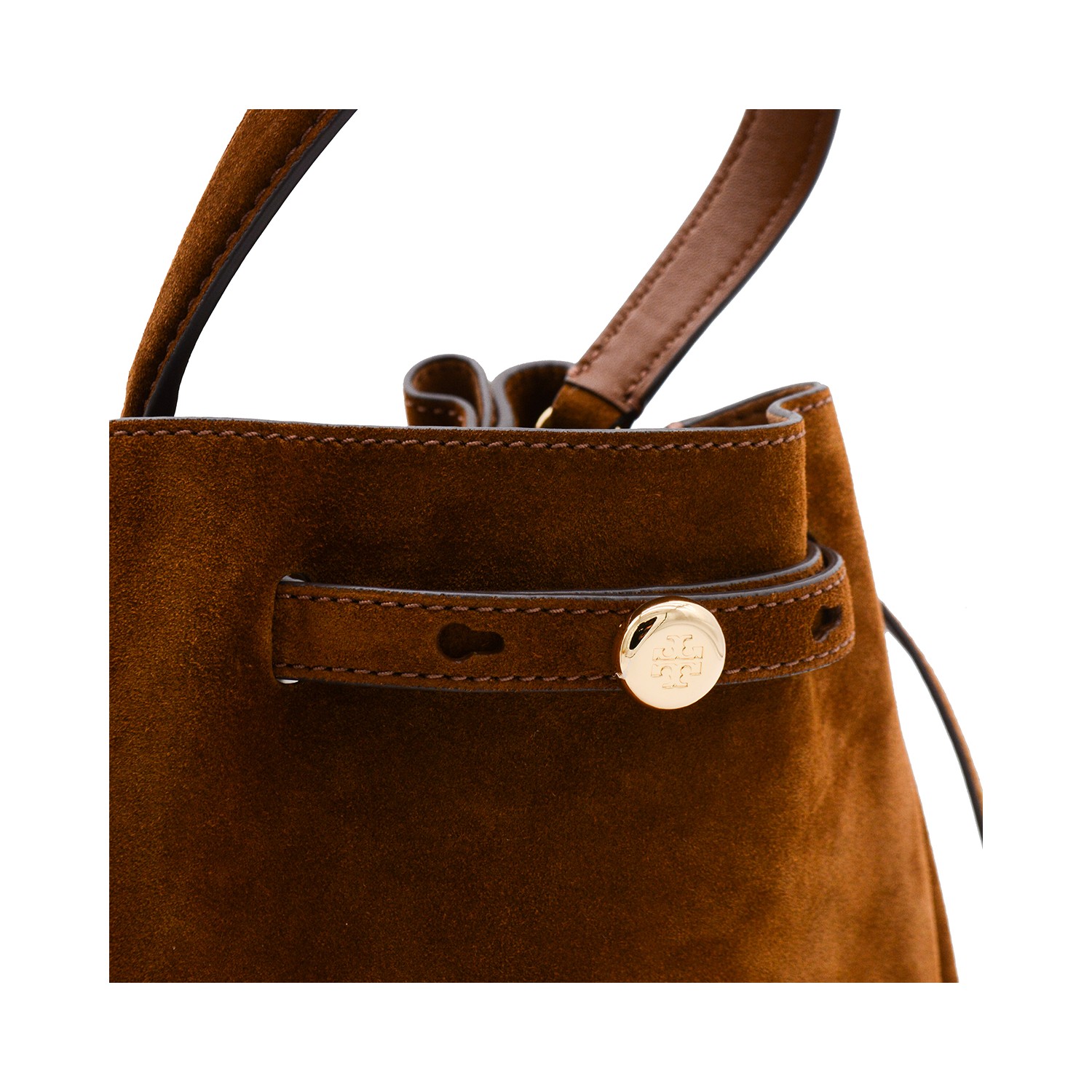 Brown leather satchel from Tory Burch featuring top handle, gold tone hardware, upper fastening, suede, inside pocket and adjustable strap.