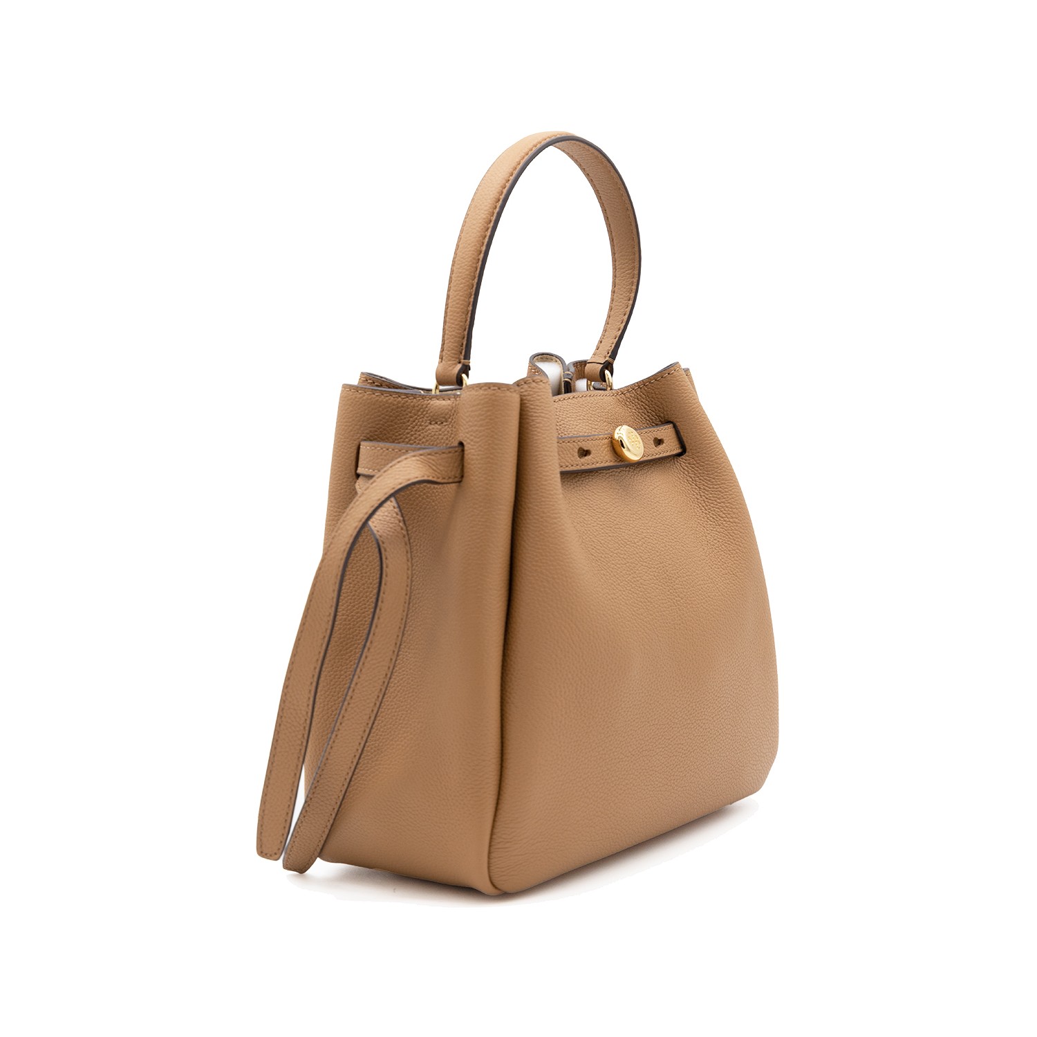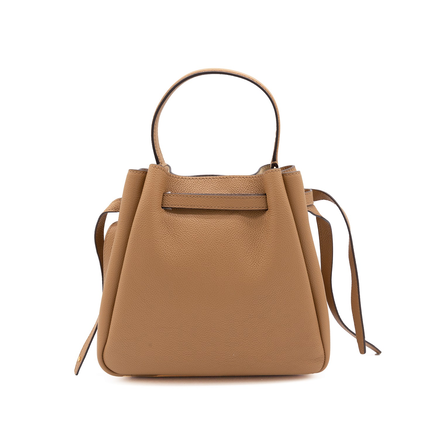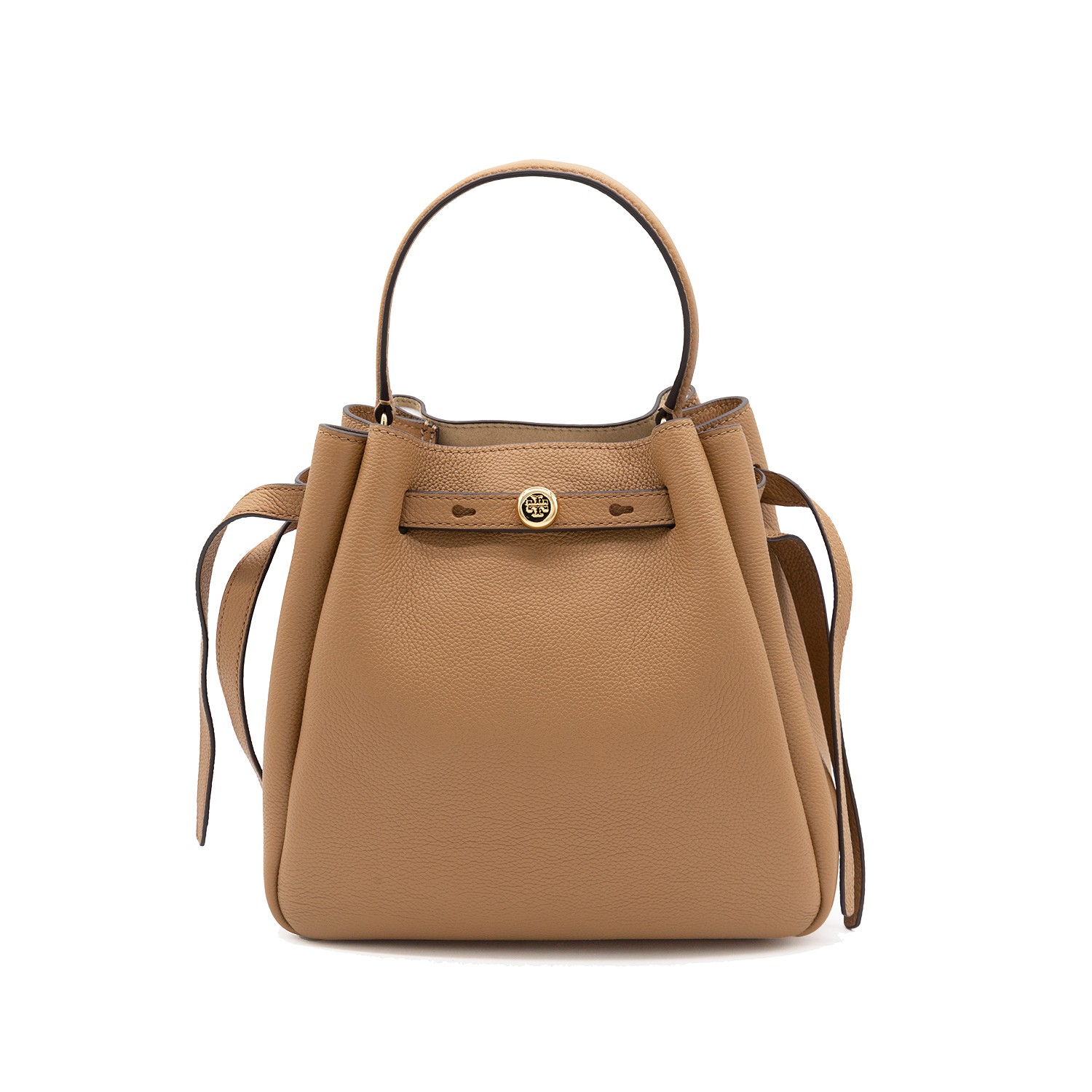 Brown leather Romy bucket bag from Tory Burch featuring top handle, upper fastening, gold tone hardware and inside pocket.