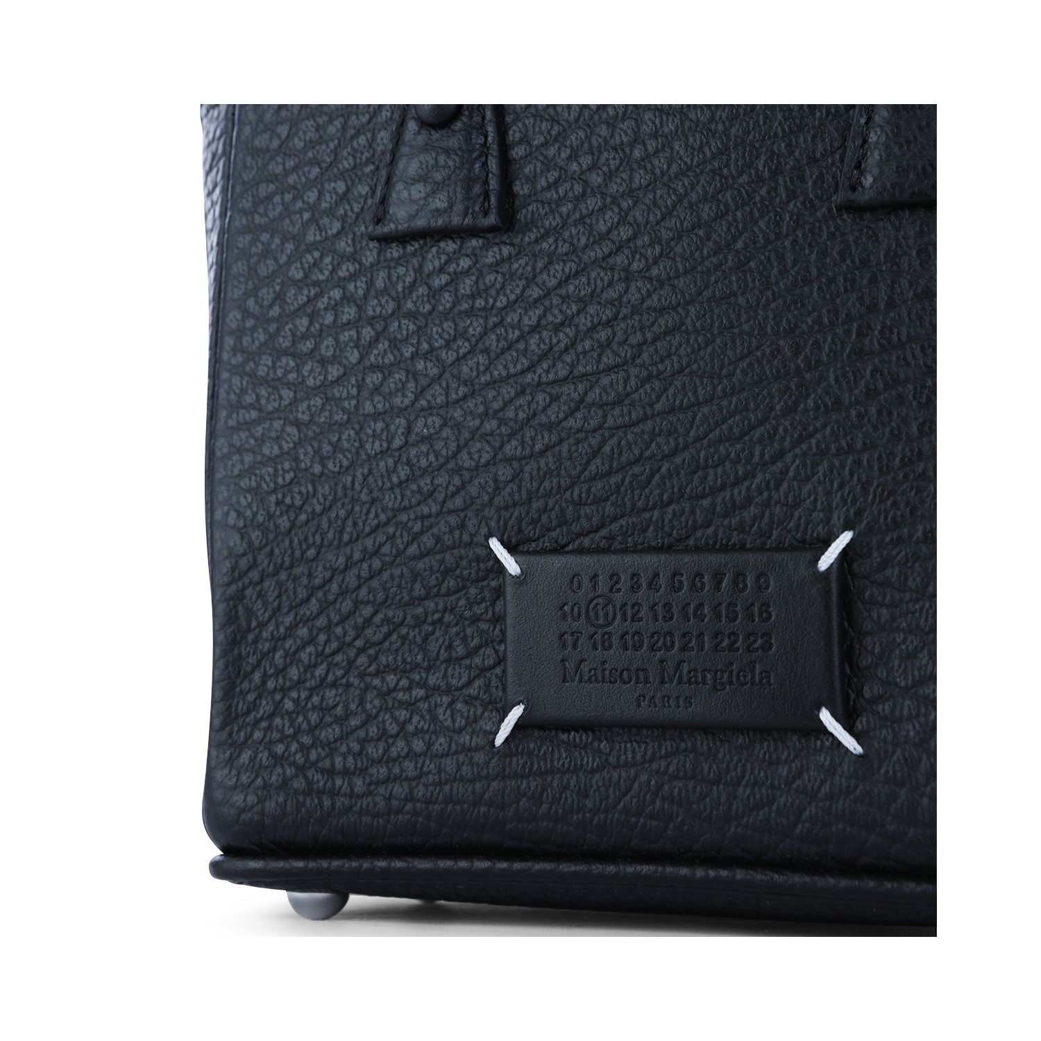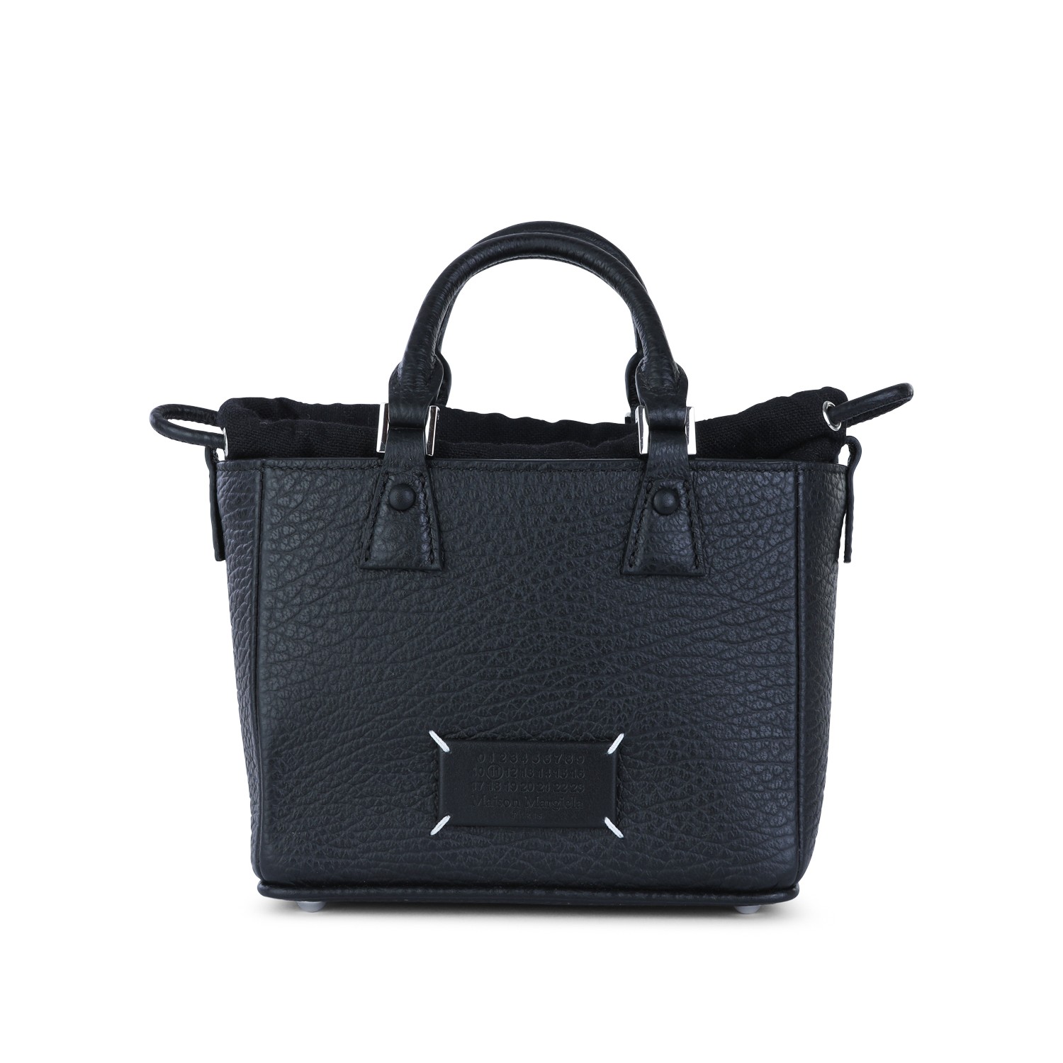 Black leather 5AC Horizontal satchel from Maison Margiela featuring top handles, cotton drawstring top with structured body, removable chain shoulder strap, internal zip pocket and frontal Numeric logo.