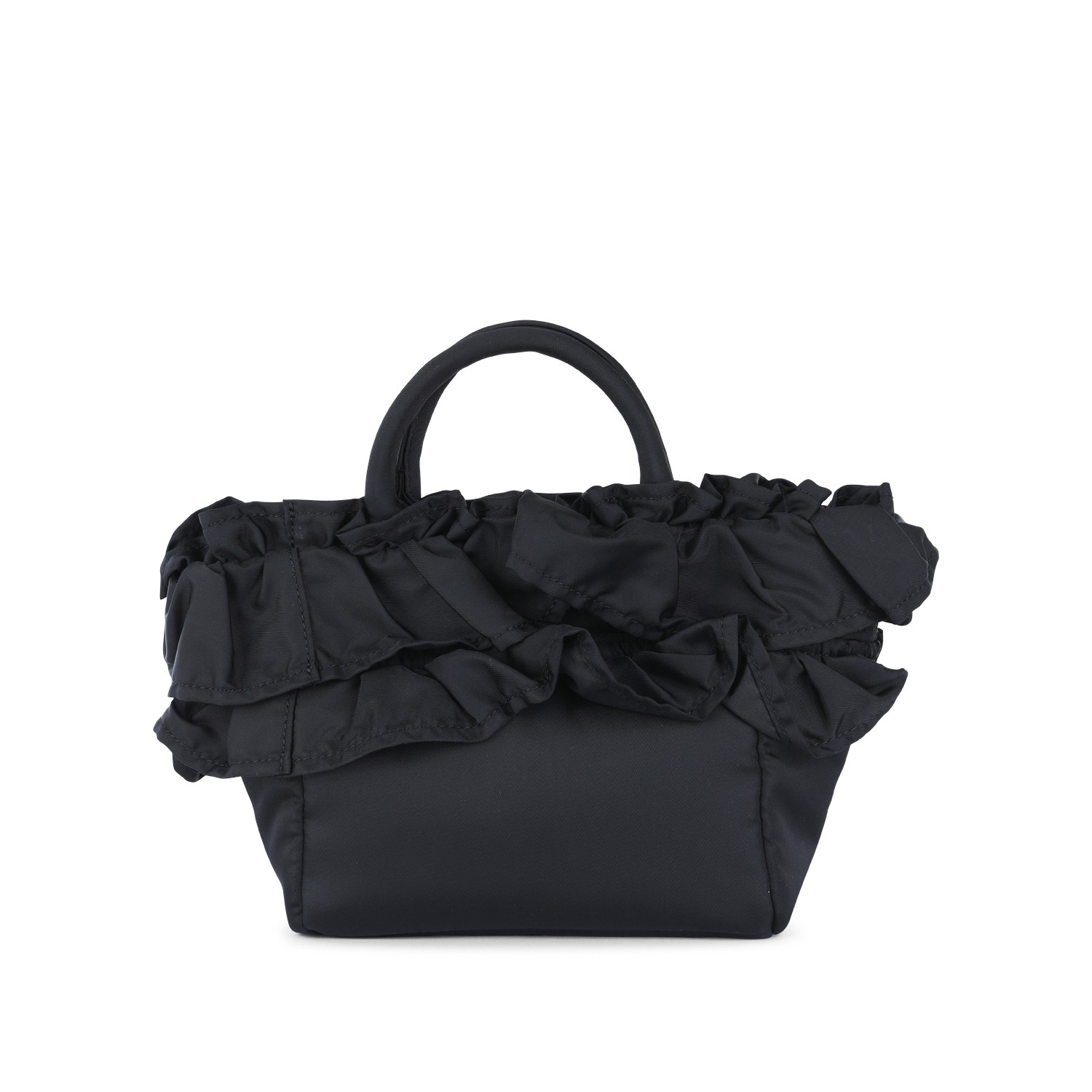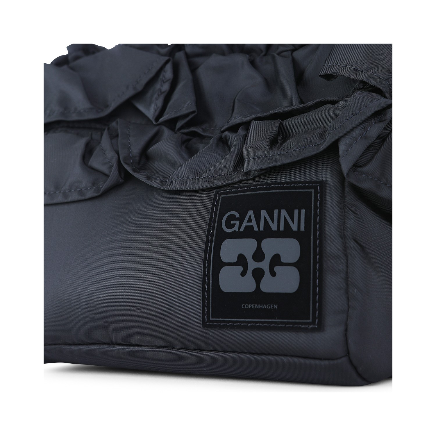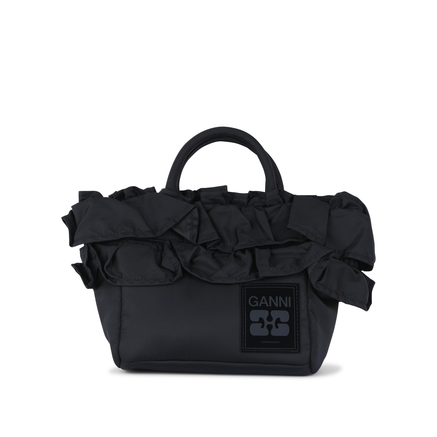 Black satchel from Ganni featuring top handles, ruffle trim detail, logo label and main compartment.