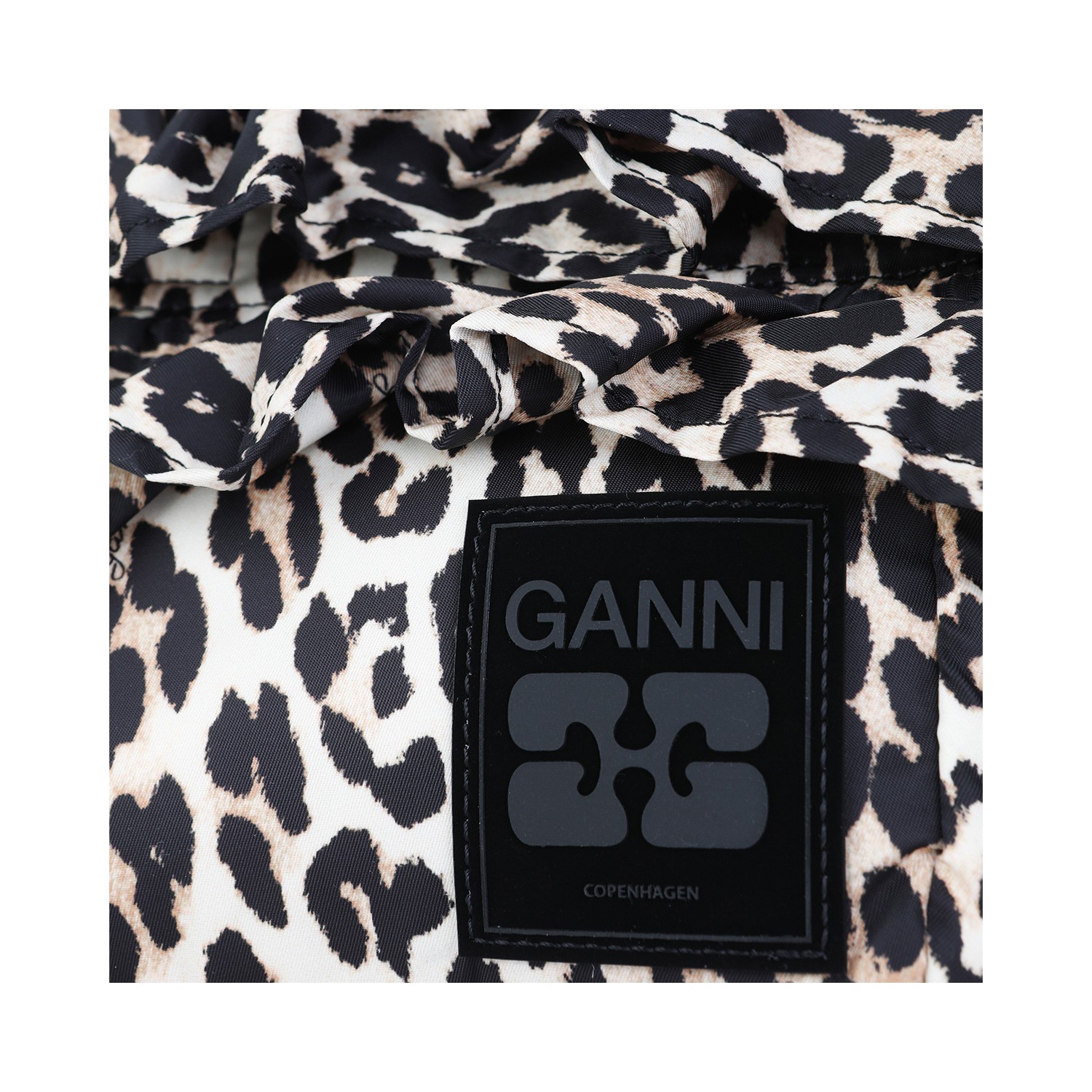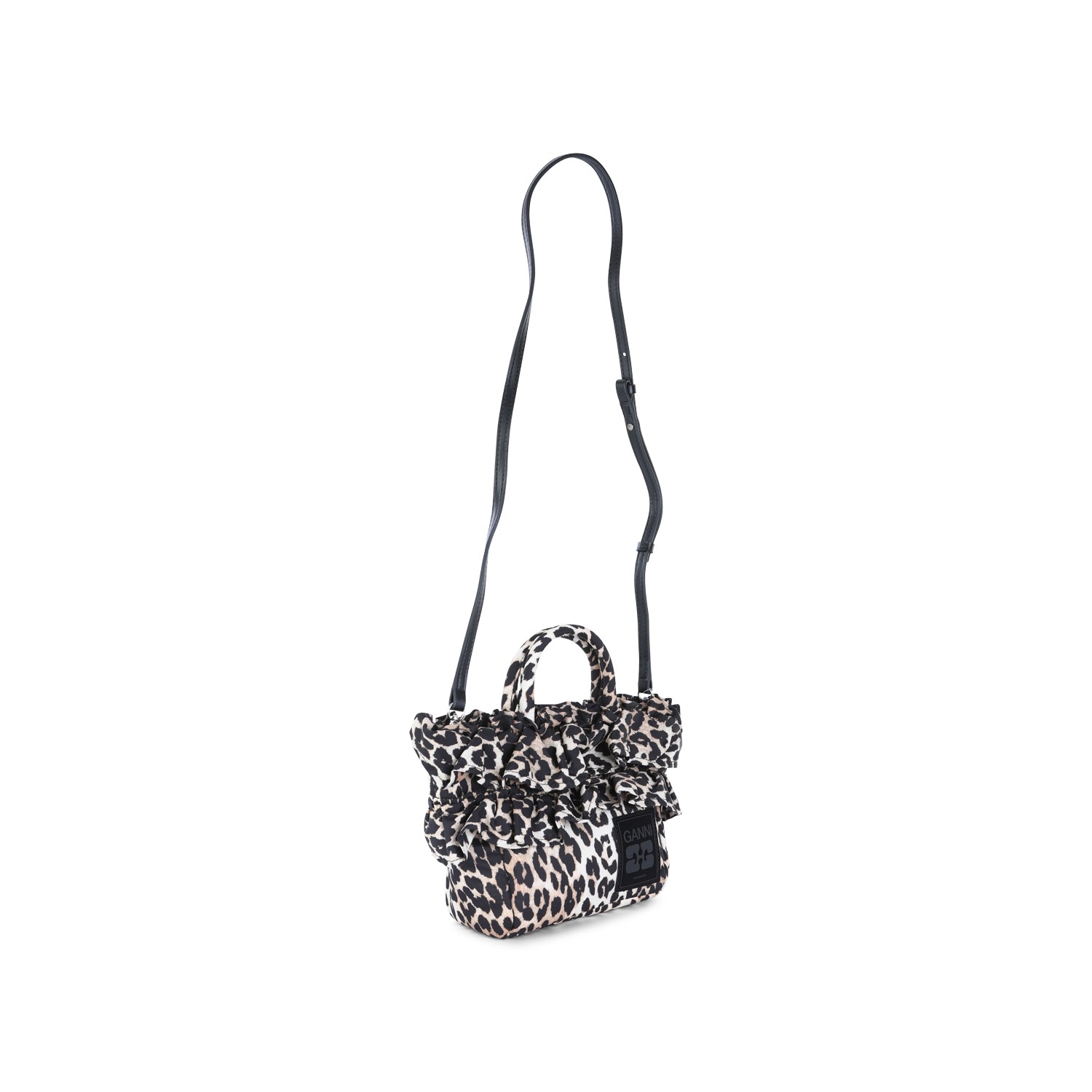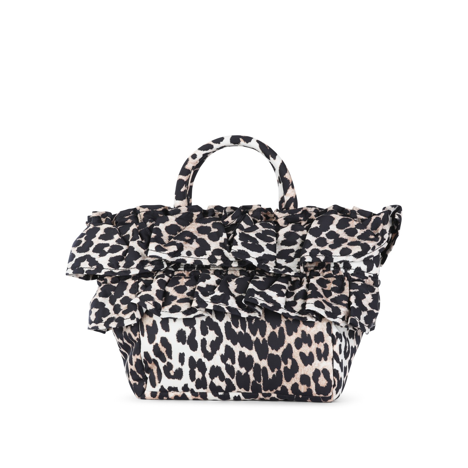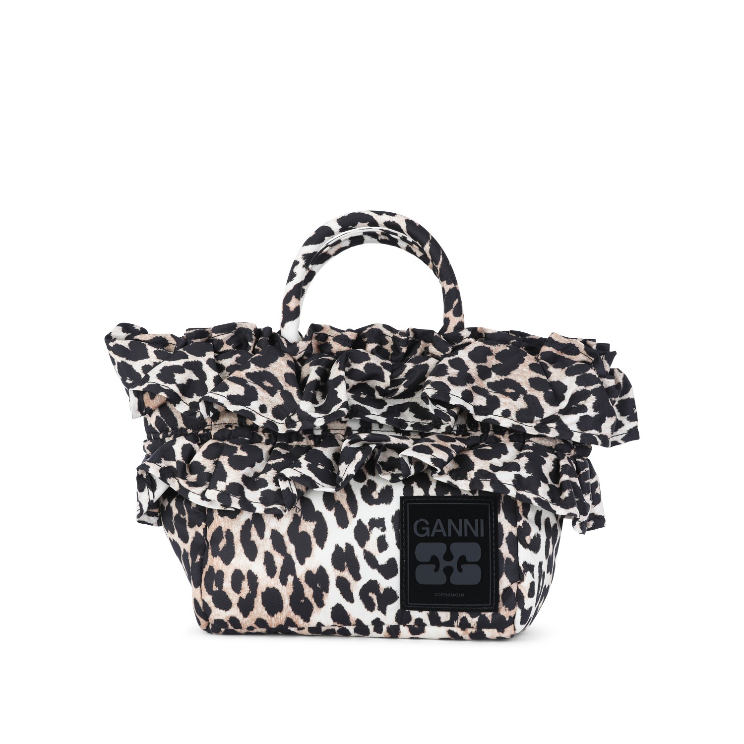 Leopard satchel from Ganni featuring top handles, ruffle trim detail, logo label and main compartment.