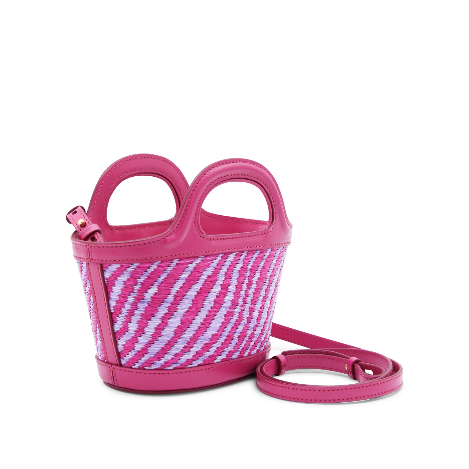 Pink satchel from Marni featuring rigid top handles, raffia design, snap button closure, adjustable and removable shoulder strap, logo and main compartment.