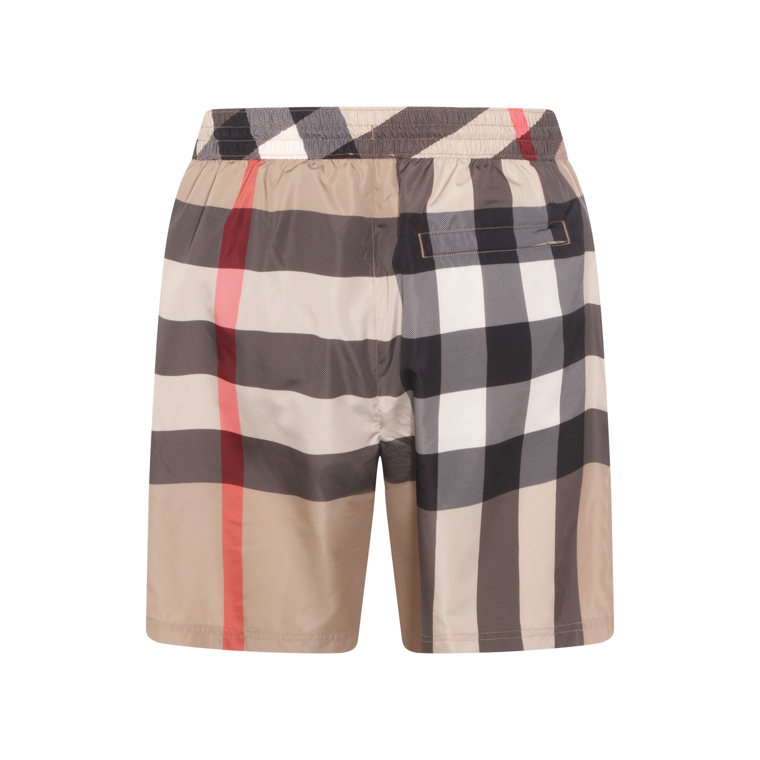 Beige boxer beachwear from Burberry featuring elasticated waist with drawstring, side slip pocket, back zip pocket, Check pattern and loose fit.