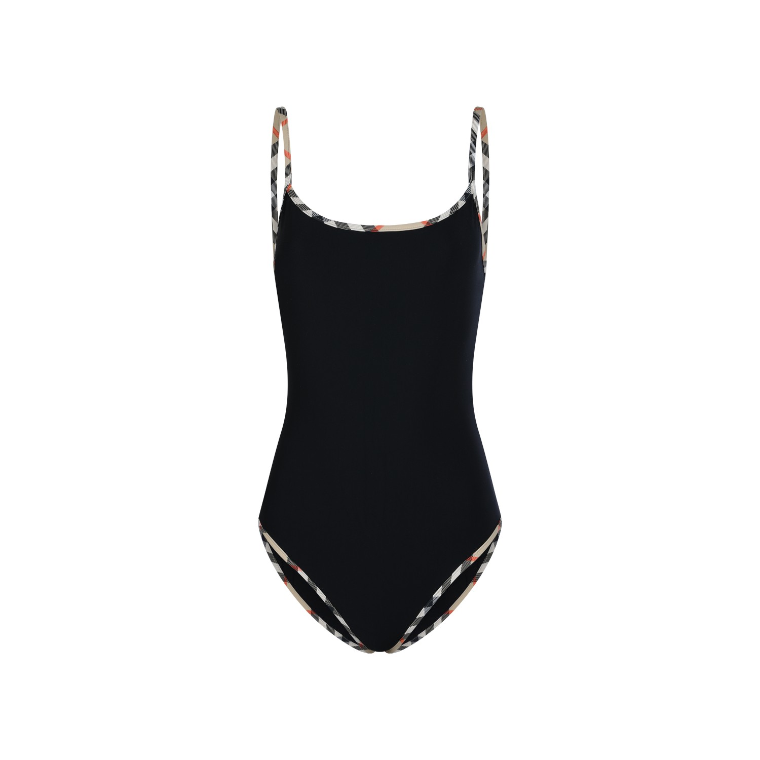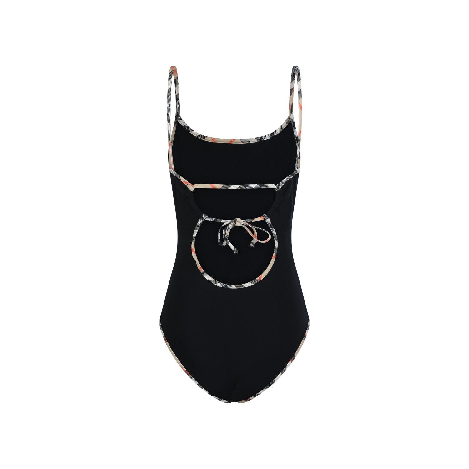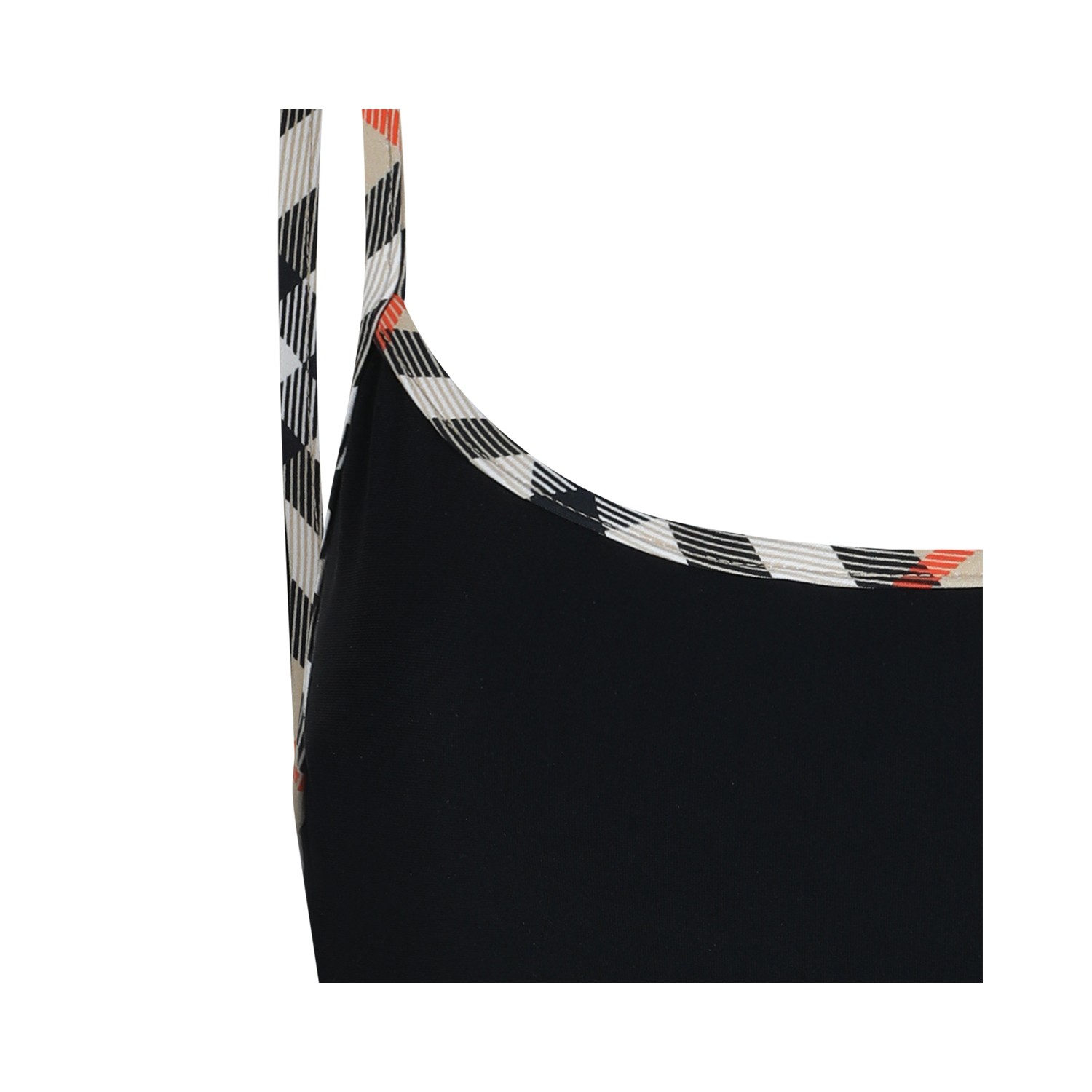 Black beachwear from Burberry featuring featuring round deep collar, sleeveless and iconic print details.