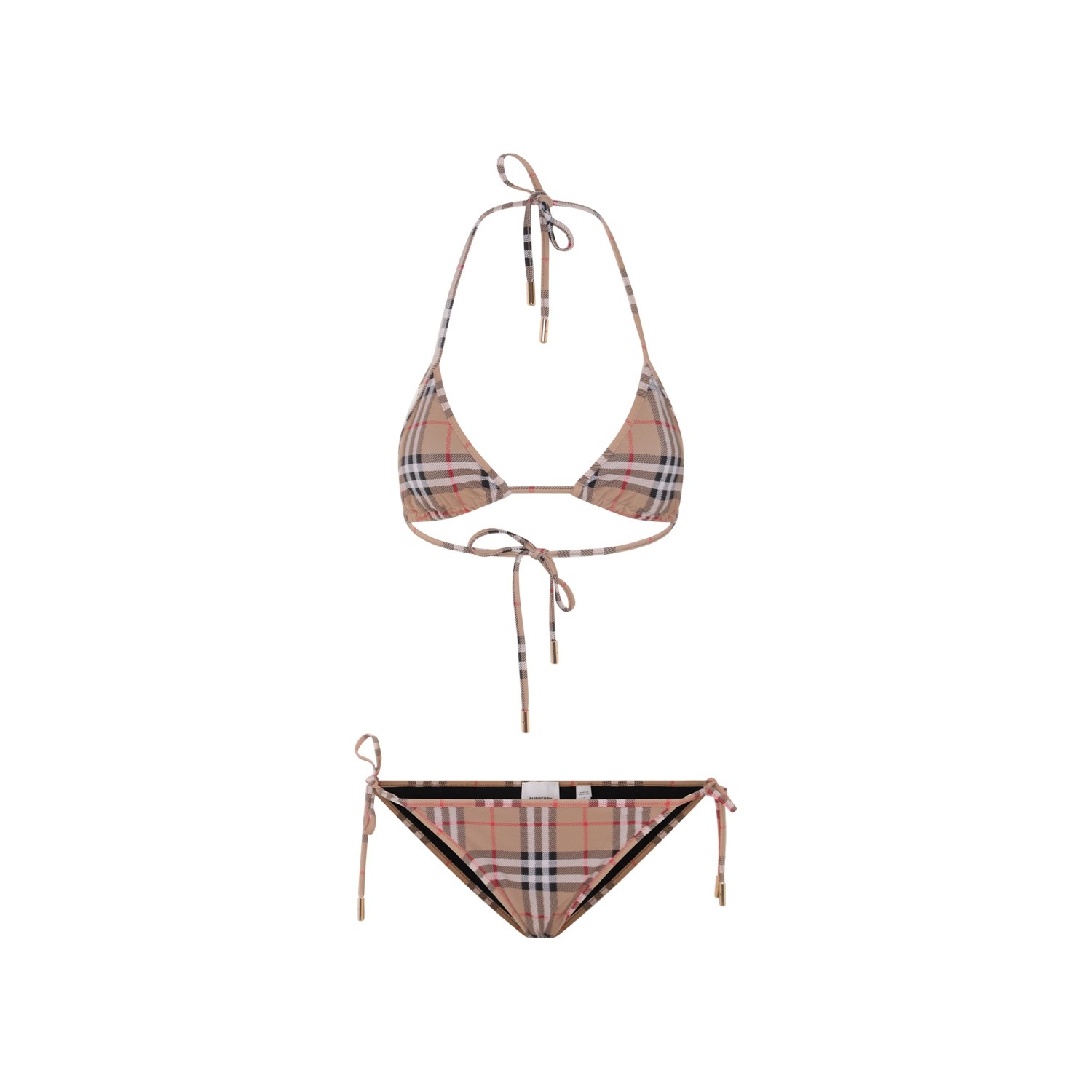 Arhcive Beige Ip Check bikini beachwear from Burberry featuring adjustable closure, low waist briefs, triangle adjustable bra and all over Check motif.