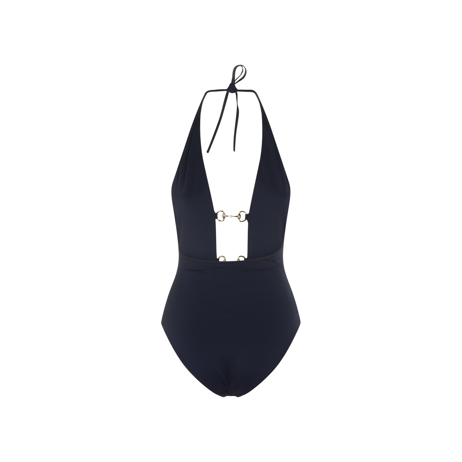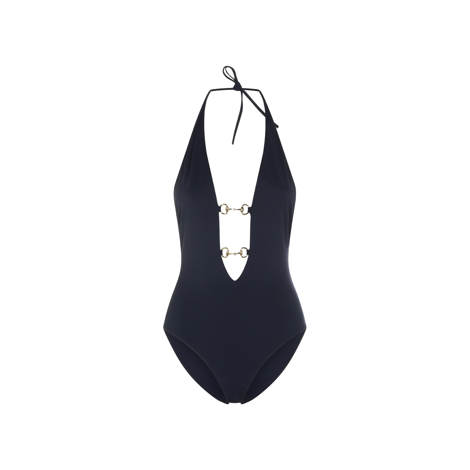 Navy swimsuit from Gucci featuring deep v neckline, laces closure on the neck, open back, horsebit details and elastic vestibility.