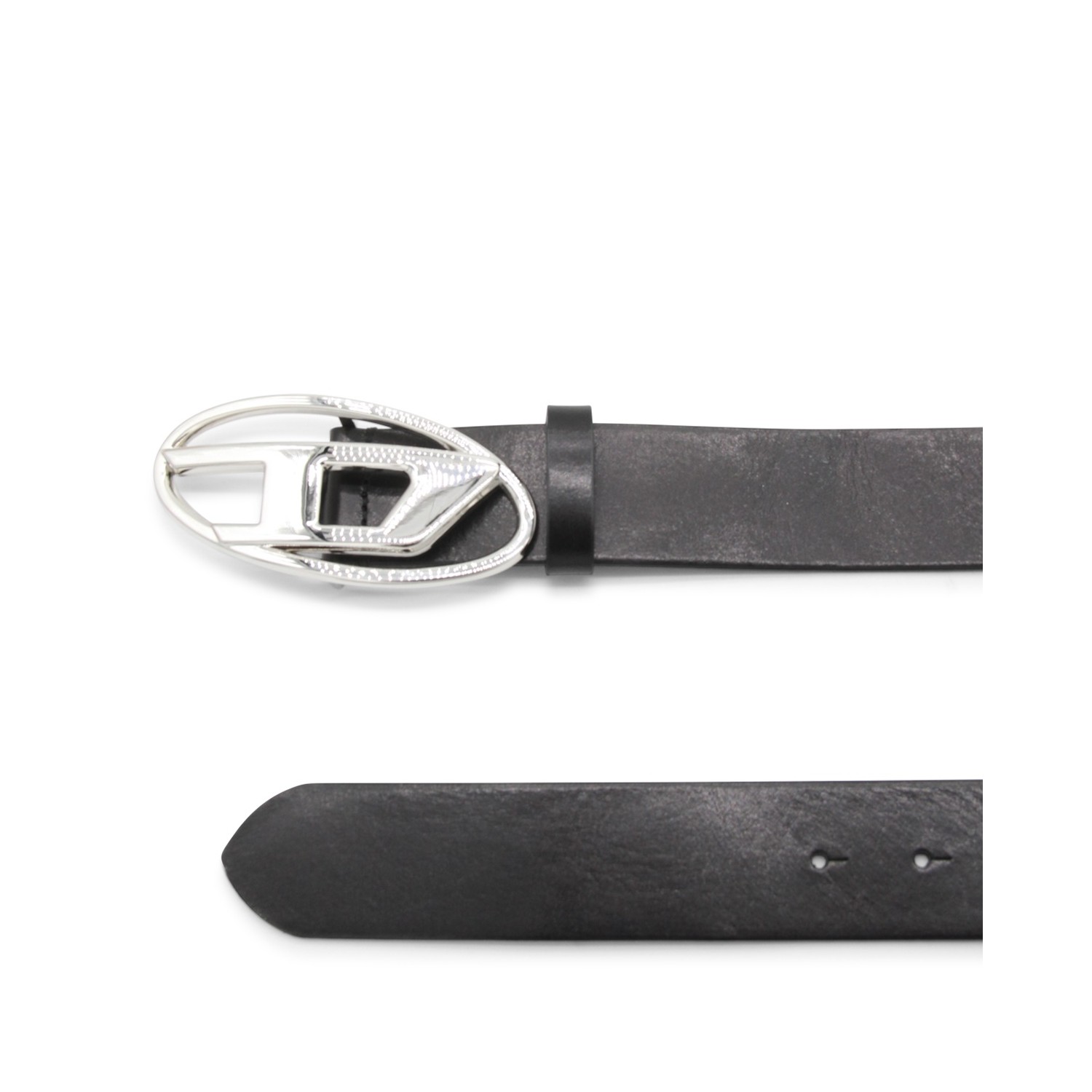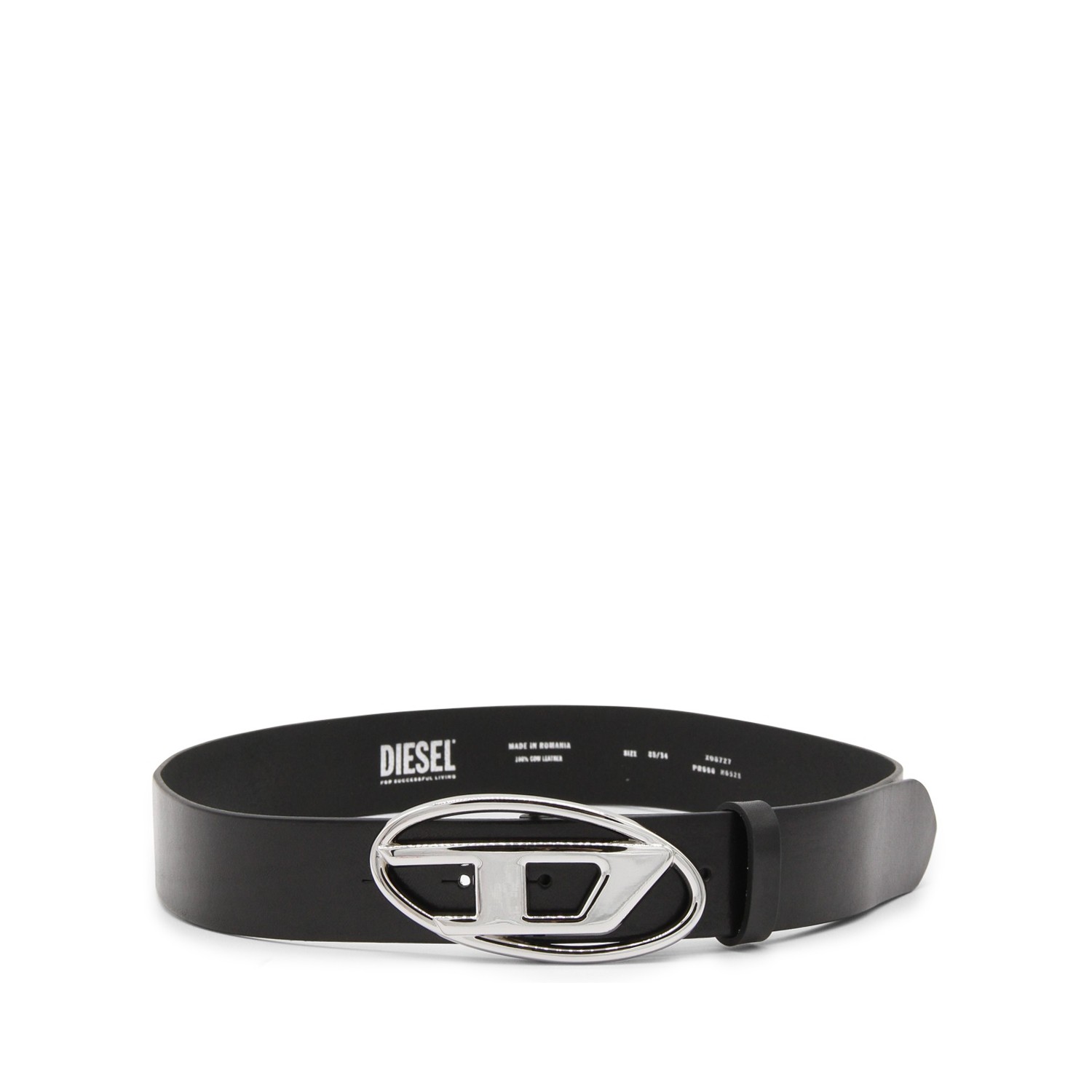 Black leather belt from Diesel featuring silver-tone hardware, front logo plaque buckle fastening, adustable fit and rounded tip.