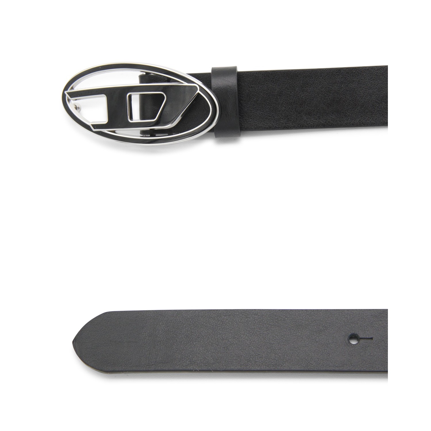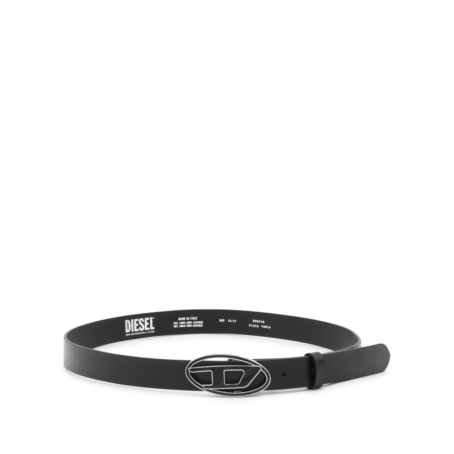 Black leather belt from Diesel featuring frontal logo fastening, silver tone details and inside logo.