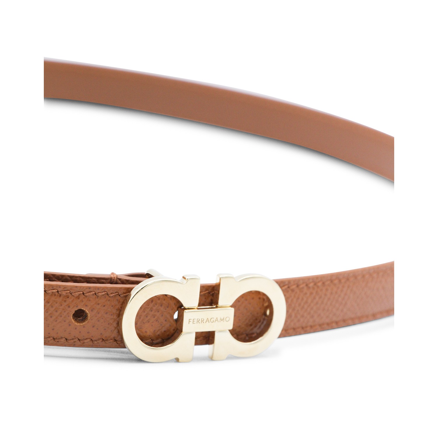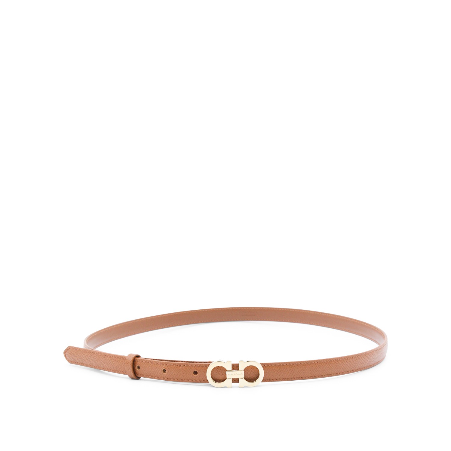 Brown leather Logo belt from Ferragamo featuring gold tone logo plaque at front, adjustable closure and mid height.