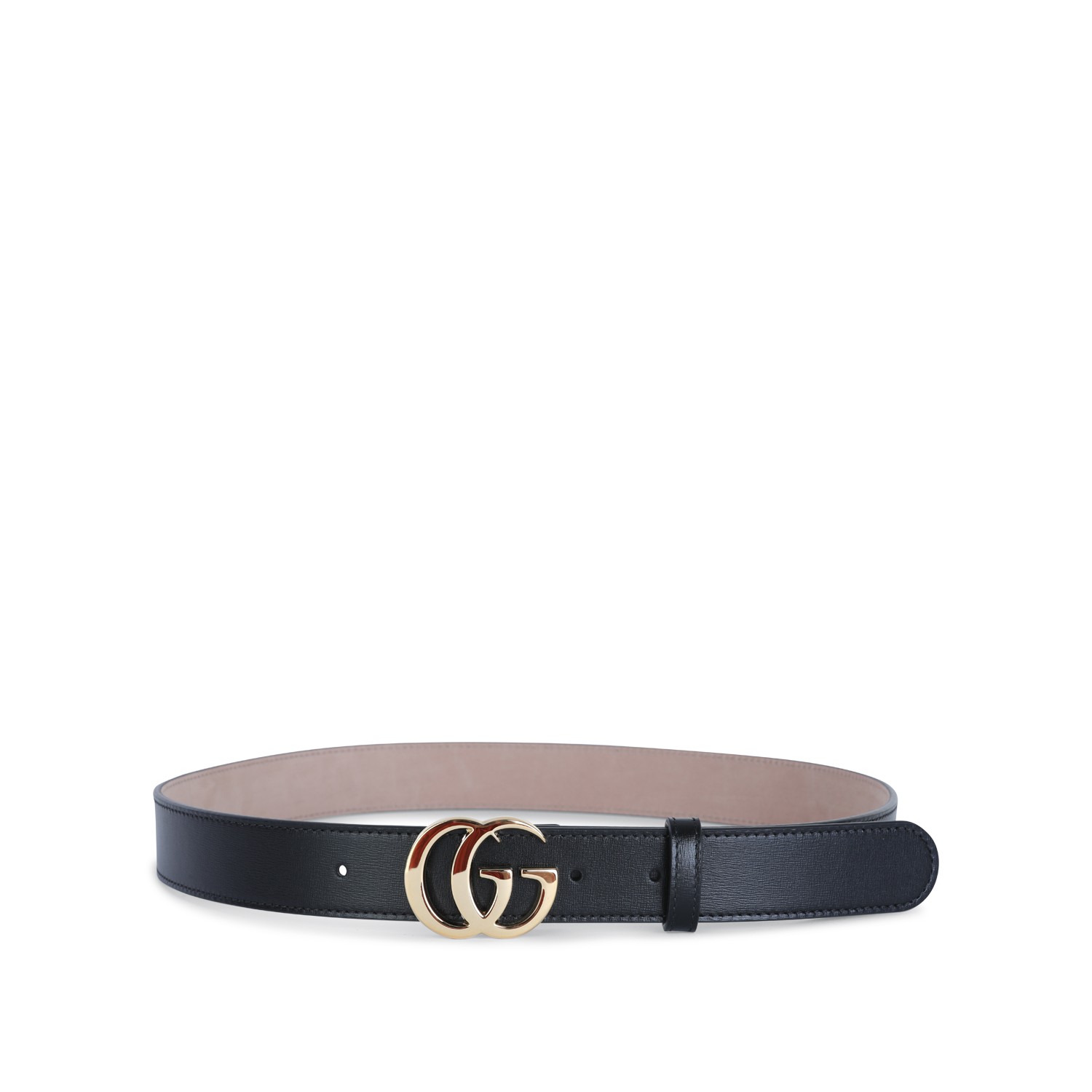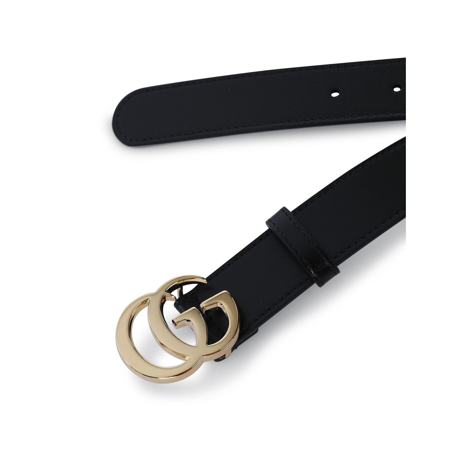 Black leather belt from Gucci featuring adjustable size and gold tone logo hardware.