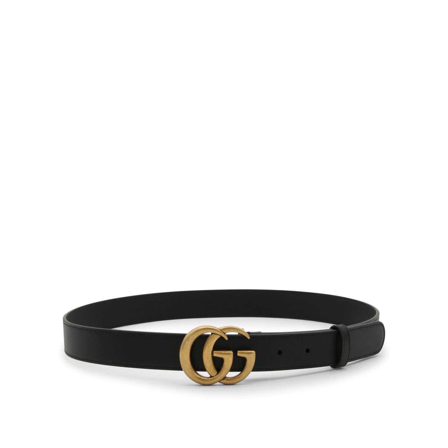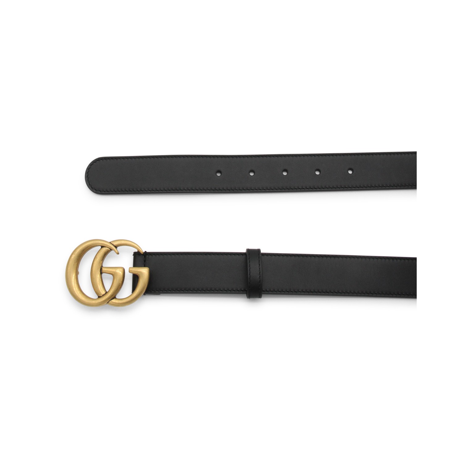 Black leather GG belt from Gucci featuring logo buckle fastening, adjustable fit and gold-tone hardware.