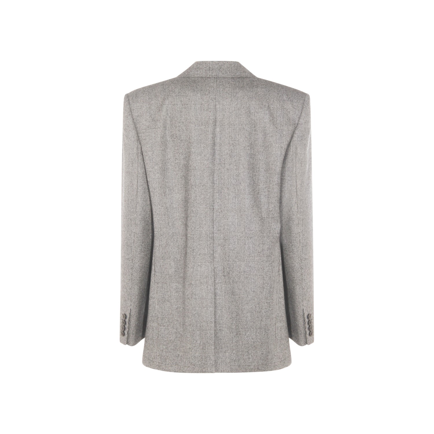 Grey wool blazer from Saint Laurent featuring lapel collar, long sleeves, frontal button fastening, curved hem and regular vestibility.