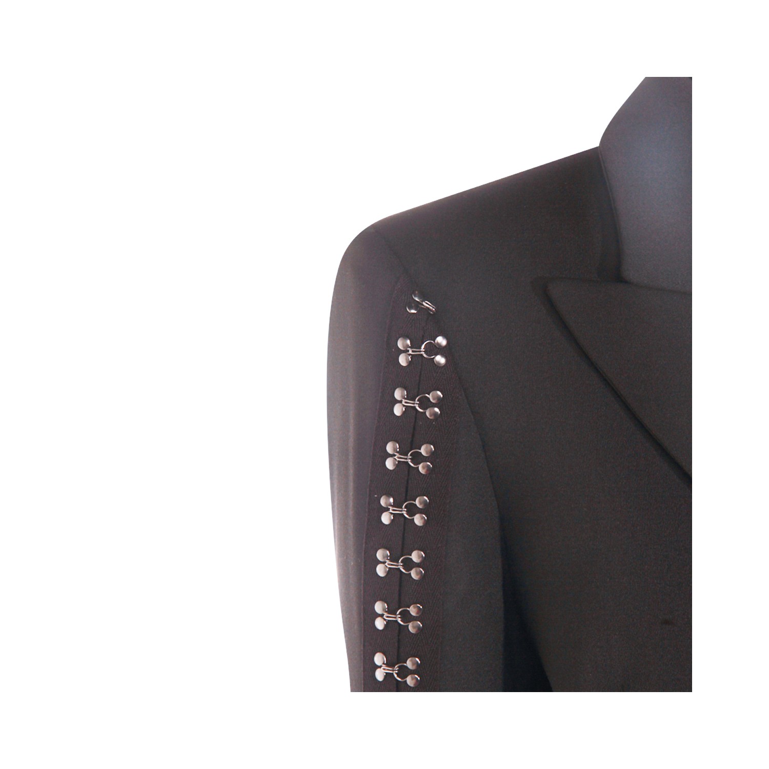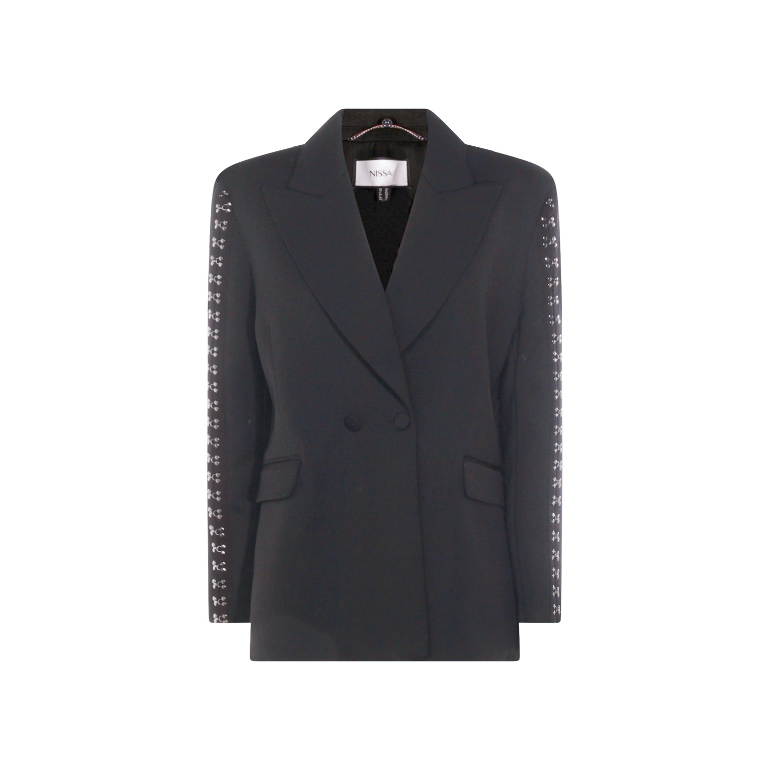 Black blazer from Nissa featuring lapel collar, long sleeves, frontal button fastening, shoulder pads and details.