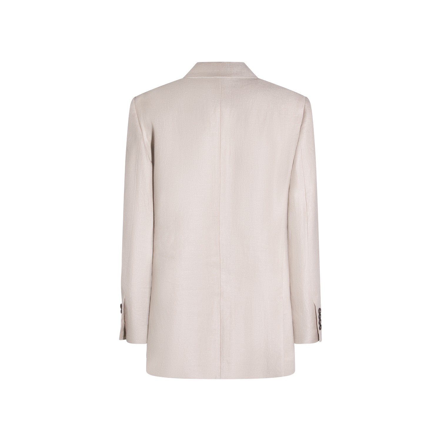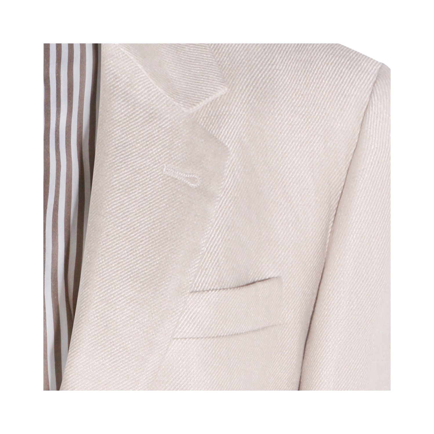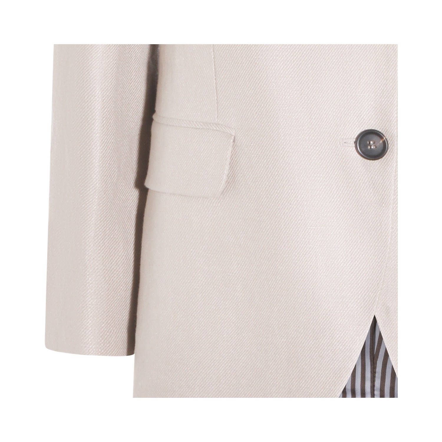 Light beige linen blazer from Brunello Cucinelli featuring lapel collar, long sleeves, frontal buttons fastening, curved hem and regular vestibility.