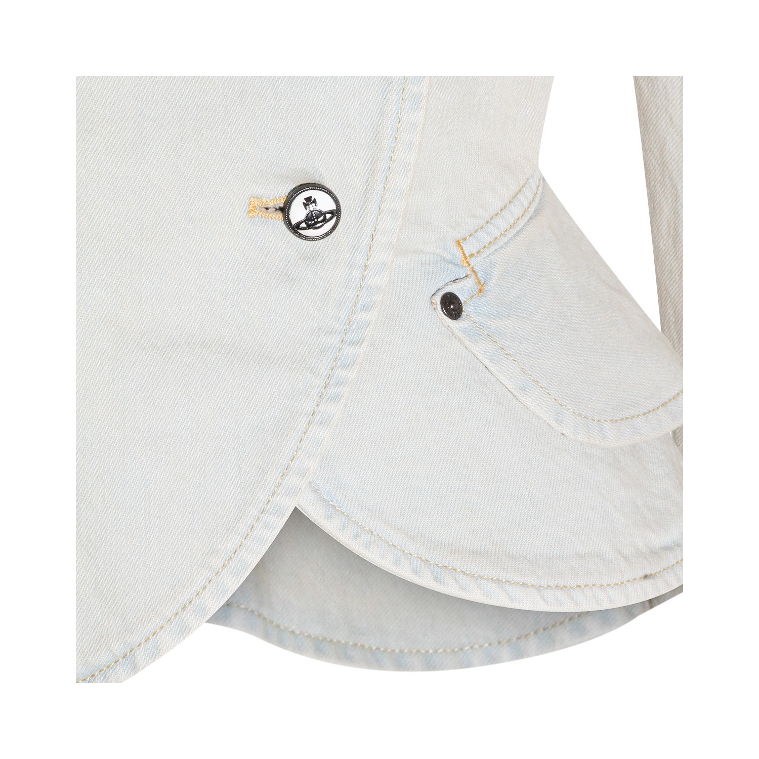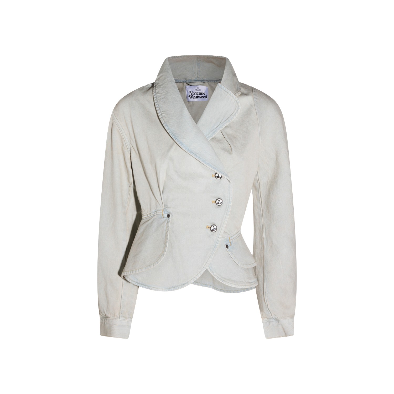 Light grey cotton blazer from Vivienne Westwood featuring long sleeves, double breasted fastening with buttons and pockets.