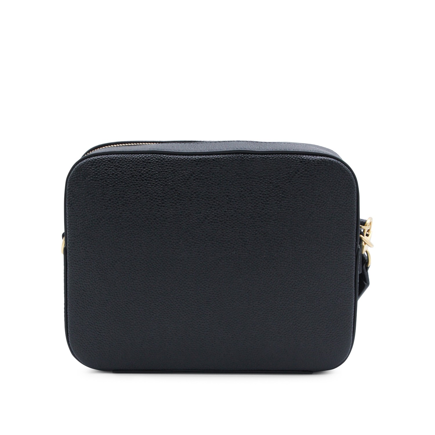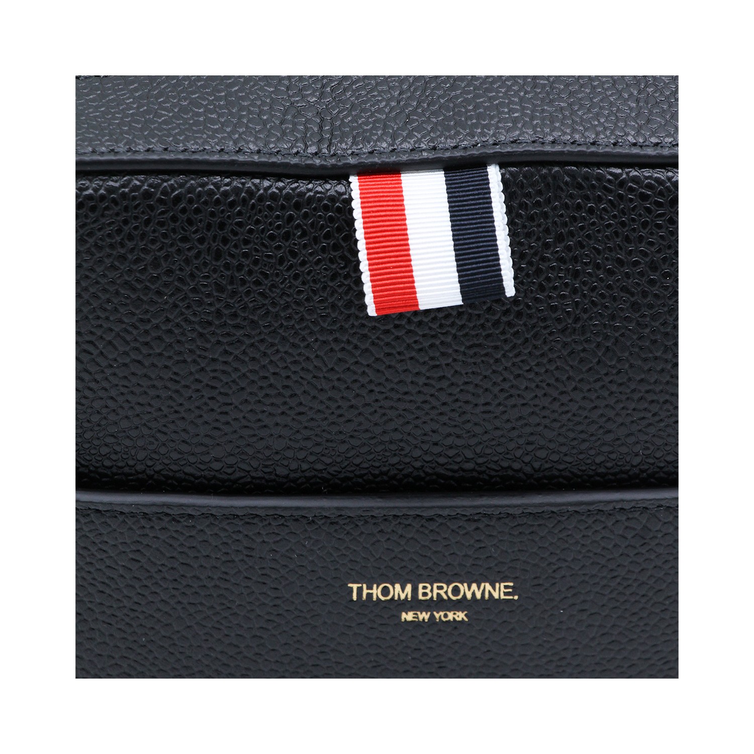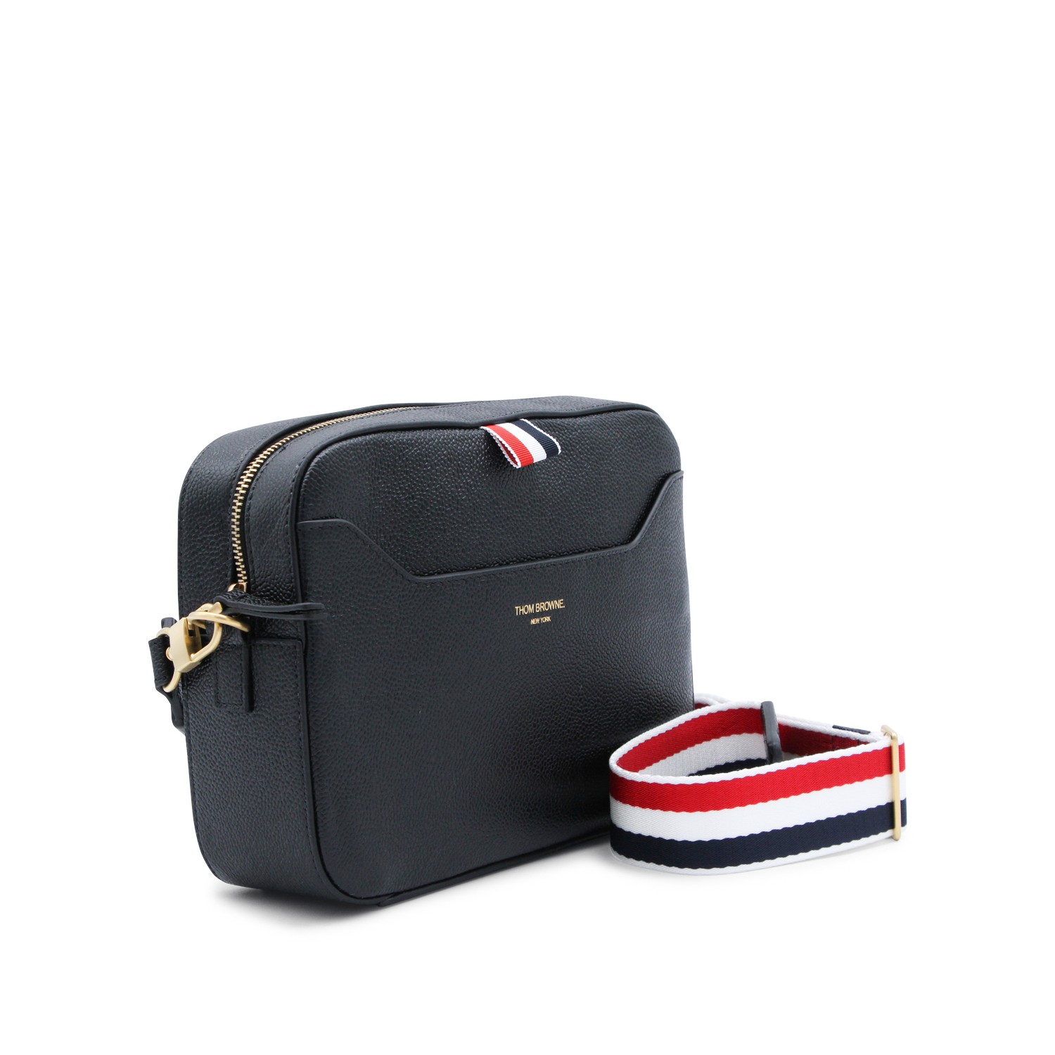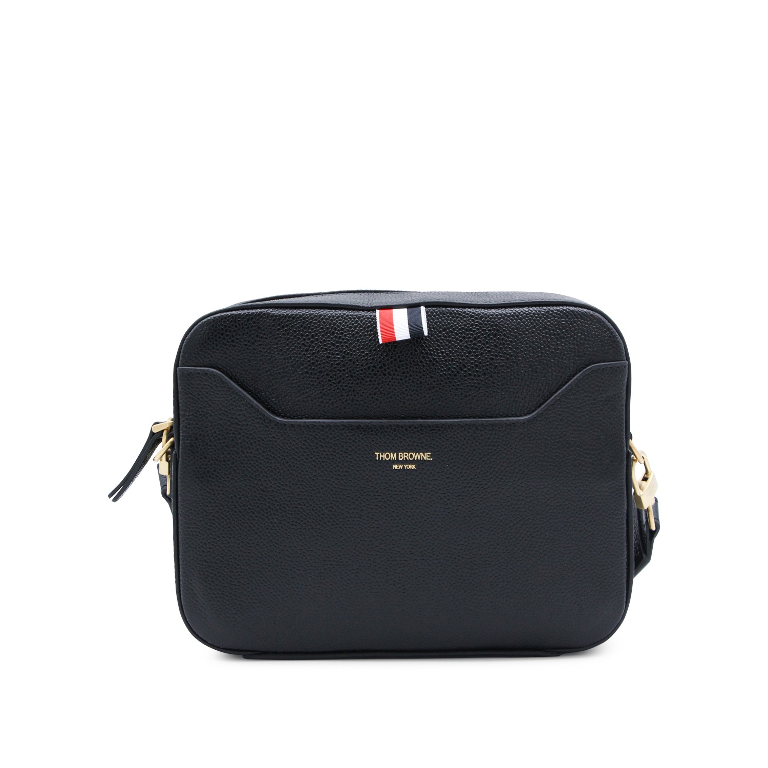 Black crossbody bag from Thom Browne featuring rectangular shape, adjsutable shoulder strap, frontal logo print, zip closure and main compartment.
