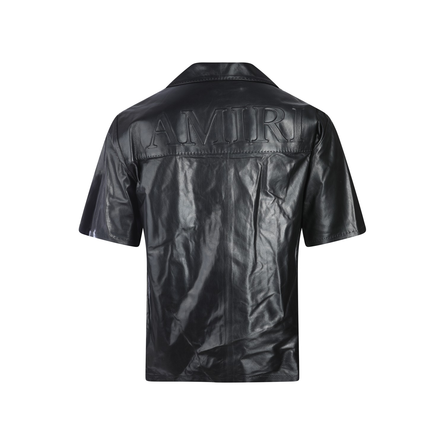 Black leather jacket from Amiri featuring classic collar, short sleeves, frontal buttons fastening and regular vestibility.