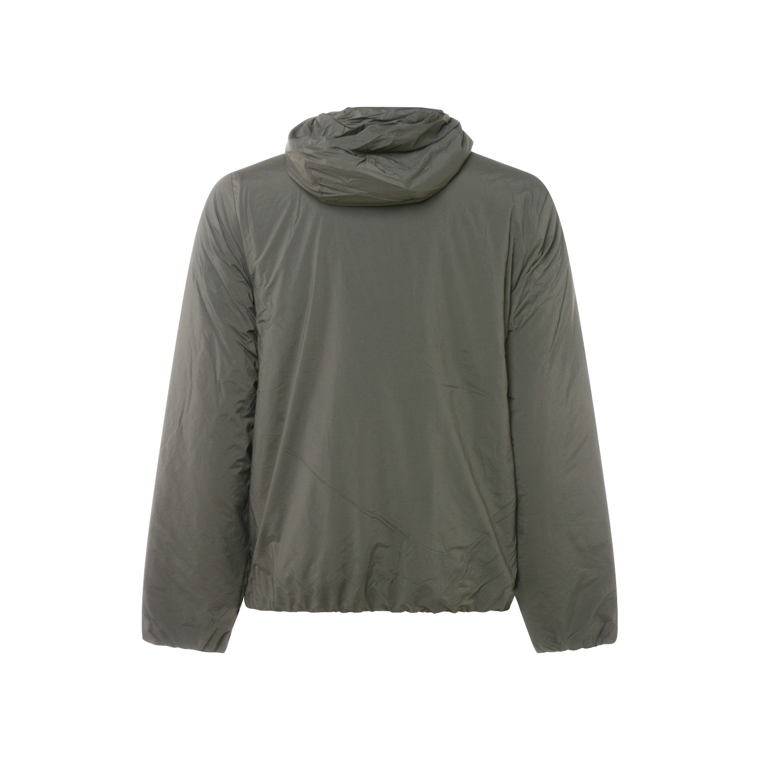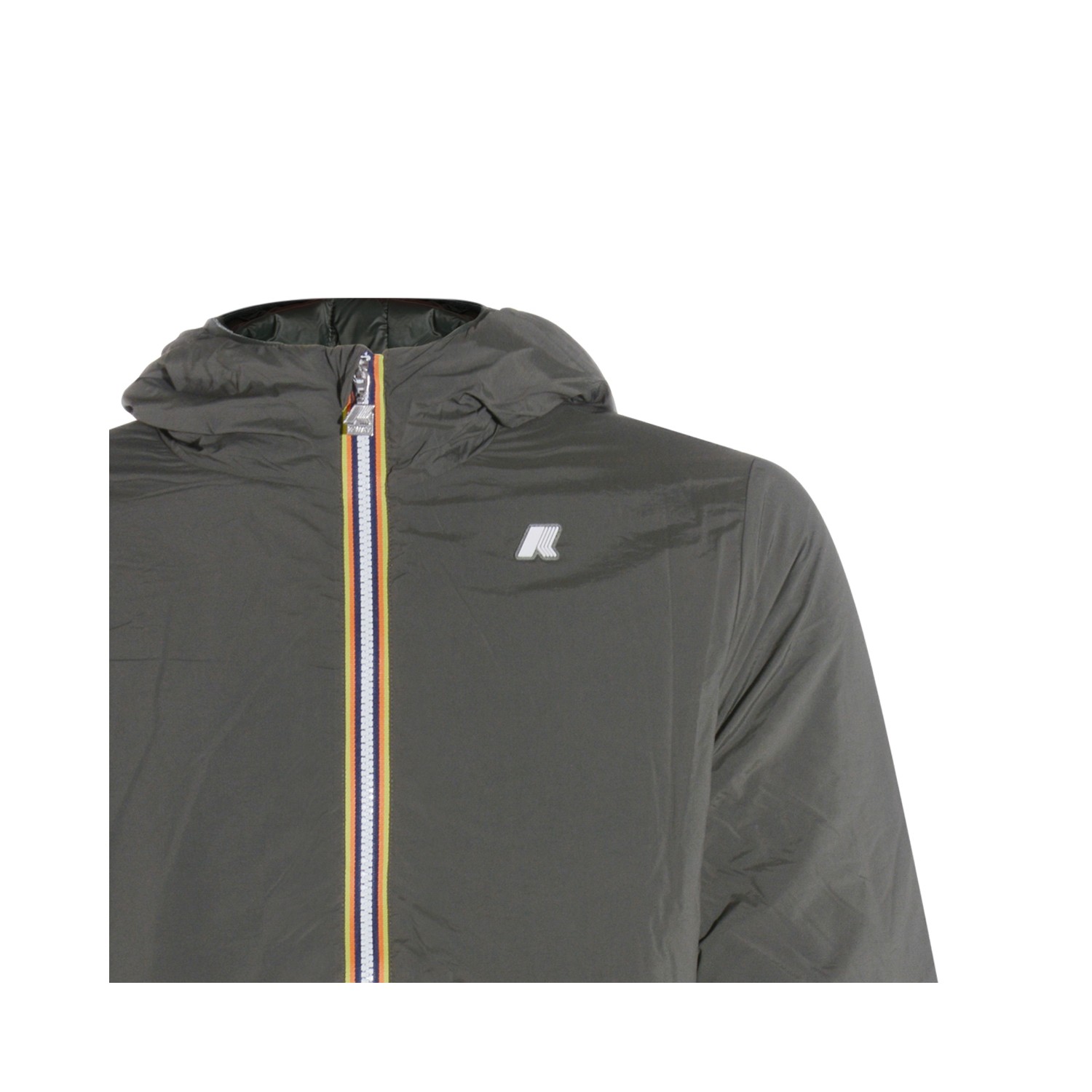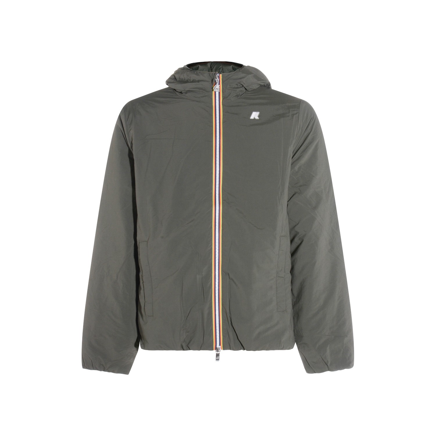 Green Jack plain casual jacket from K-Way featuring high collar, hood, zip fastening and logo detail.