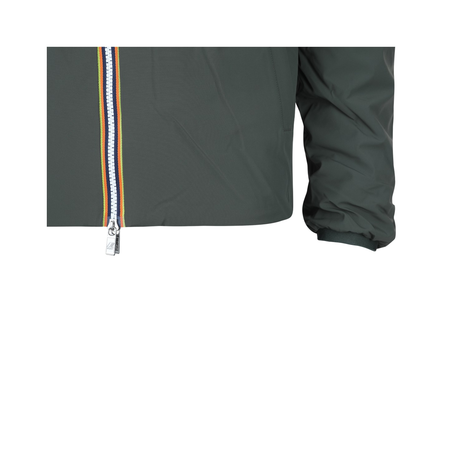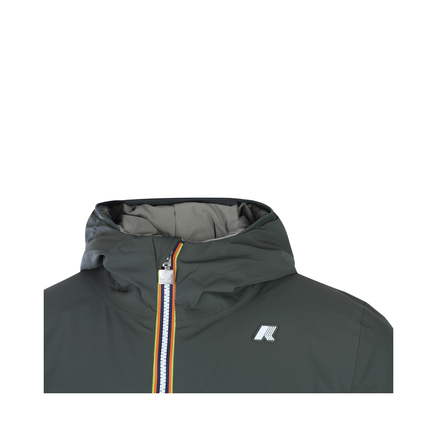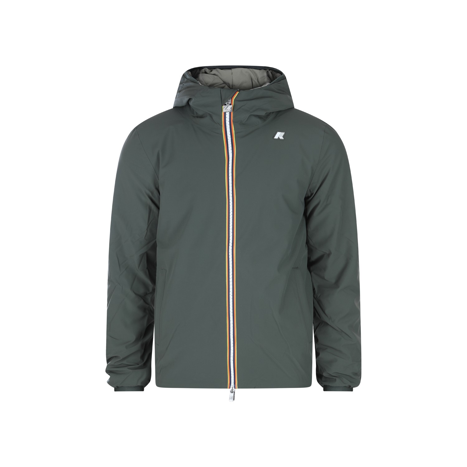 Green nylon Jack casual jacket from K-Way featuring high collar, hood, long sleeves, padded, zip fastening, heart logo patch and regular vestibility.