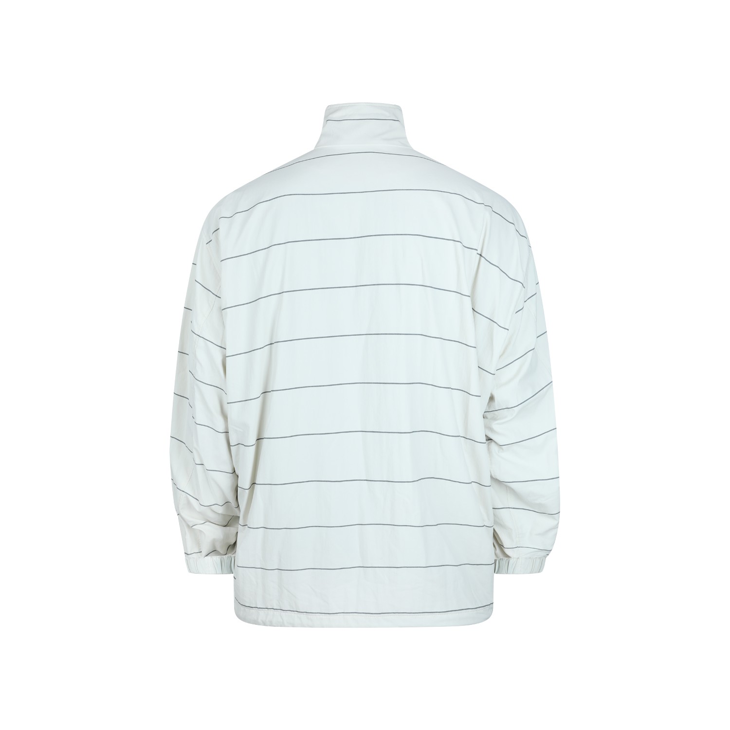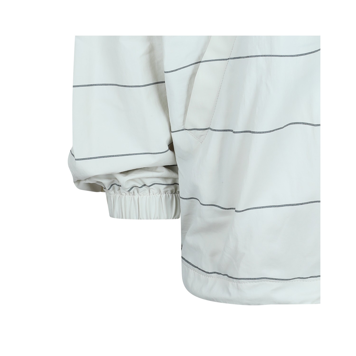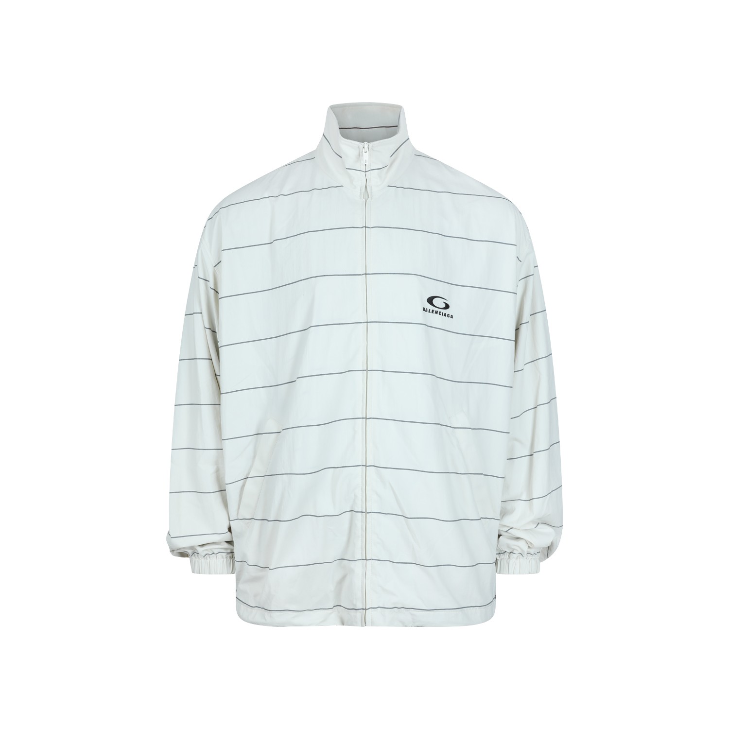 Dirty white casual jacket from Balenciaga featuring high collar, long sleeves, pockets, logo and loose vestibility.