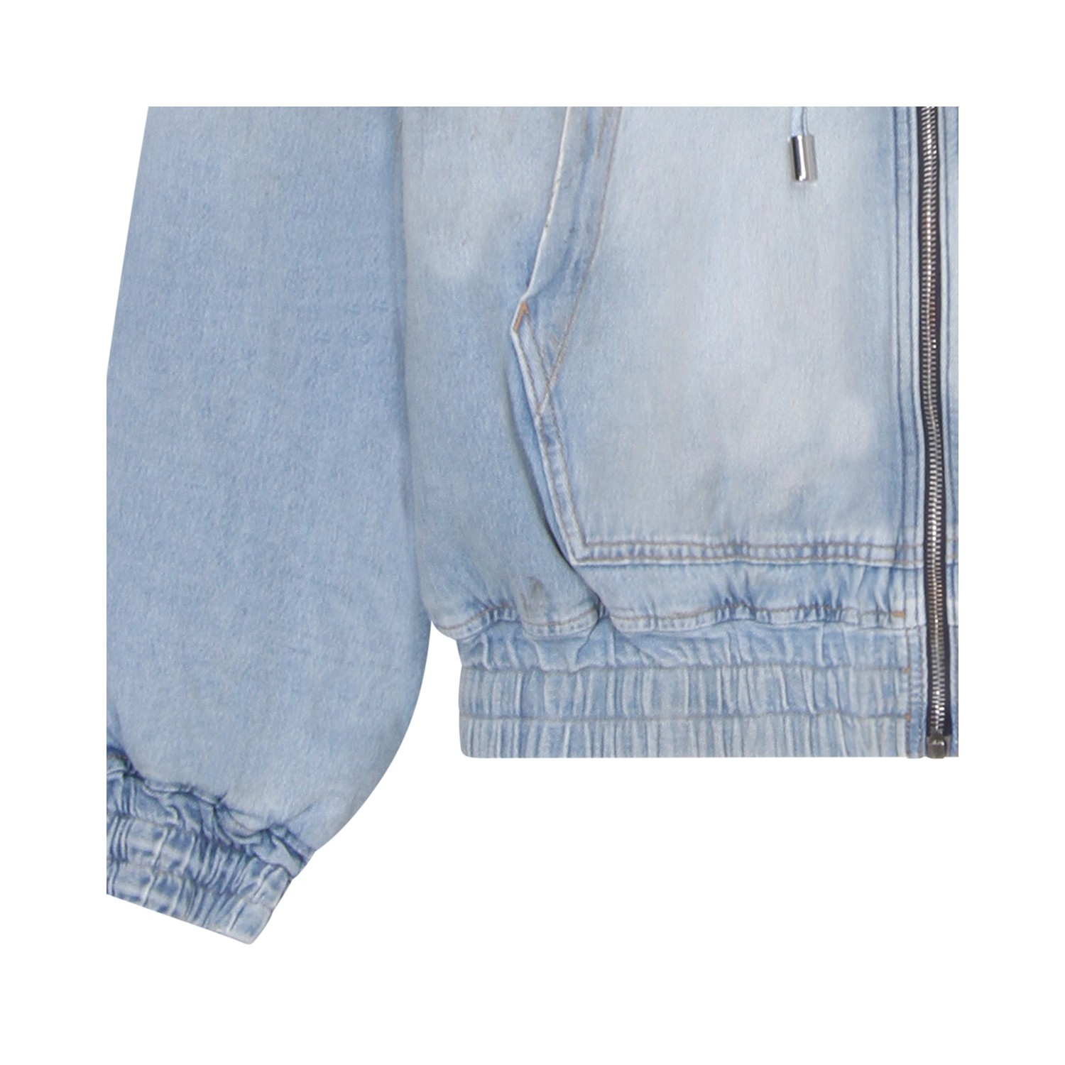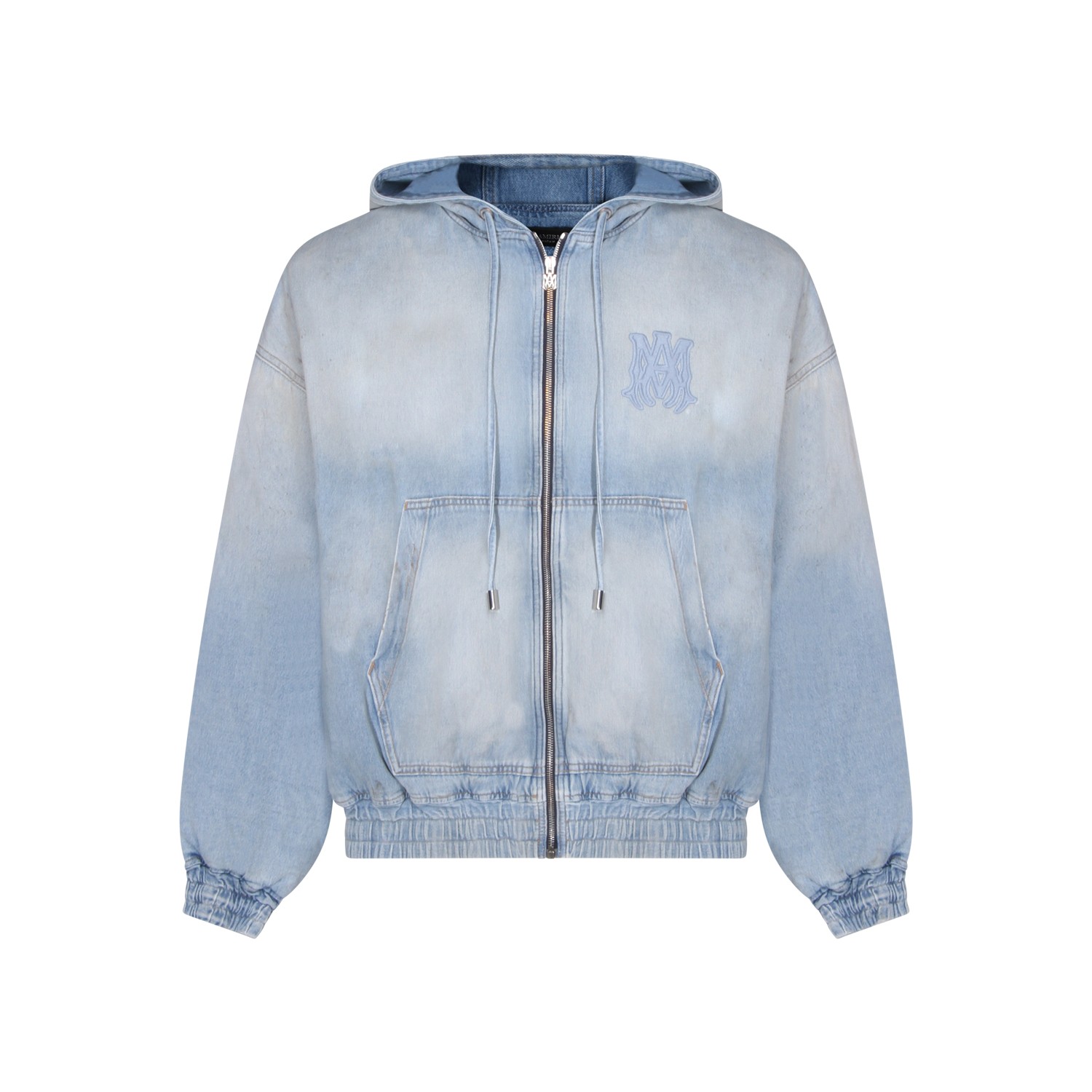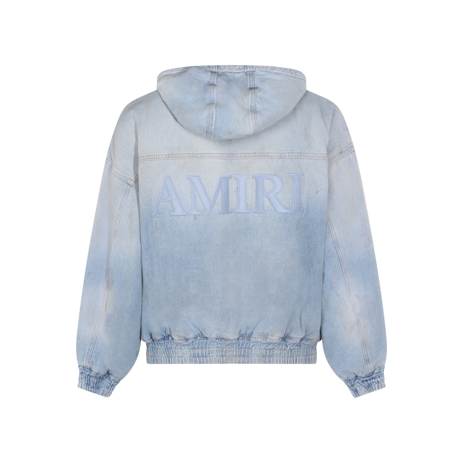 Ligth blue cotton denim jacket from Amiri featuring long sleeves, zip fastening, hood, ribbed cuffs and hem and regular vestibility.