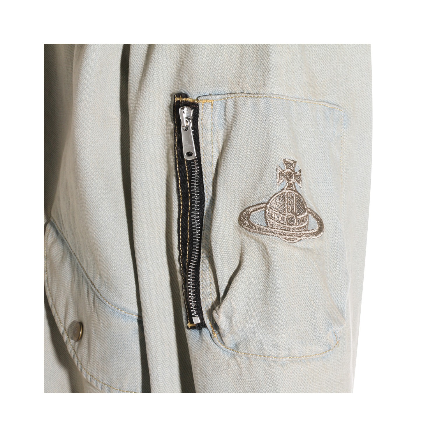 Light blue and beige cotton denim jacket from Vivienne Westwood featuring long sleeves, zip fastening, elasticated cuffs and hem, buttoned pockets and regular vestibility.