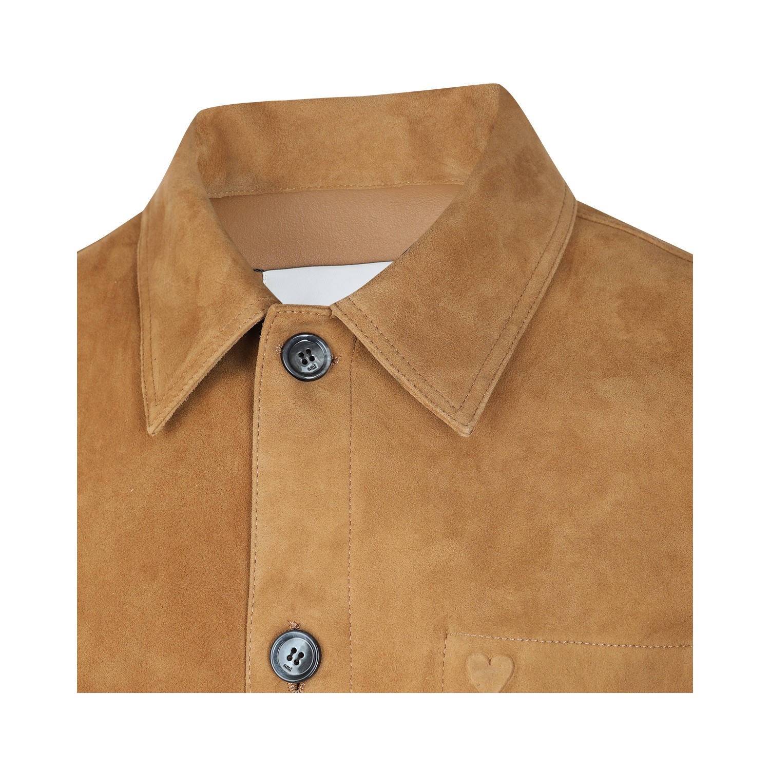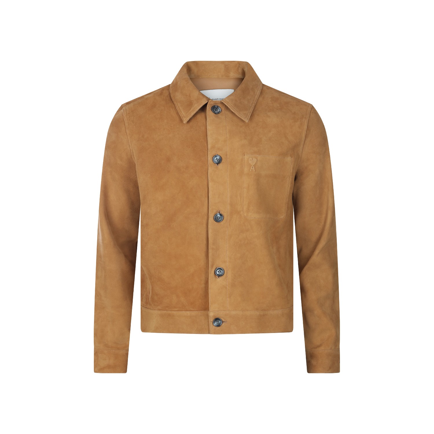 Caramel leather jacket from Ami Paris featuring classic collar, long sleeves, buttons fastening, chest pocket and regular vestibility.