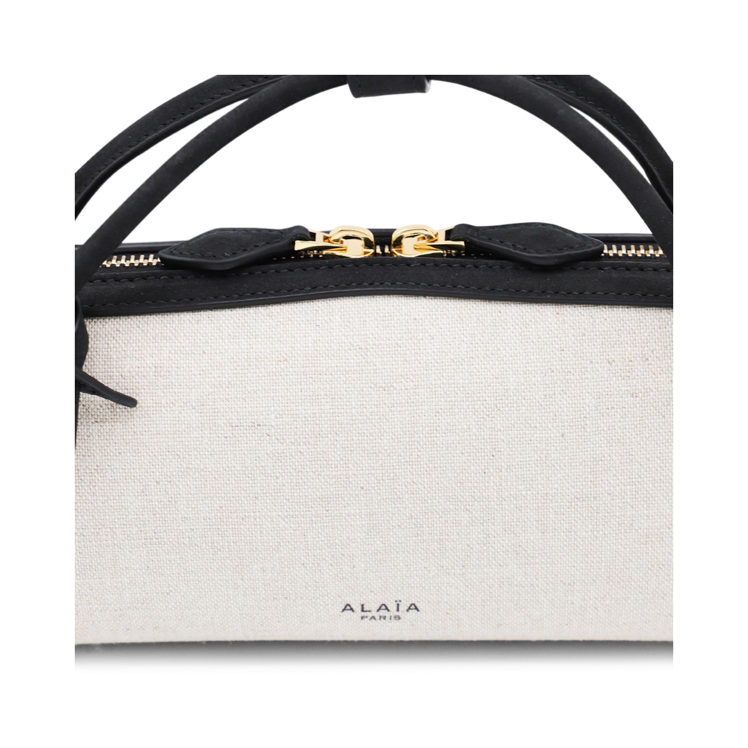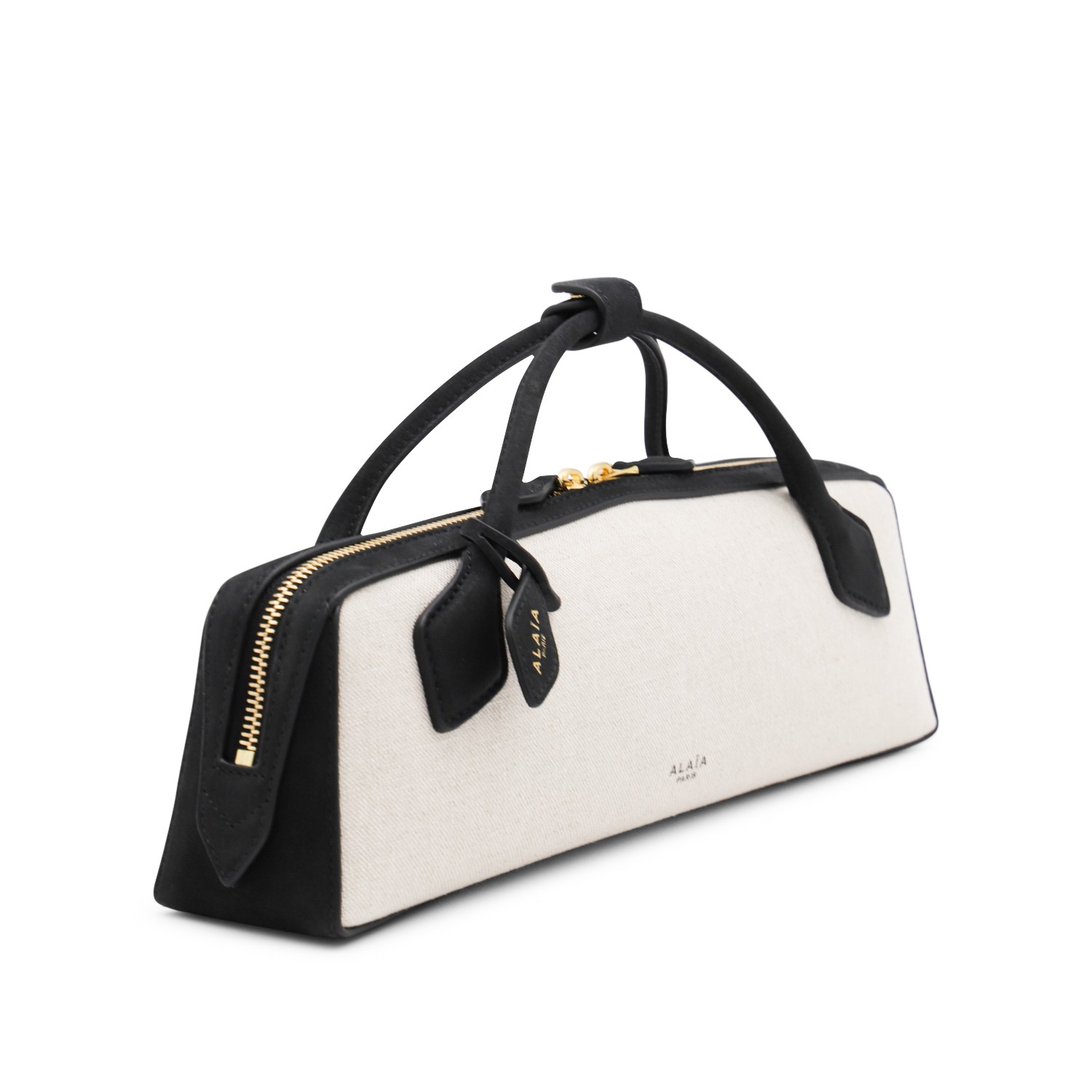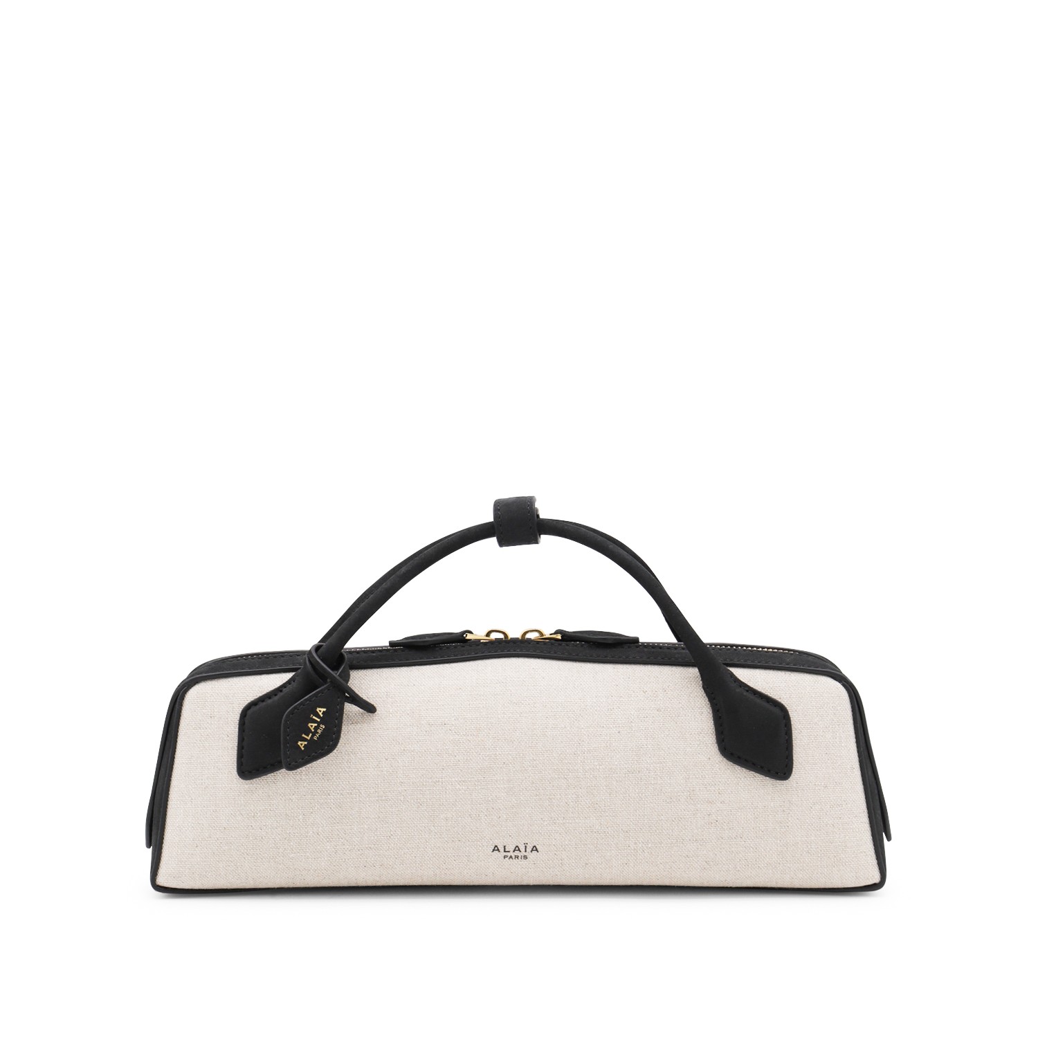 Beige and black leather Le Teckel clutch from Alaia featuring rectangular shape, top handles, double zip fastening, frontal logo, small mirror pendant, main compartment and internal pocket.