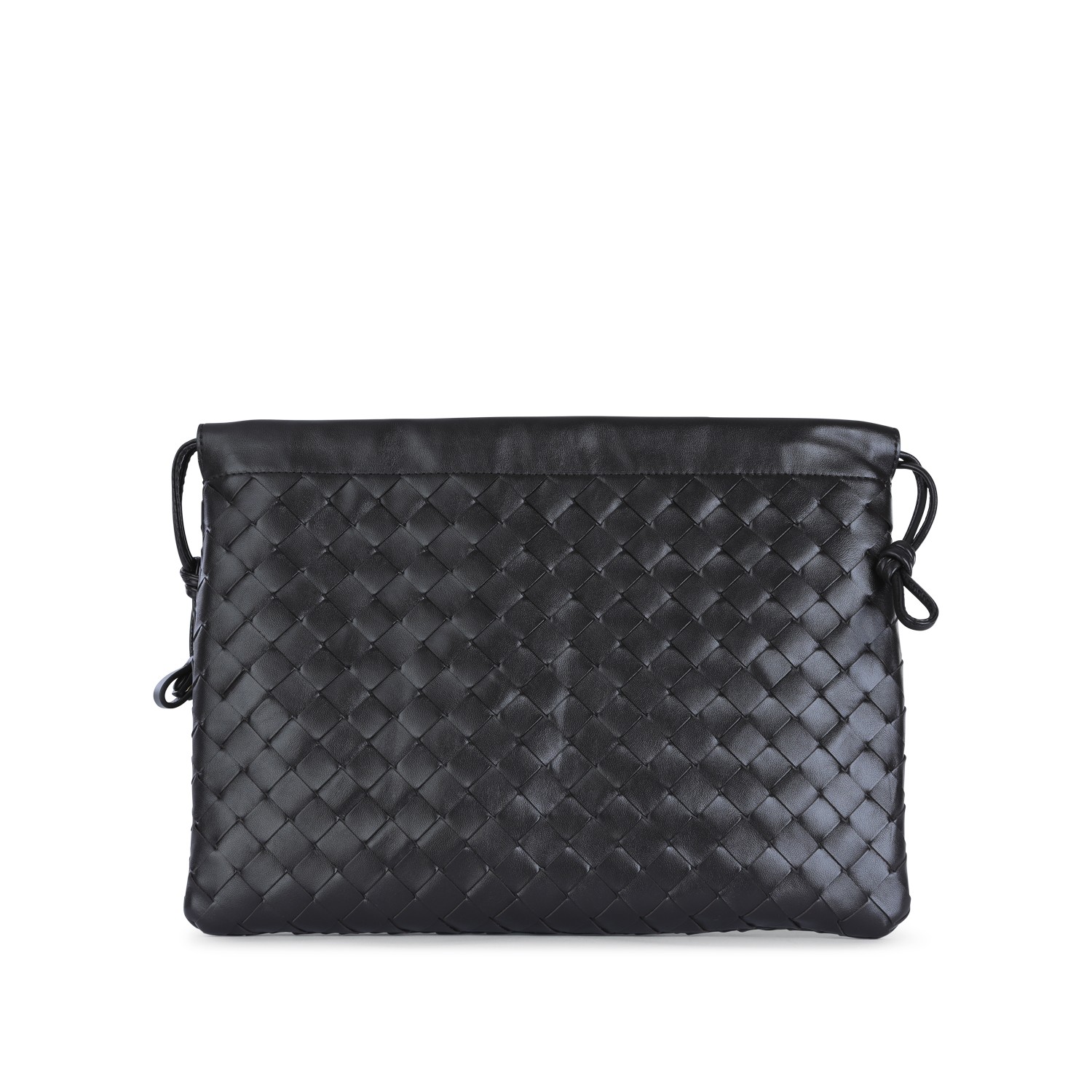 Dark brown leather pouch from Bottega Veneta featuring rectangular shape, all-over Intreccio motif, drawstring closure and main comparment.