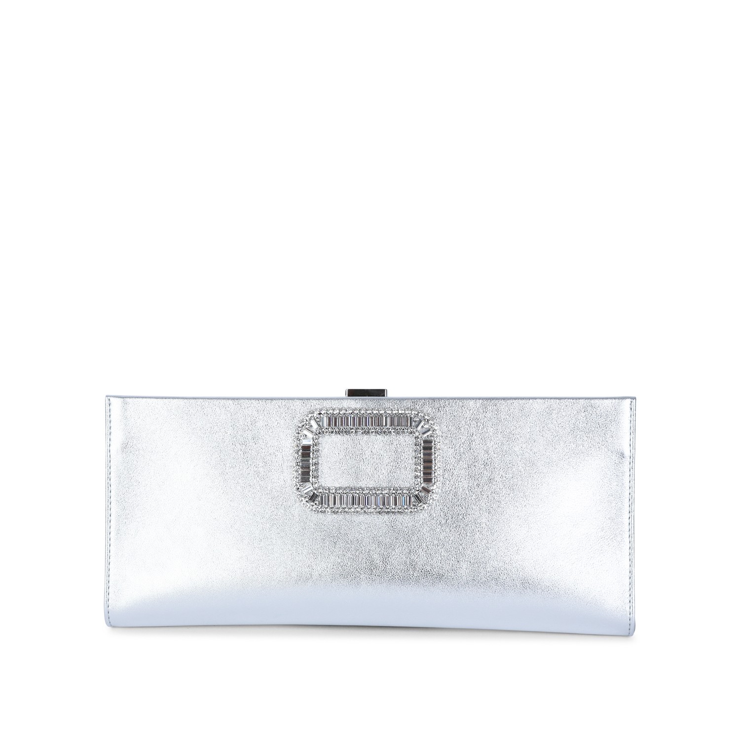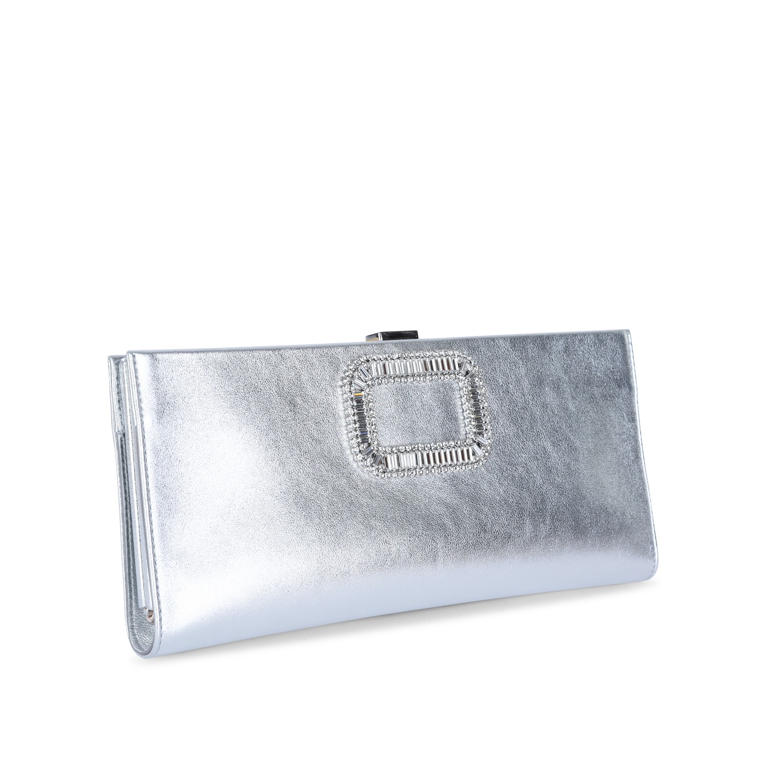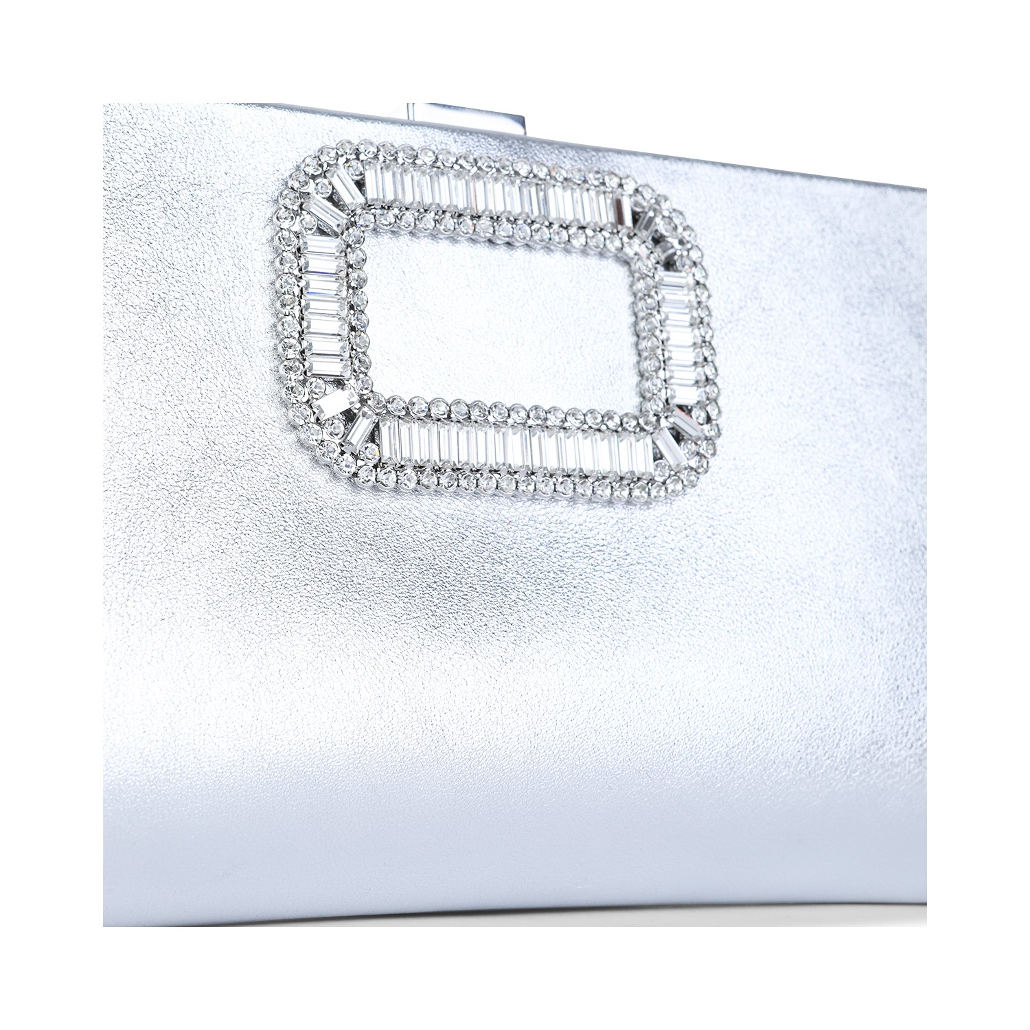 Silver leather clutch from Roger Vivier featuring rectangular shape, crystal buckle, snap closure, satin effect and main compartment.
