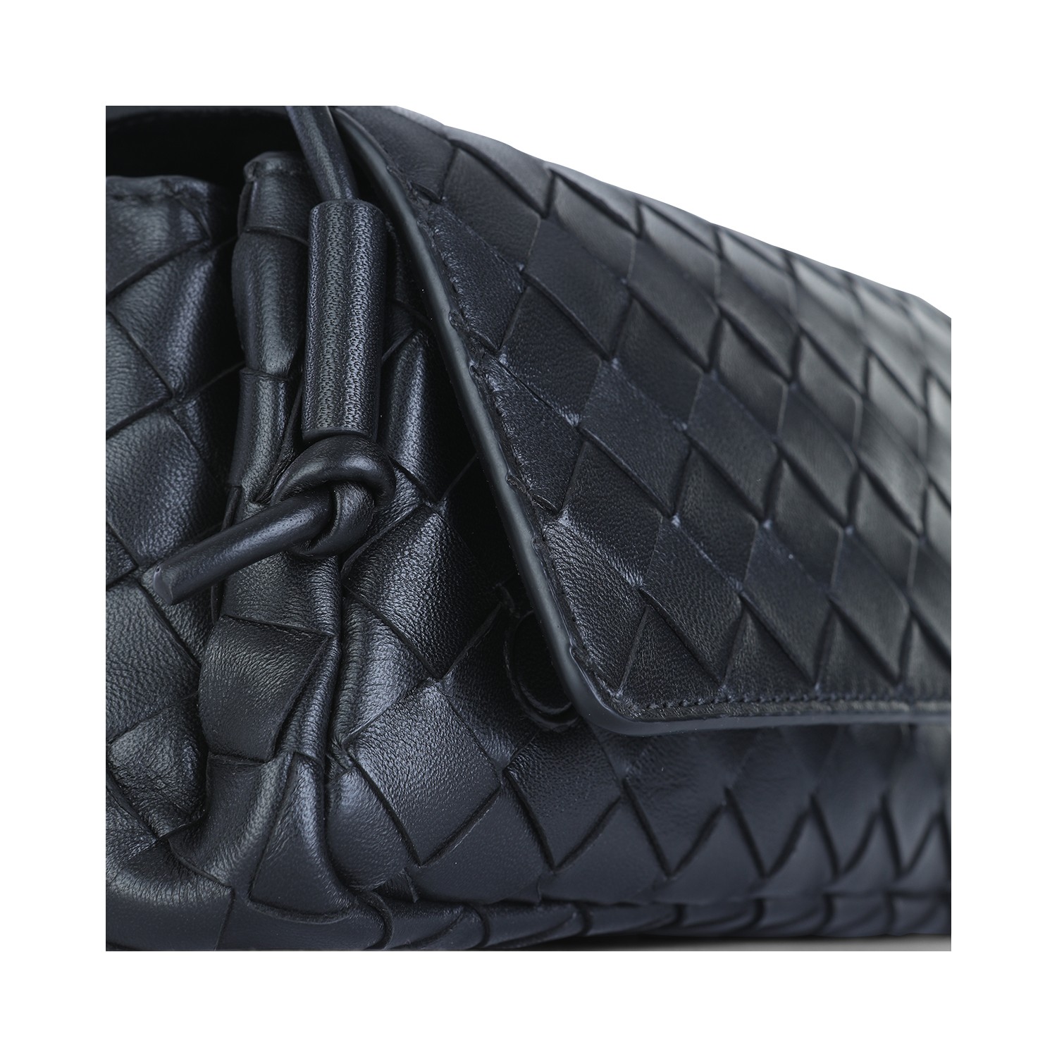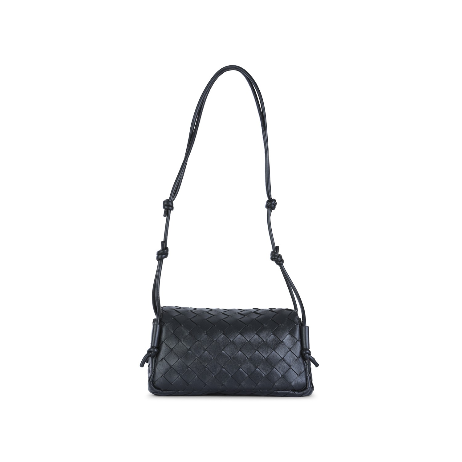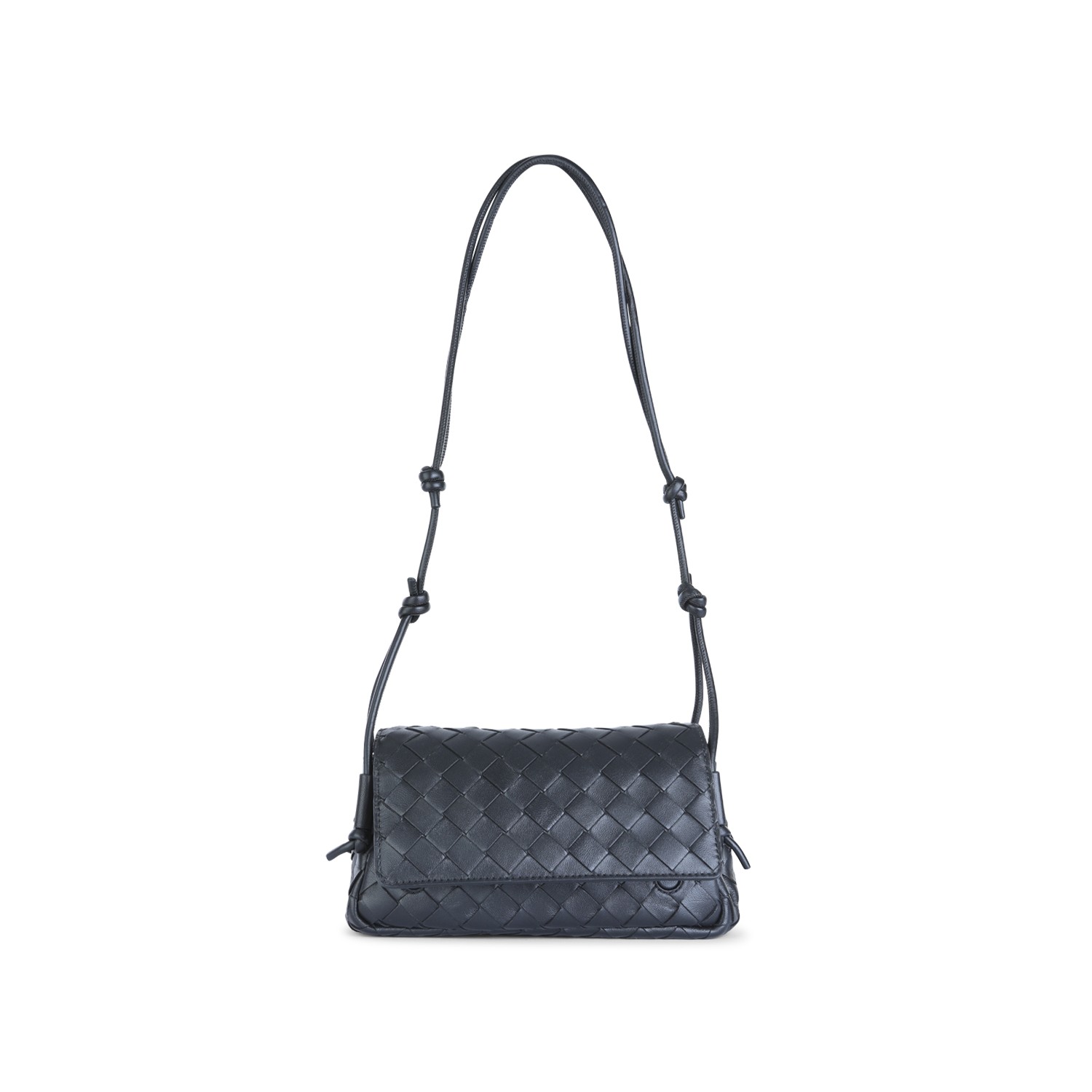 Black leather Notturno pouch from Bottega Veneta featuring all-over Intreccio motif, adjustable shoulder strap, magnetic flap closure, compartments and internal zip pocket.