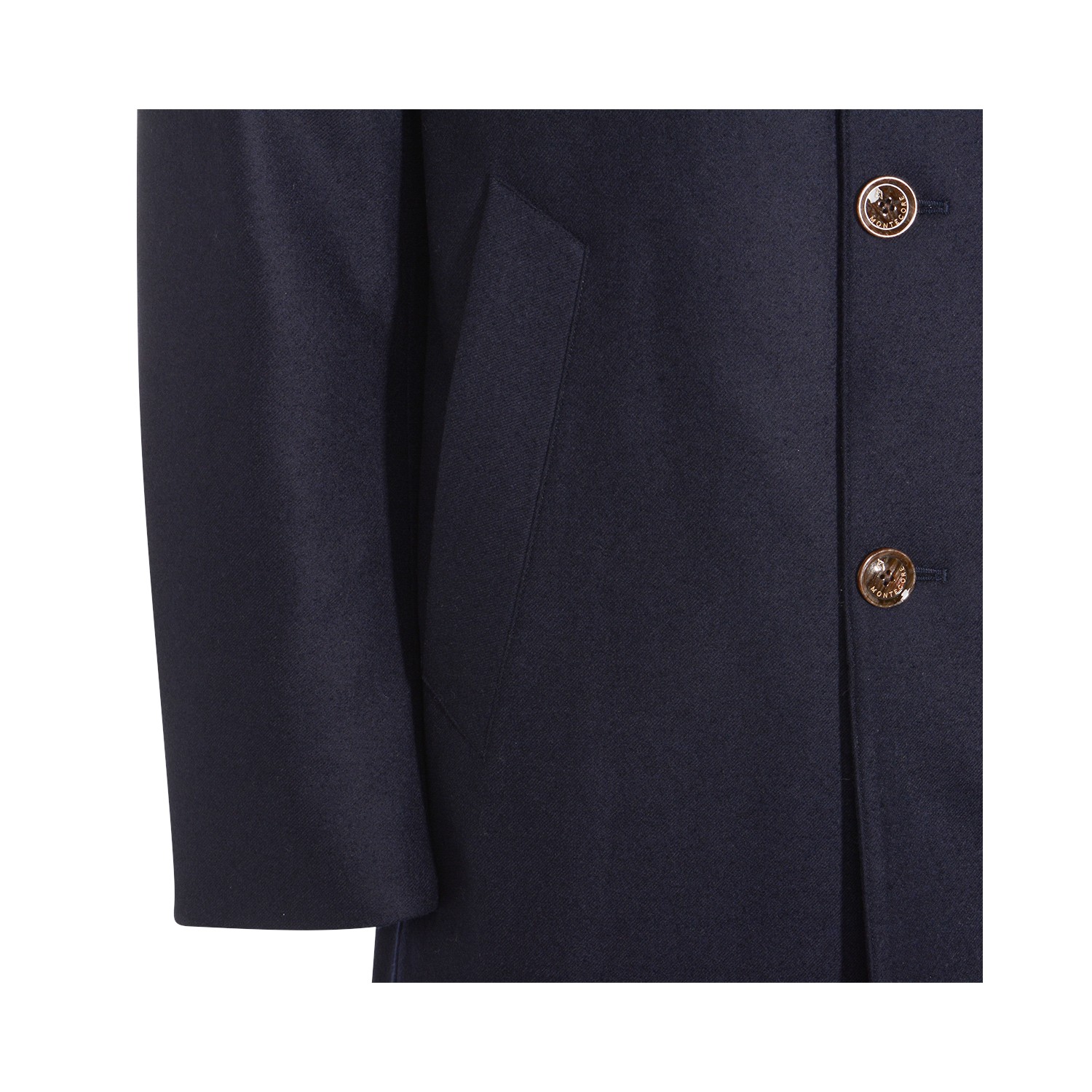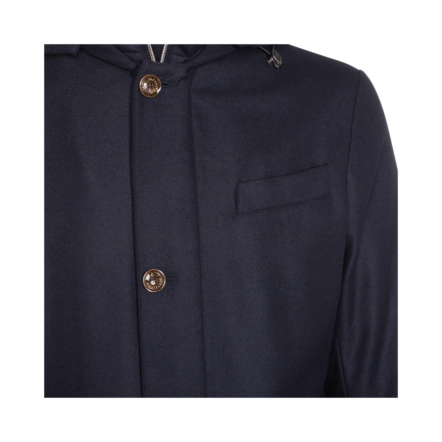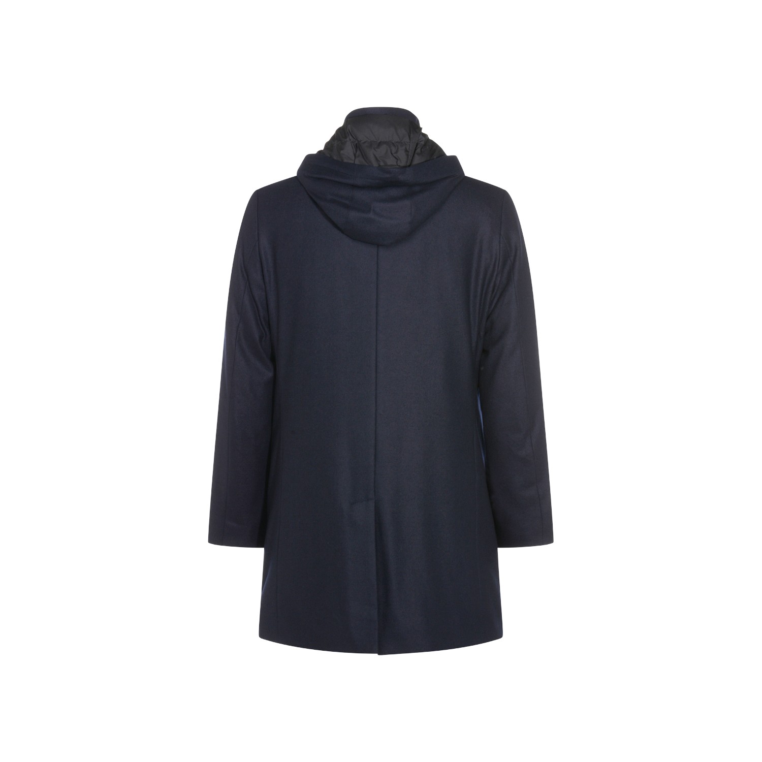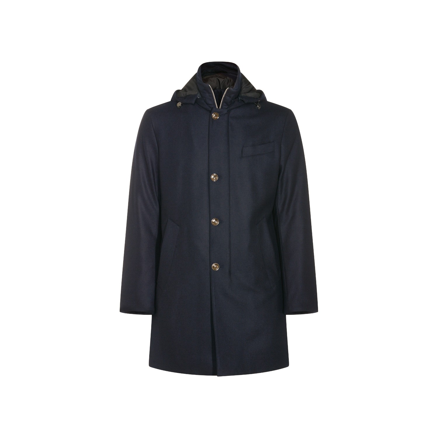 Blue wool coat from Montecore featuring high collar, hood, long sleeves, frontal fastening and regular vestibility.