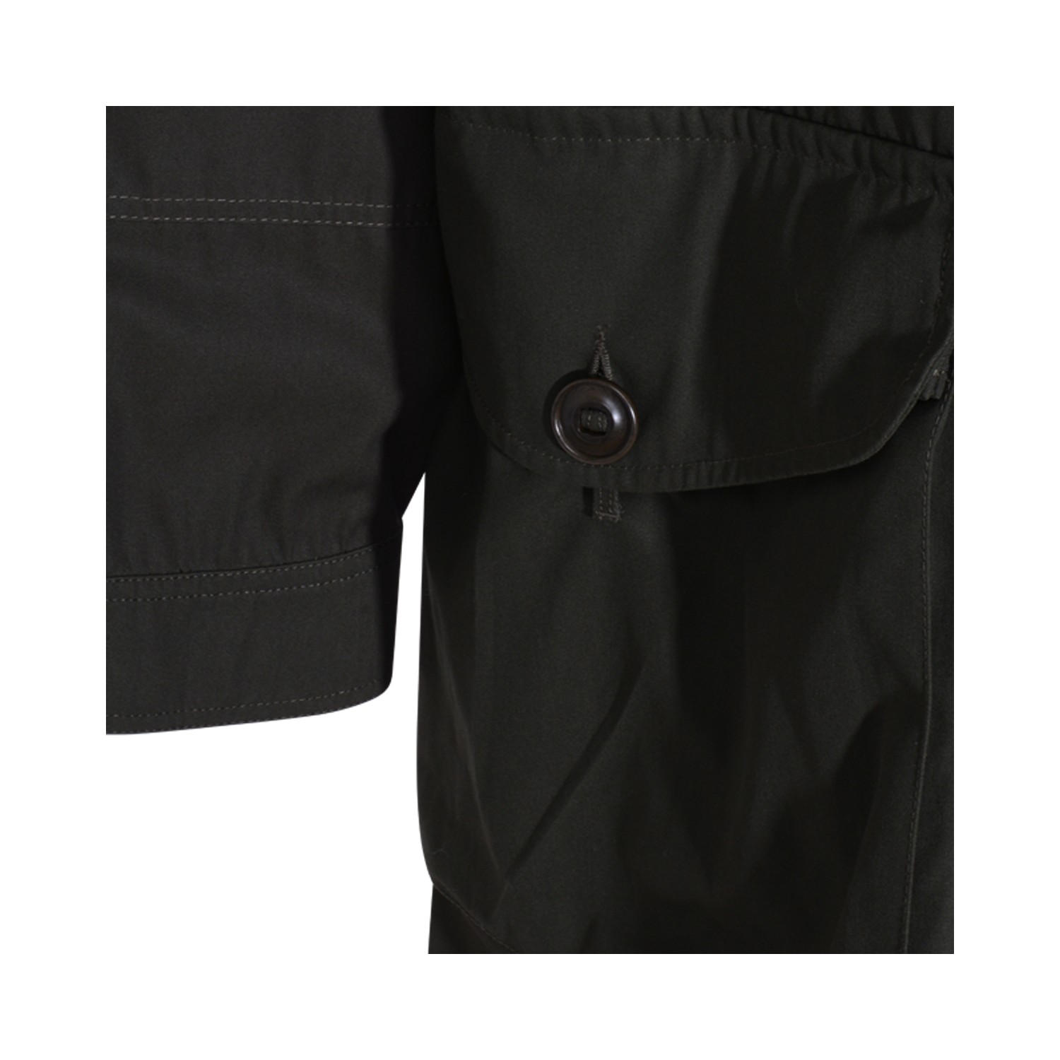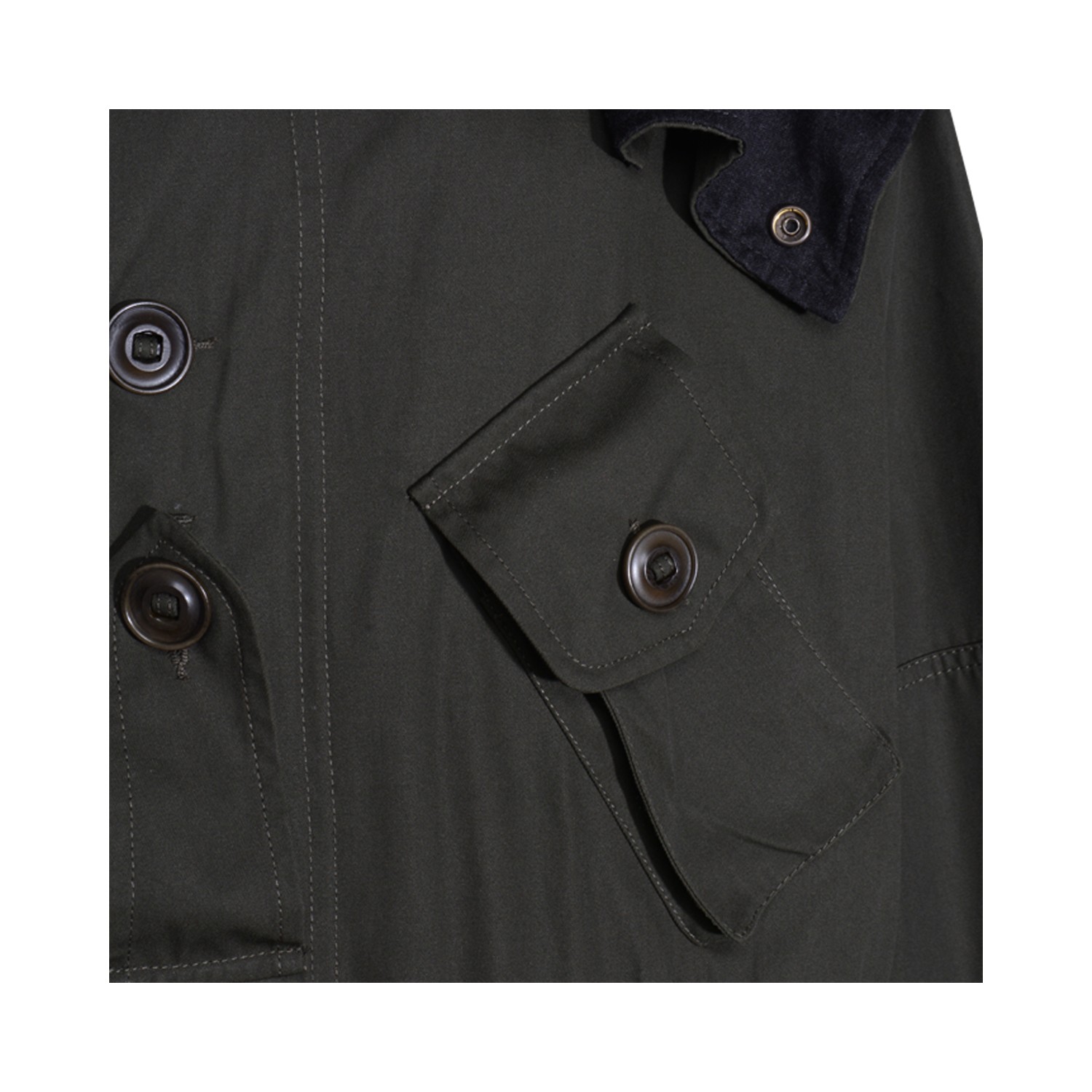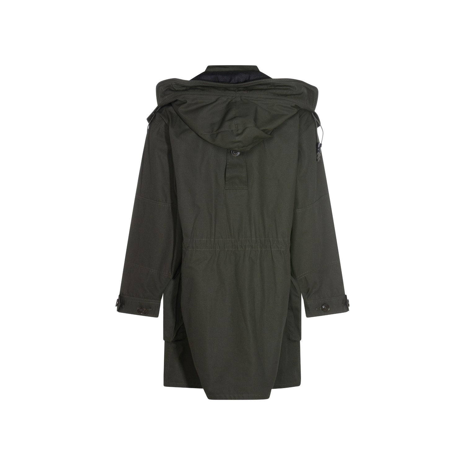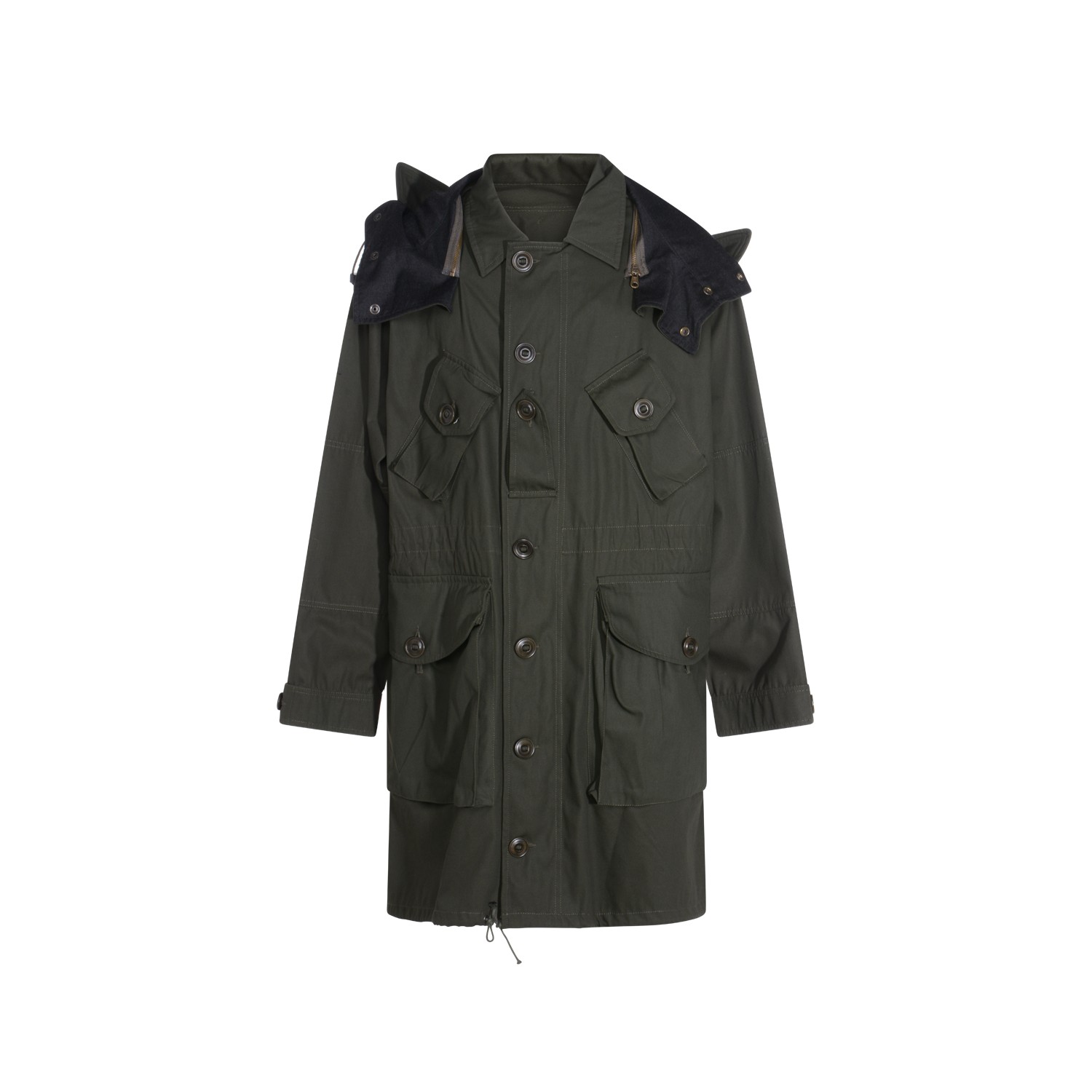 Dark green cotton coat from Maison Margiela featuring shirt collar, long sleeves, frontal fastening, removable hood and pockets.