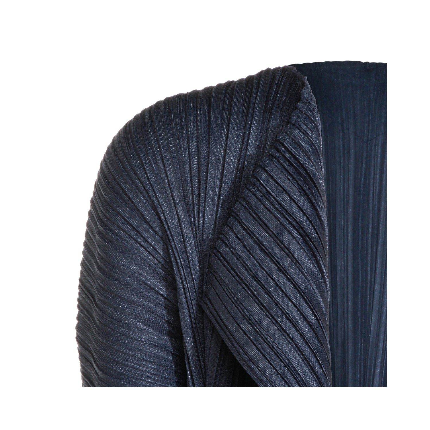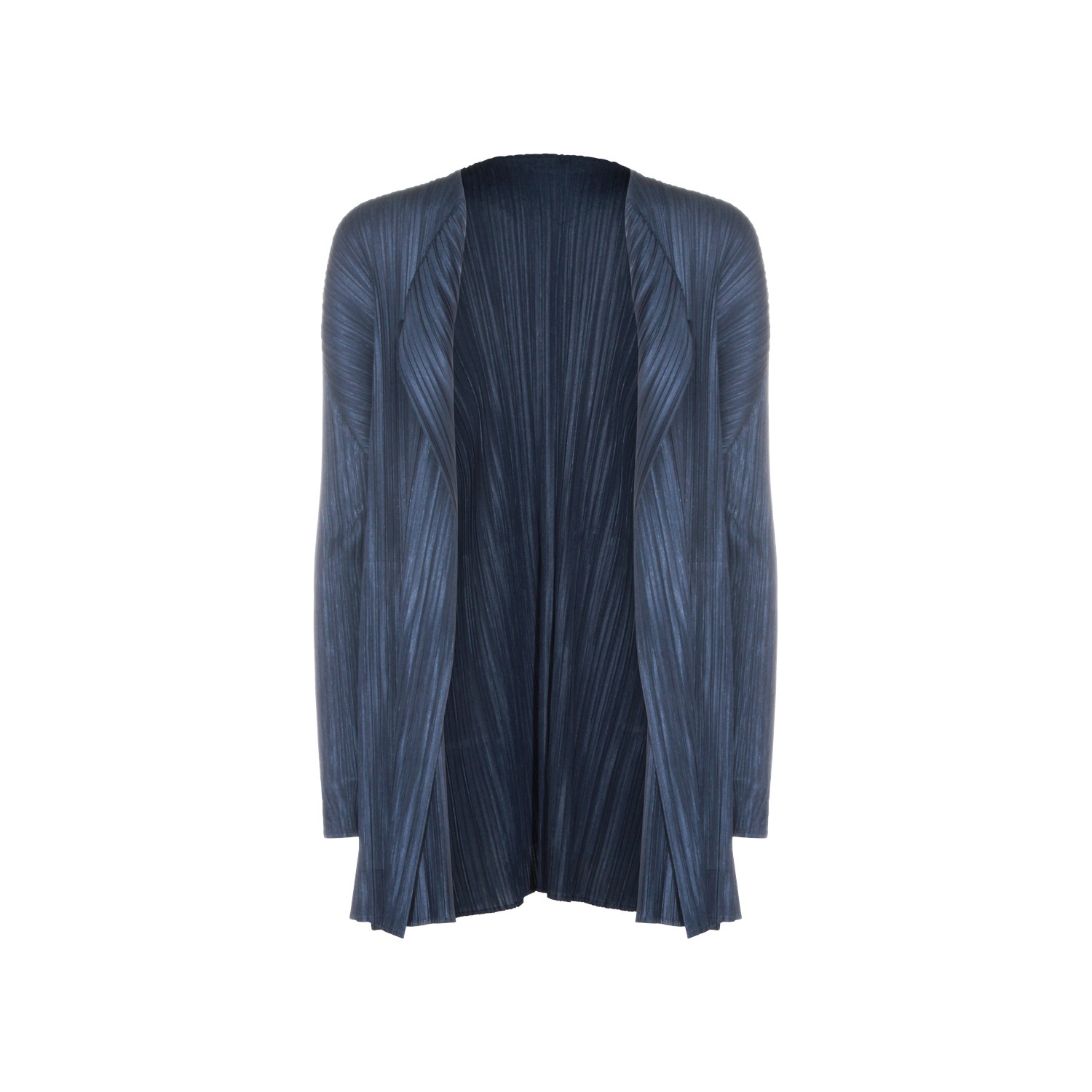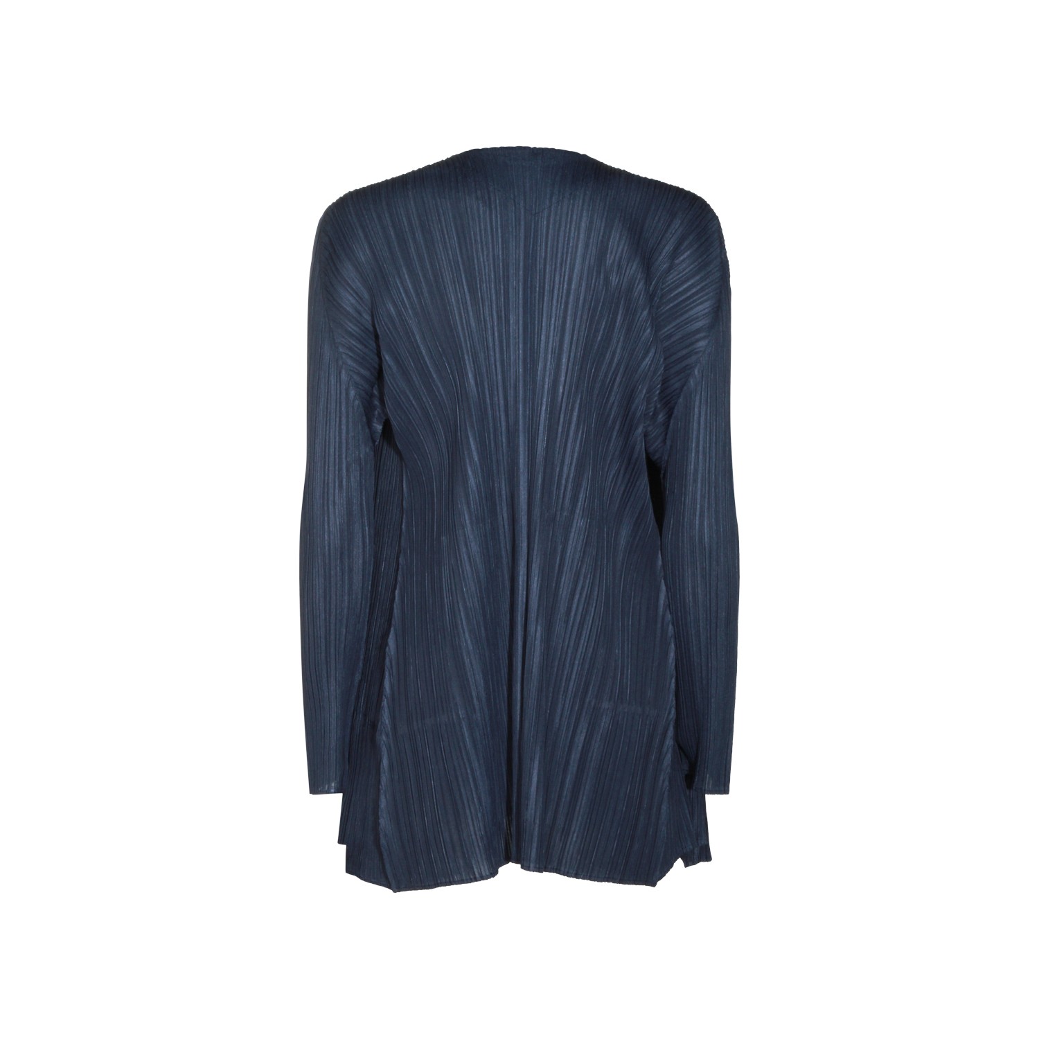 Navy coat from Issey Miyake Pleats Please featuring long sleeves, pleates, no closure and soft vestibility.