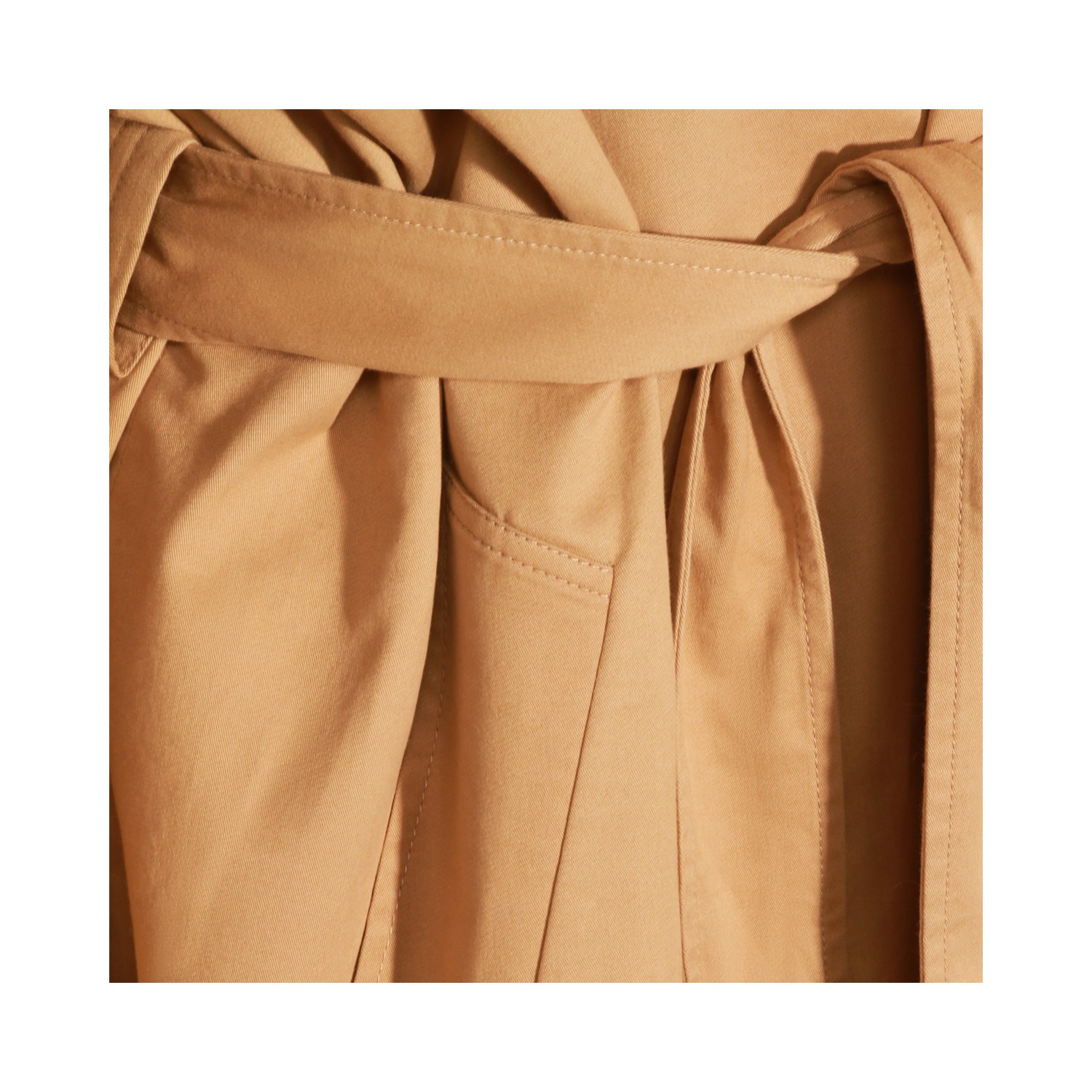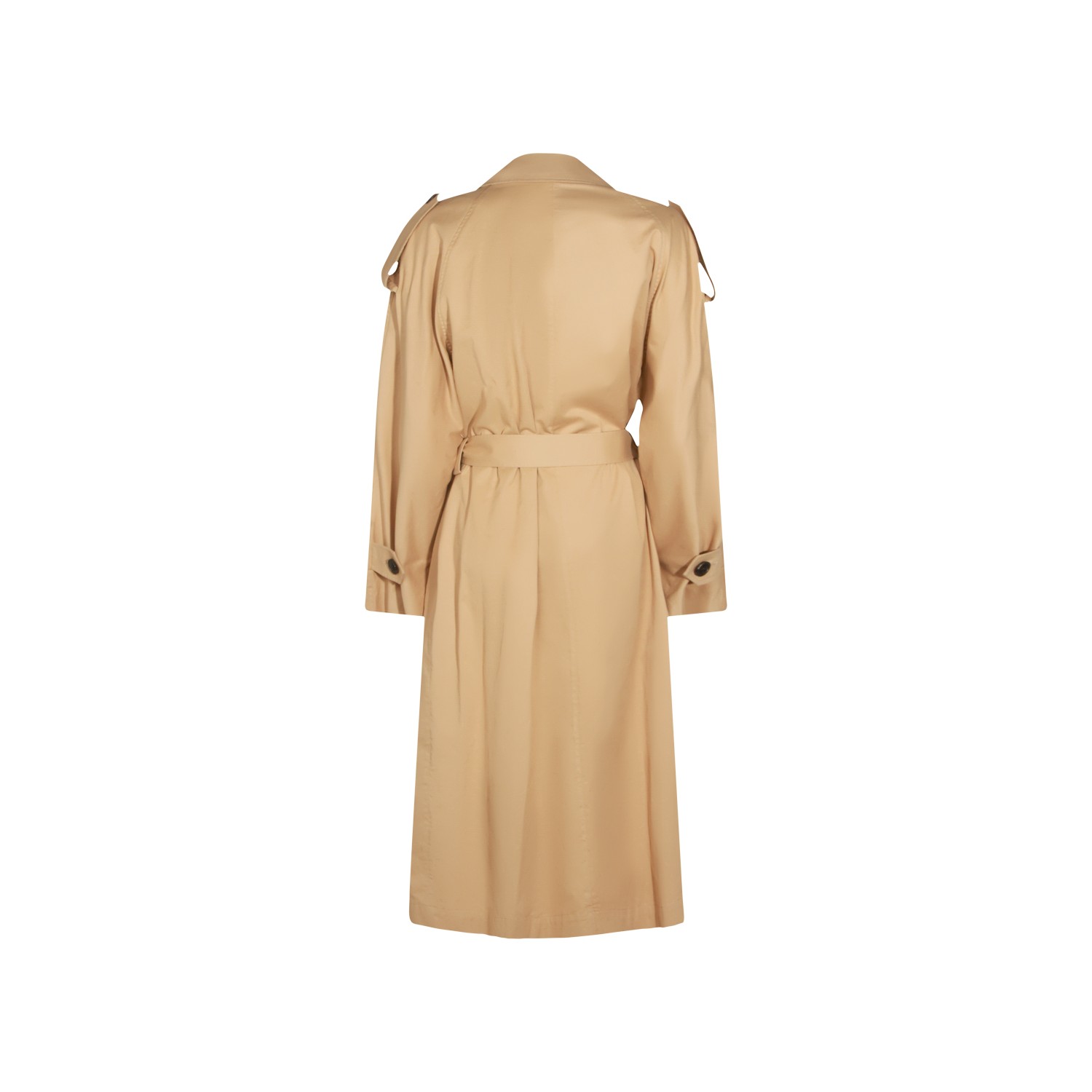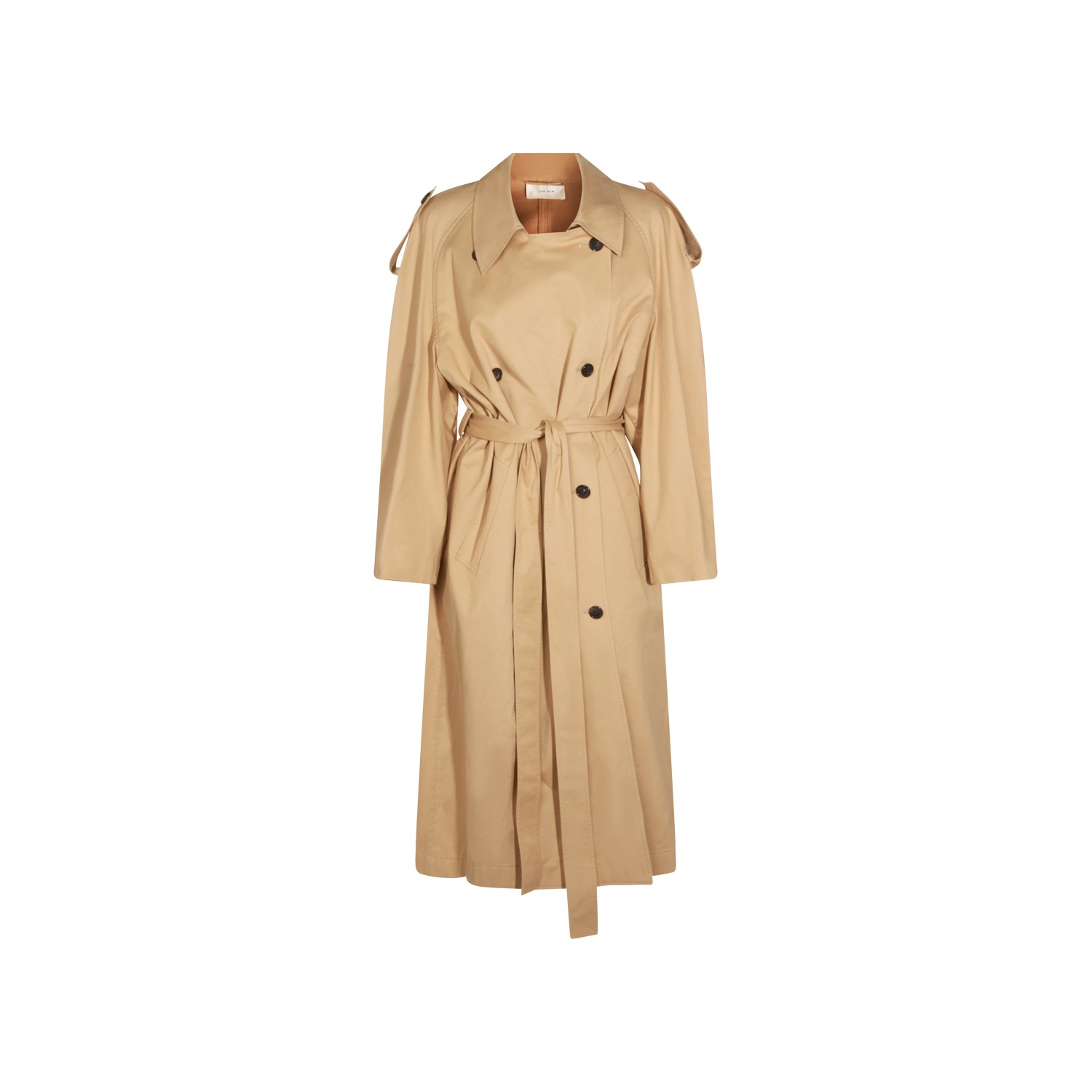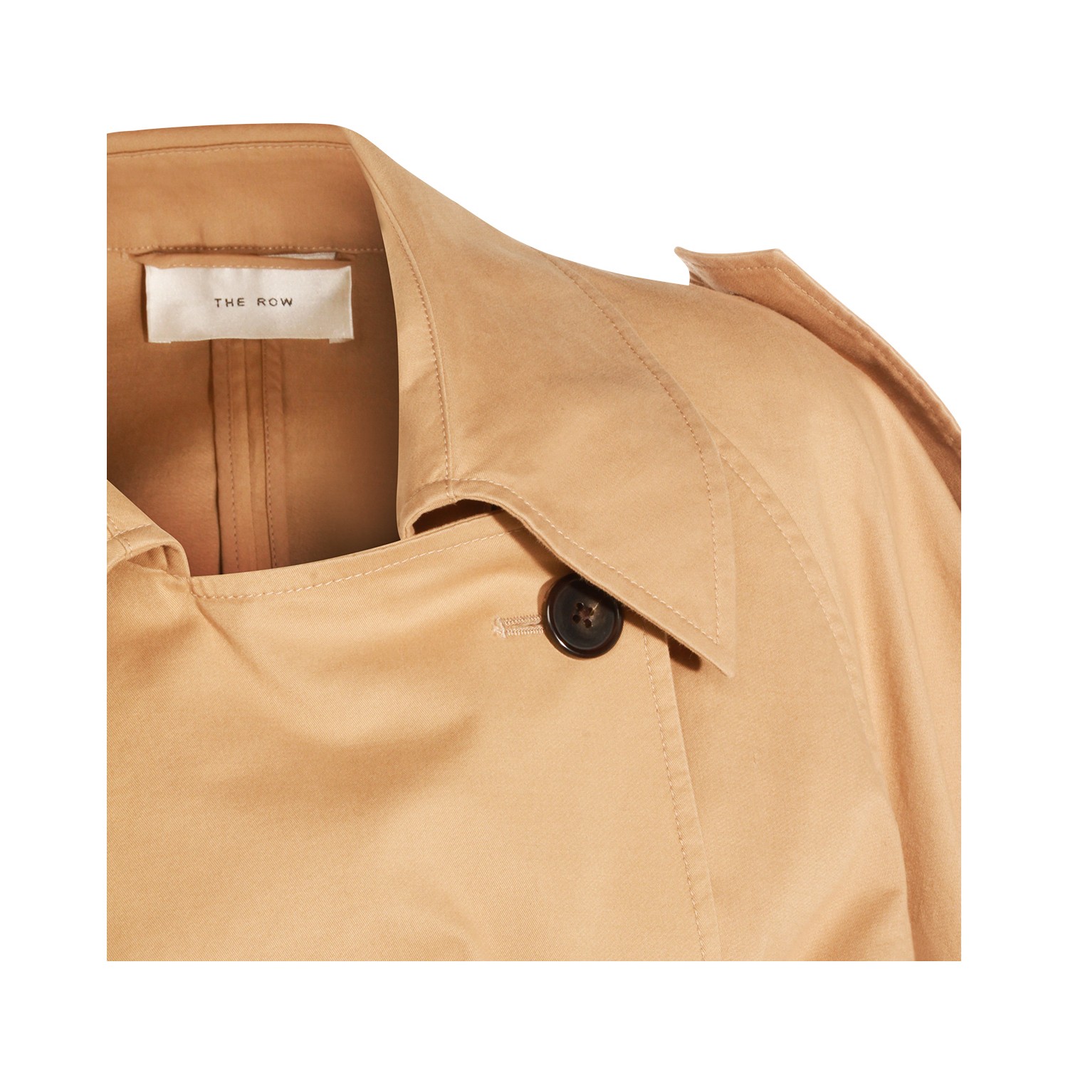 Beige cotton Dester trench coat from The Row featuring long sleeves, double breasted closure, batchy belt waist, pockets, bukle details on shoulders and regular vestibility.