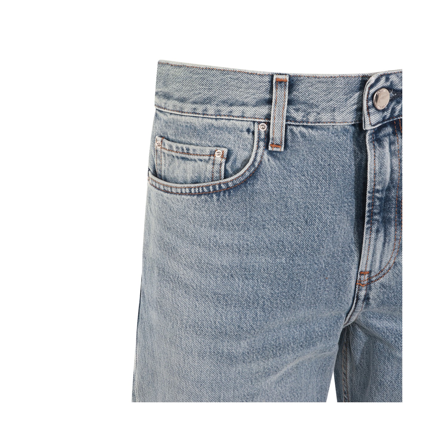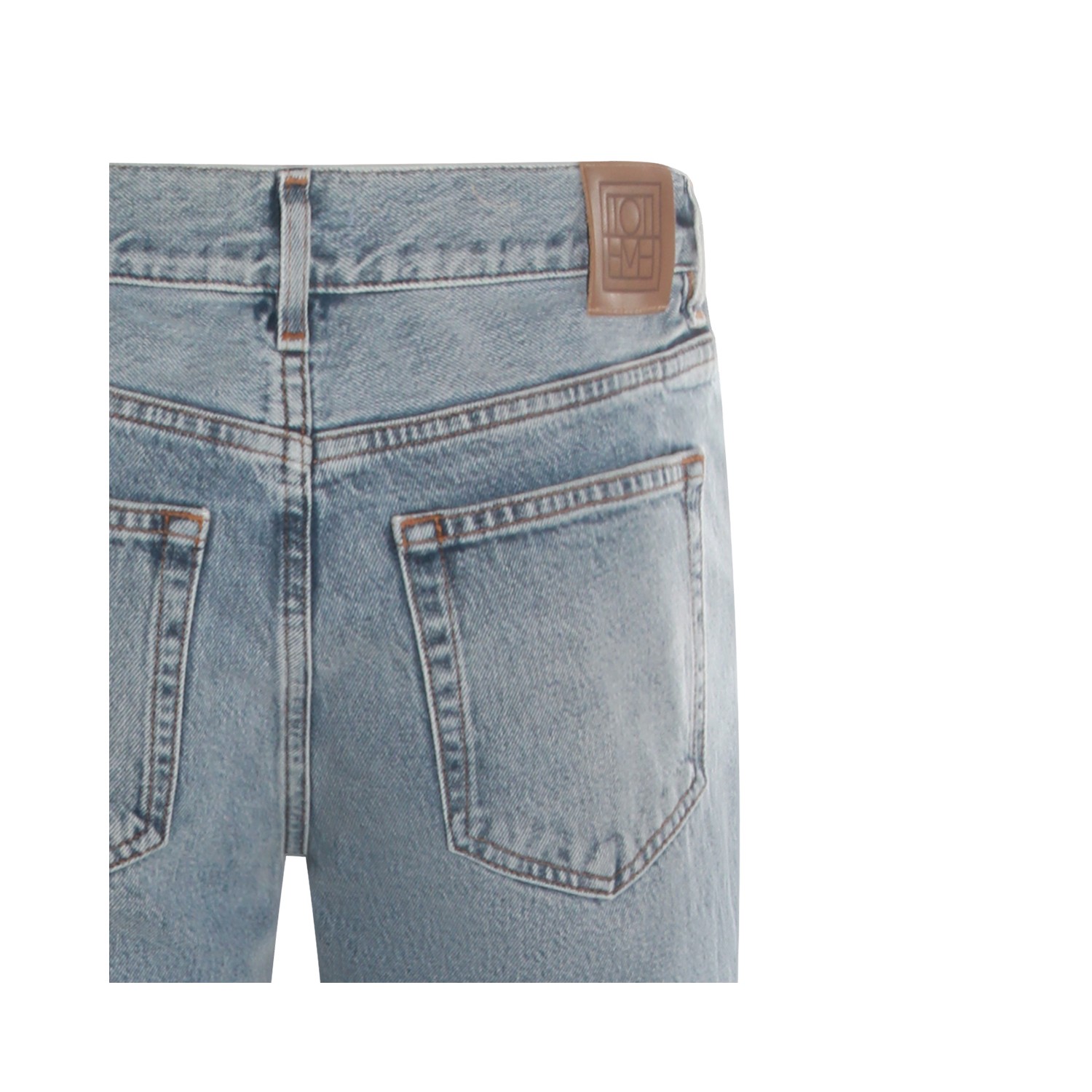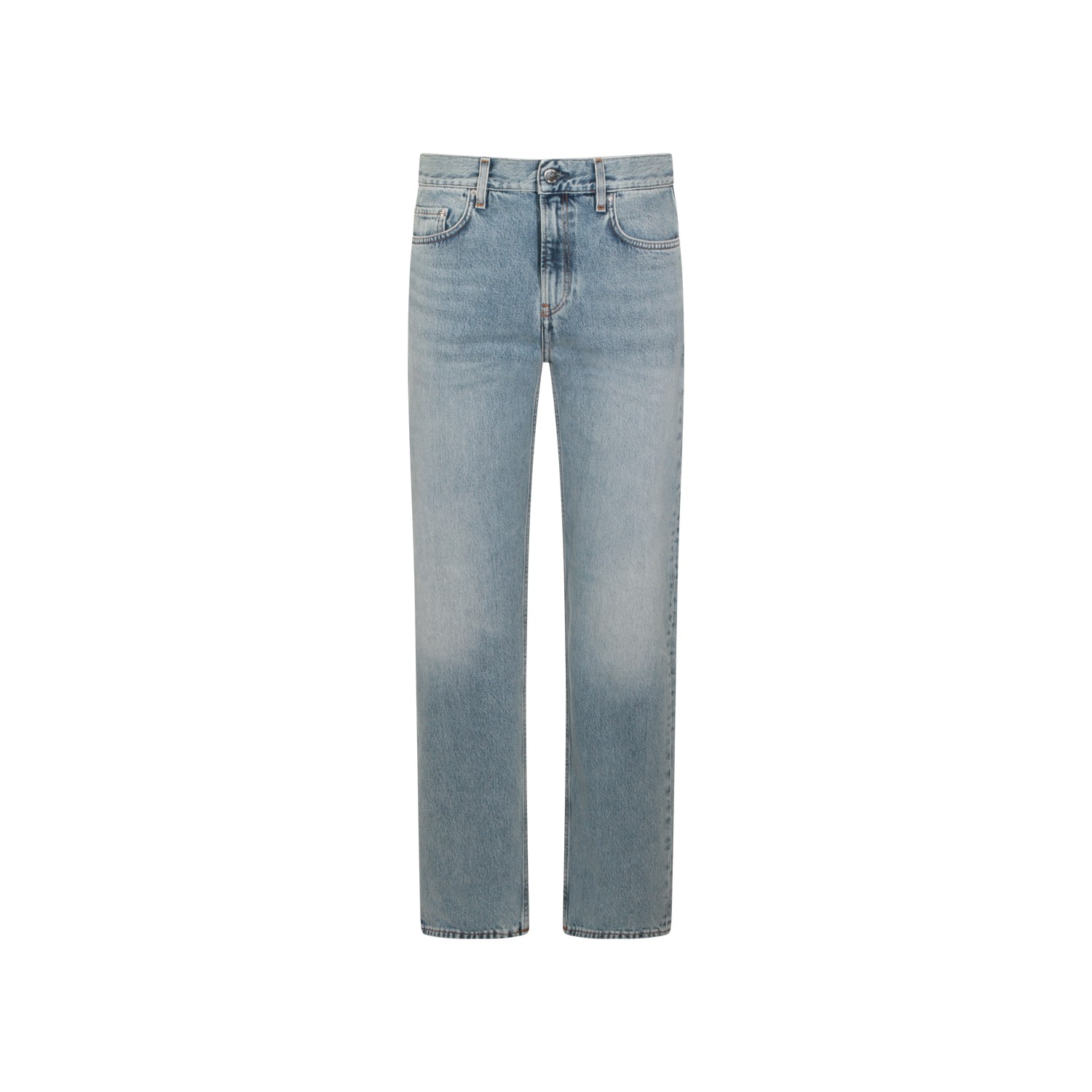 Light blue cotton low straight denim jeans from Toteme featuring low waist, belt loops, frontal zip and button fastening, pockets and straight leg.