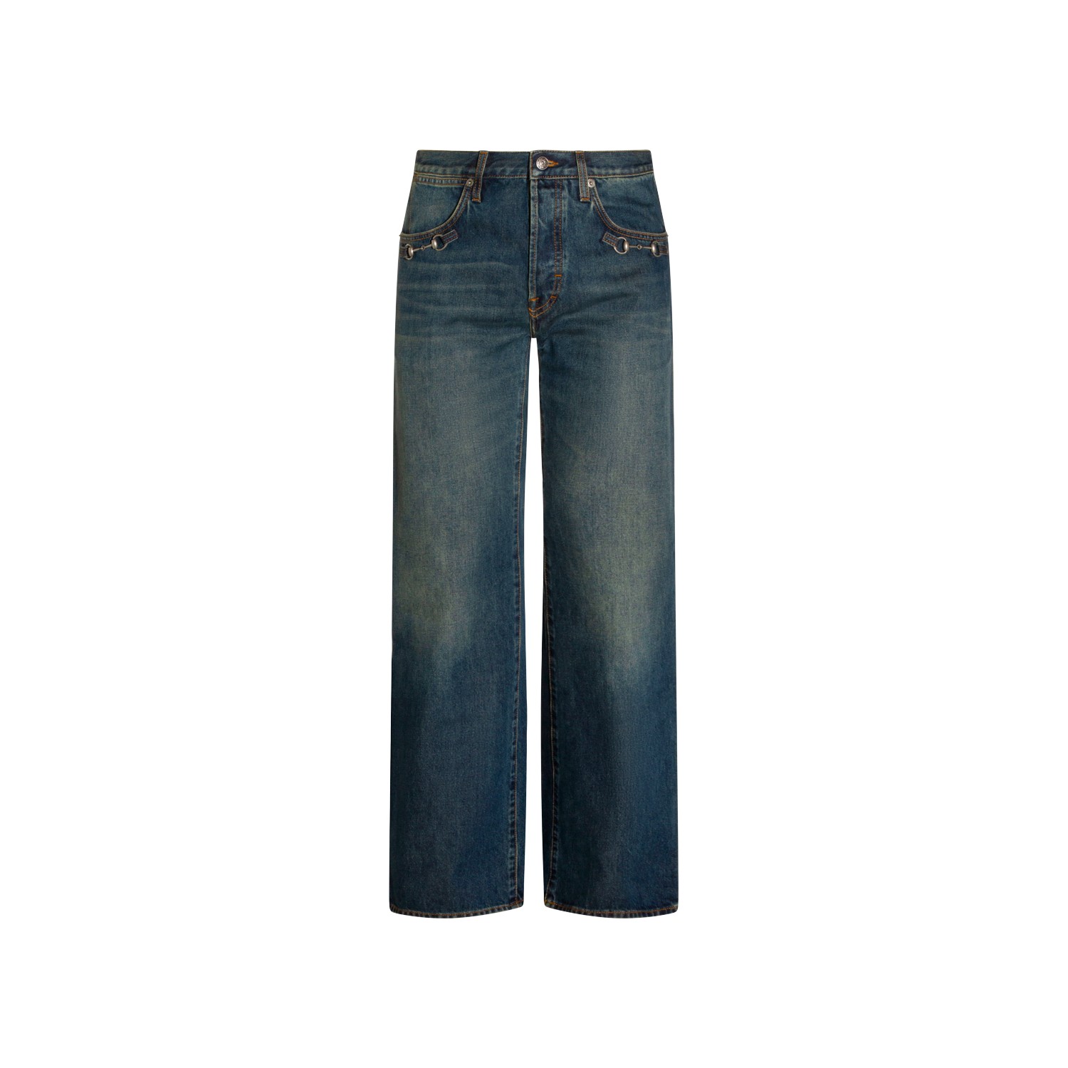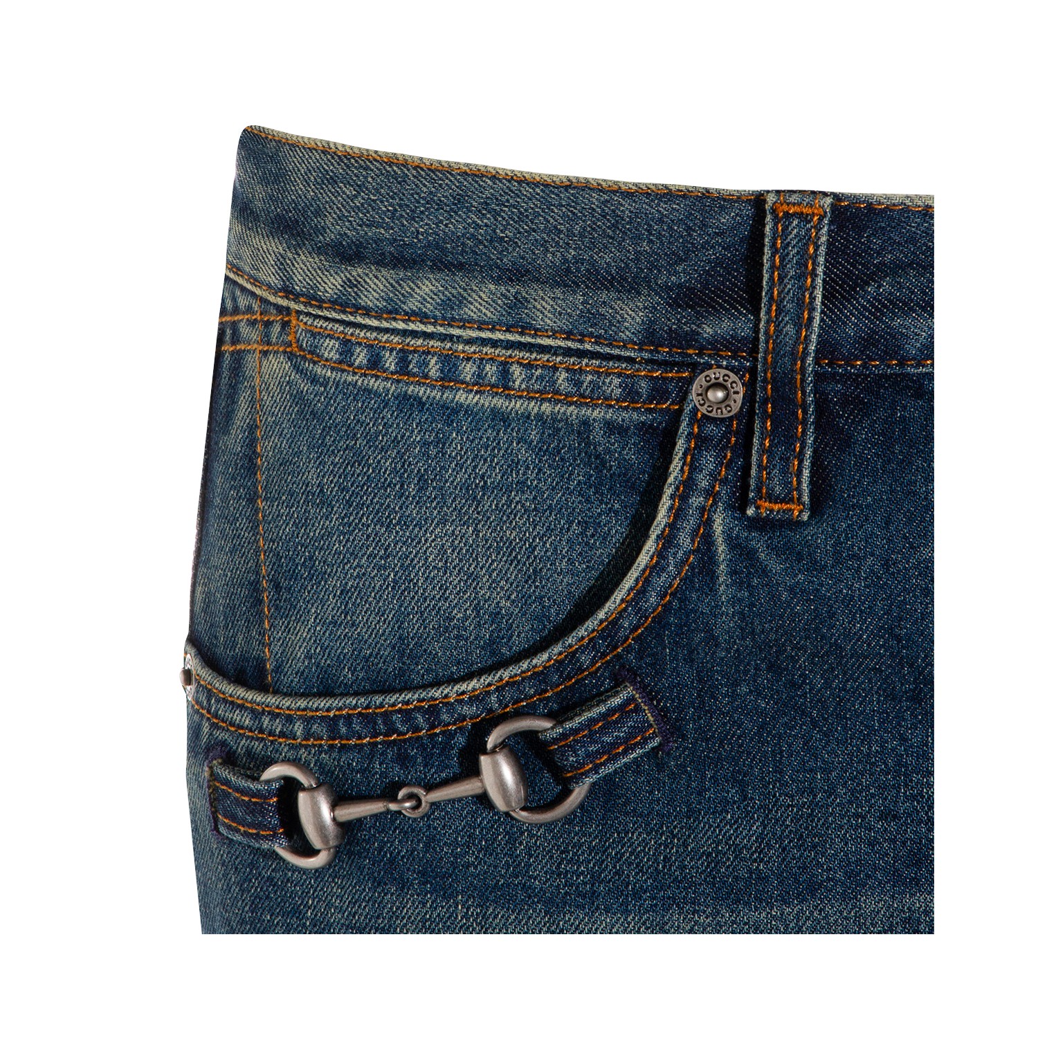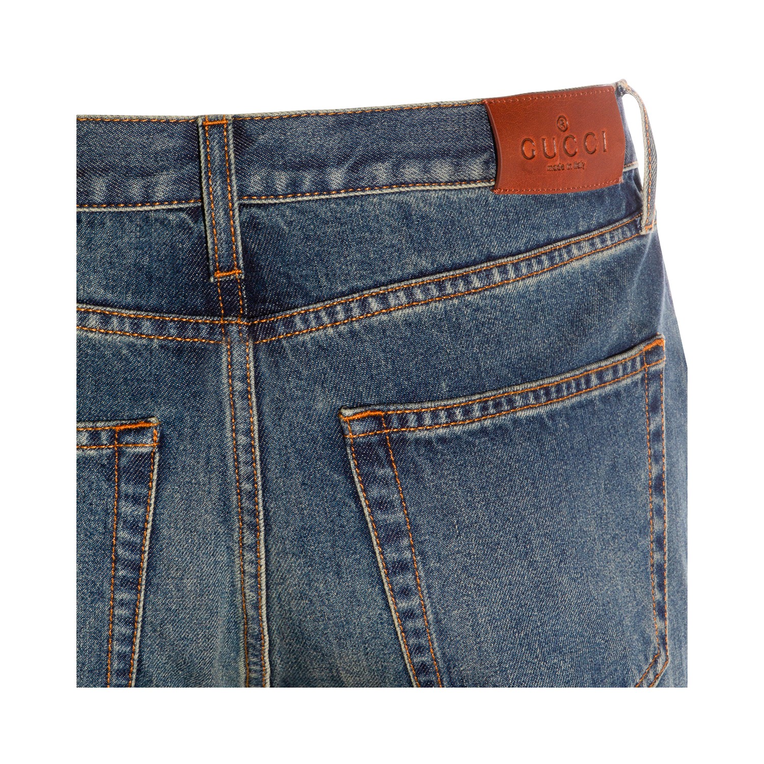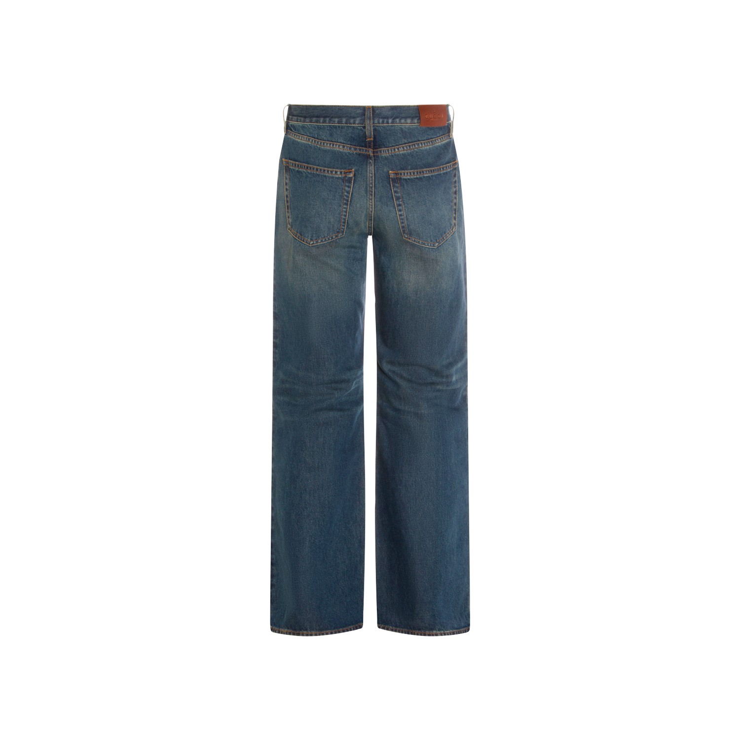Dark blue cotton jeans from Gucci featuring frontal fastening, belt loops, pockets, logo patch and classic vestbility.