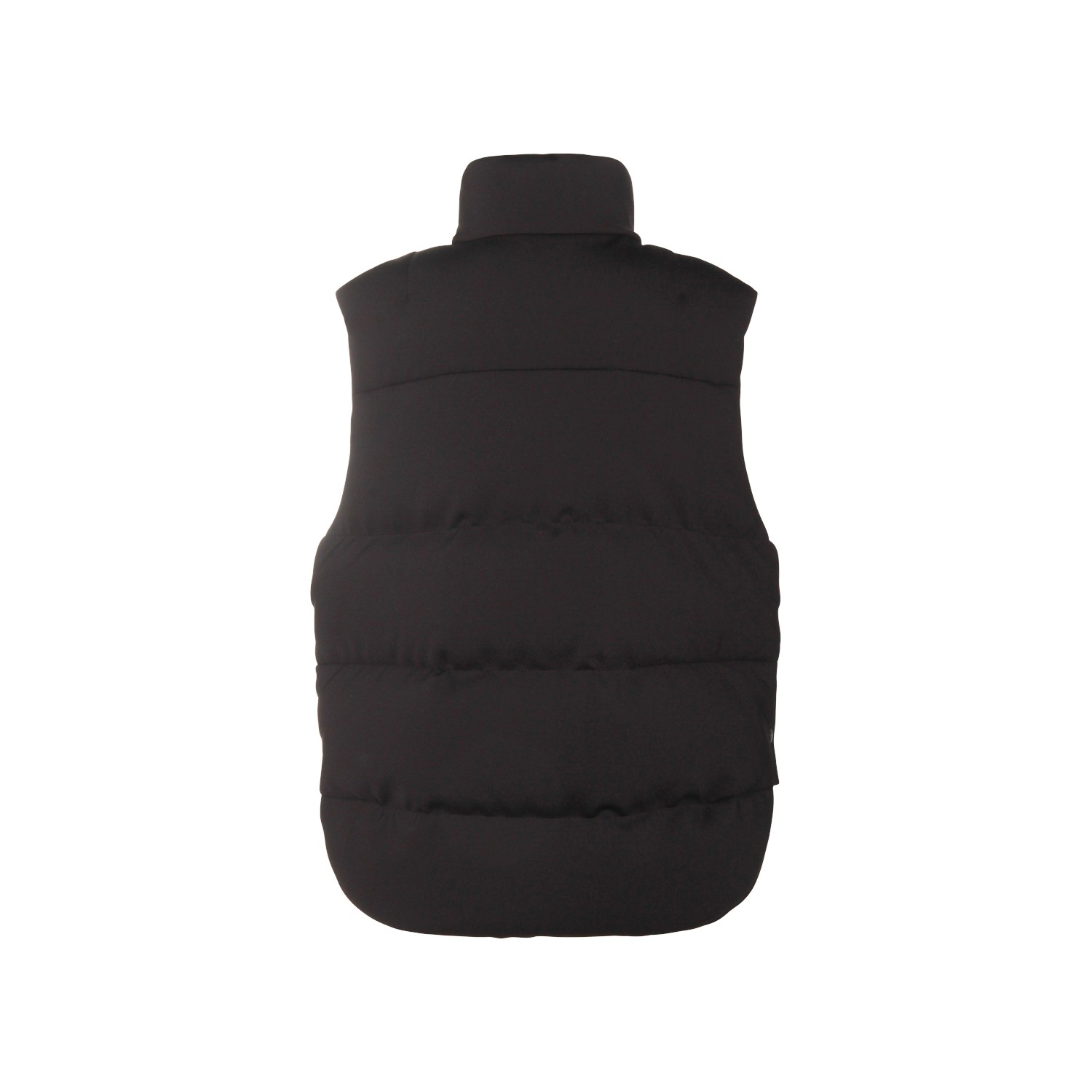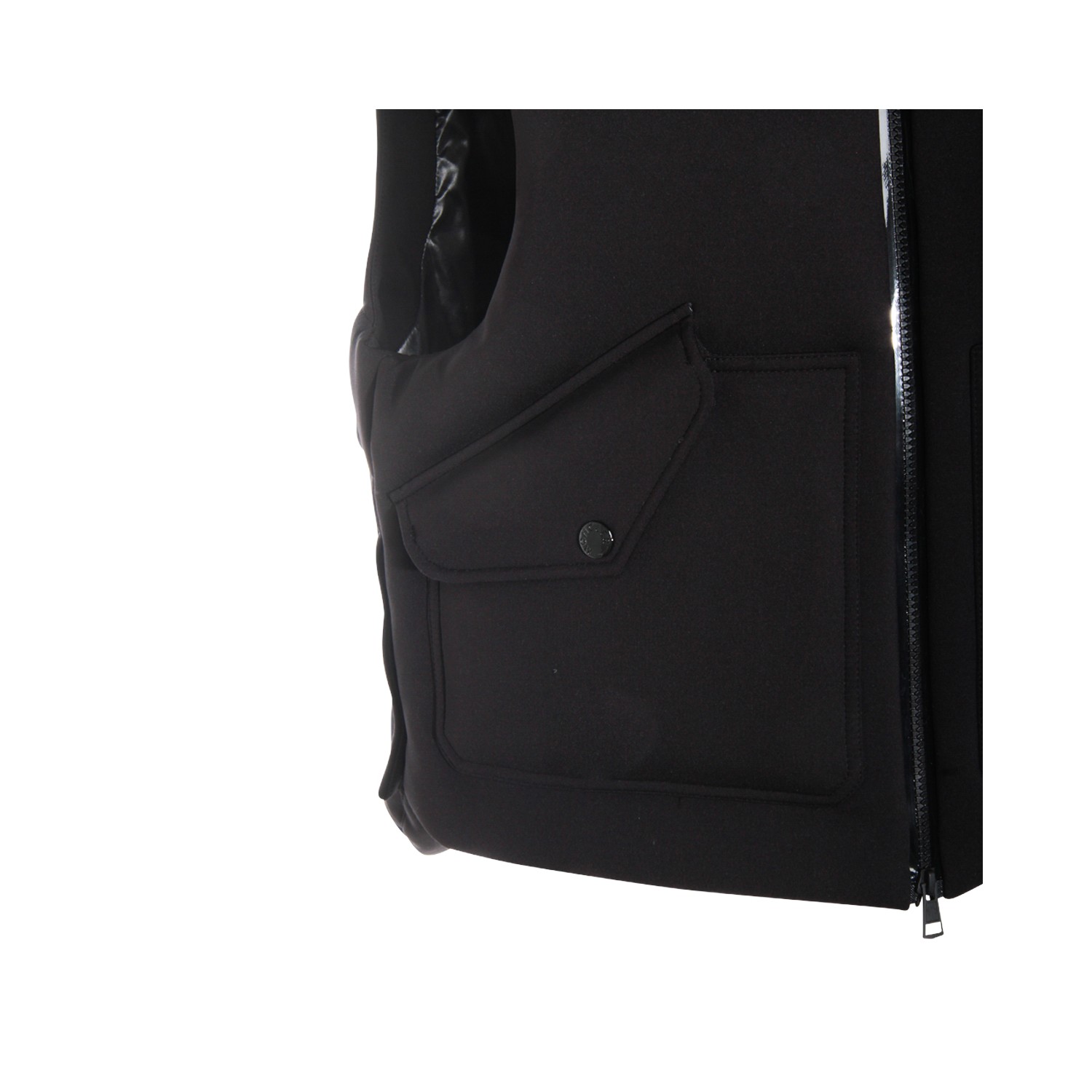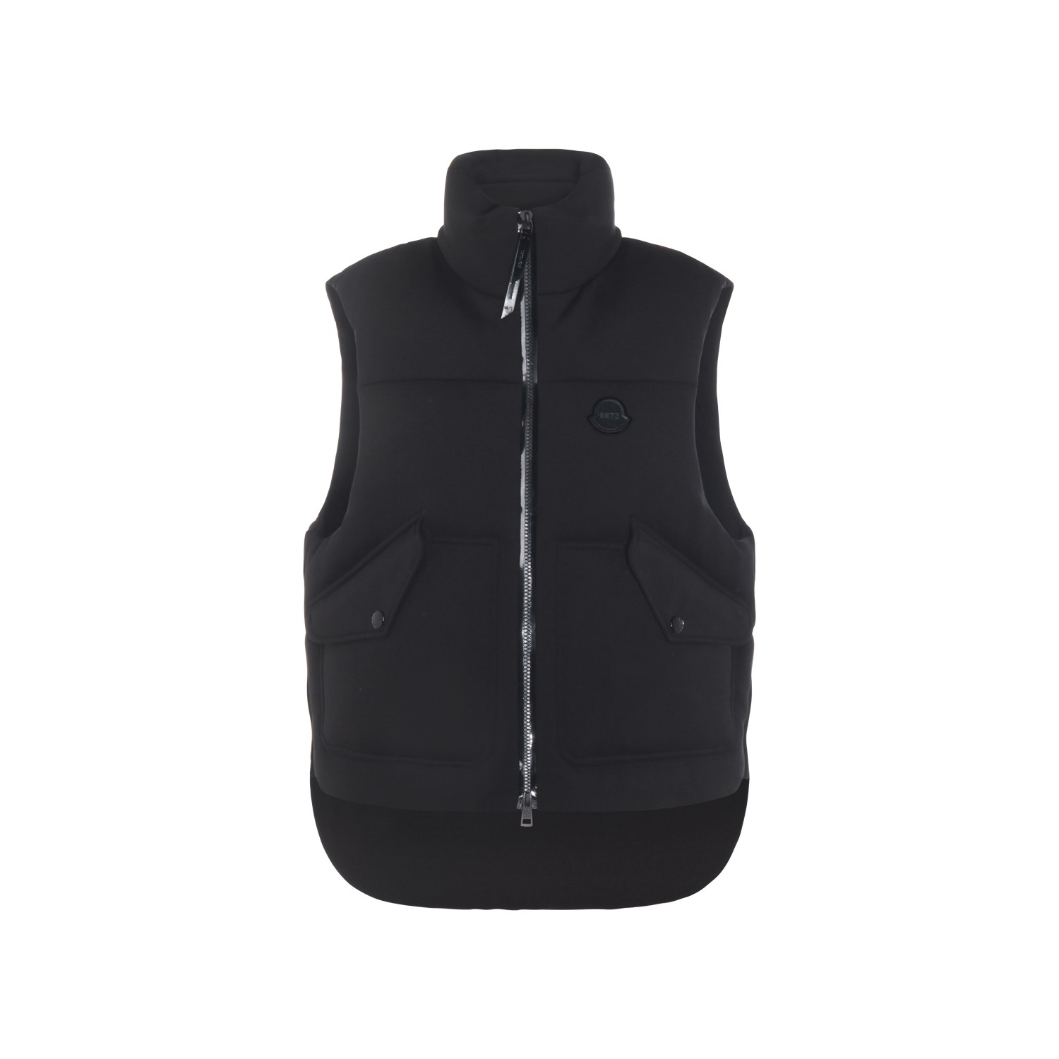Black down jacket from Moncler Genius Edward Enninf featuring high collar, sleeveless, zip fastening, buttoned pockets and regular vestibility.