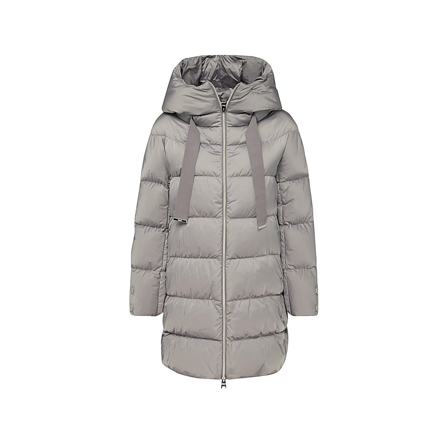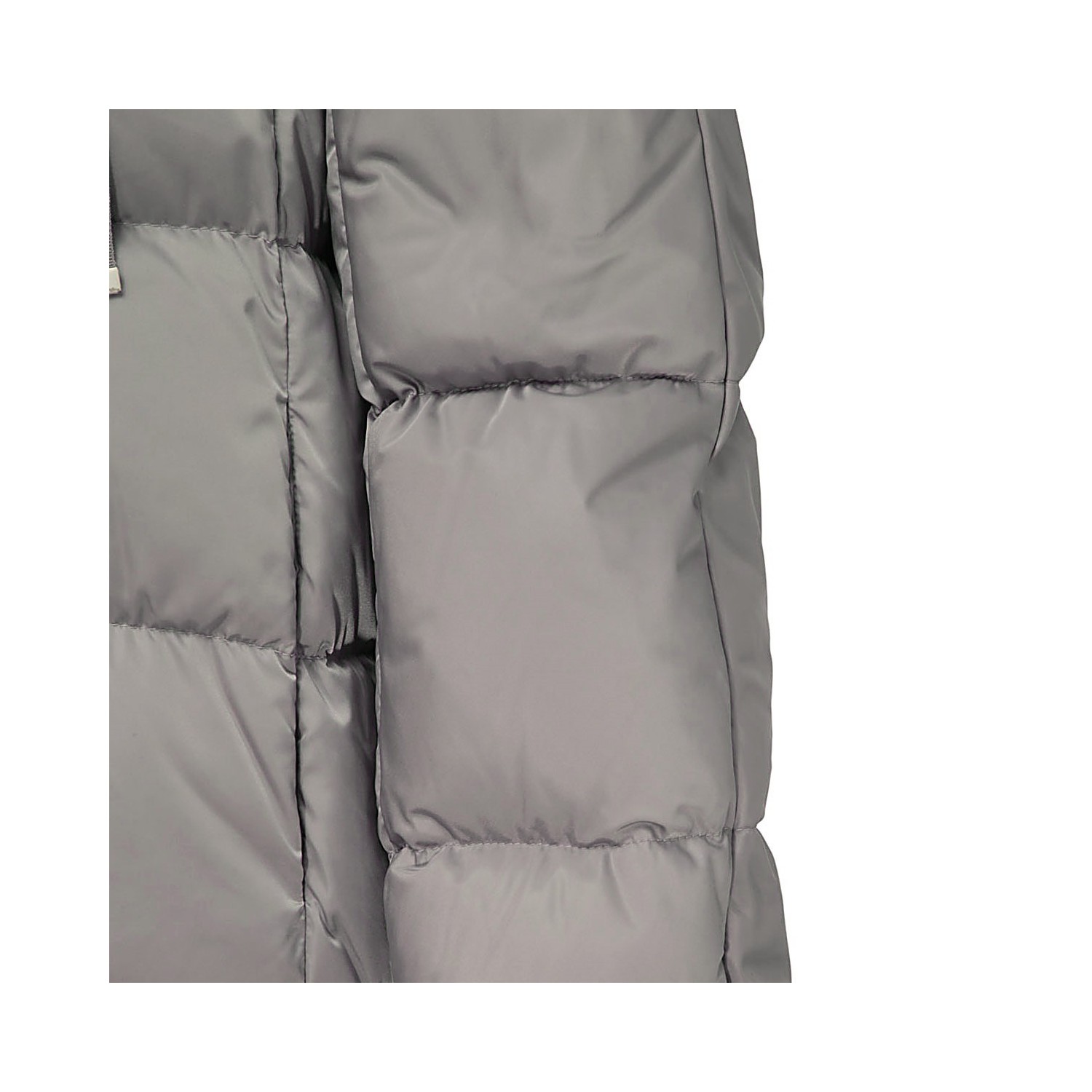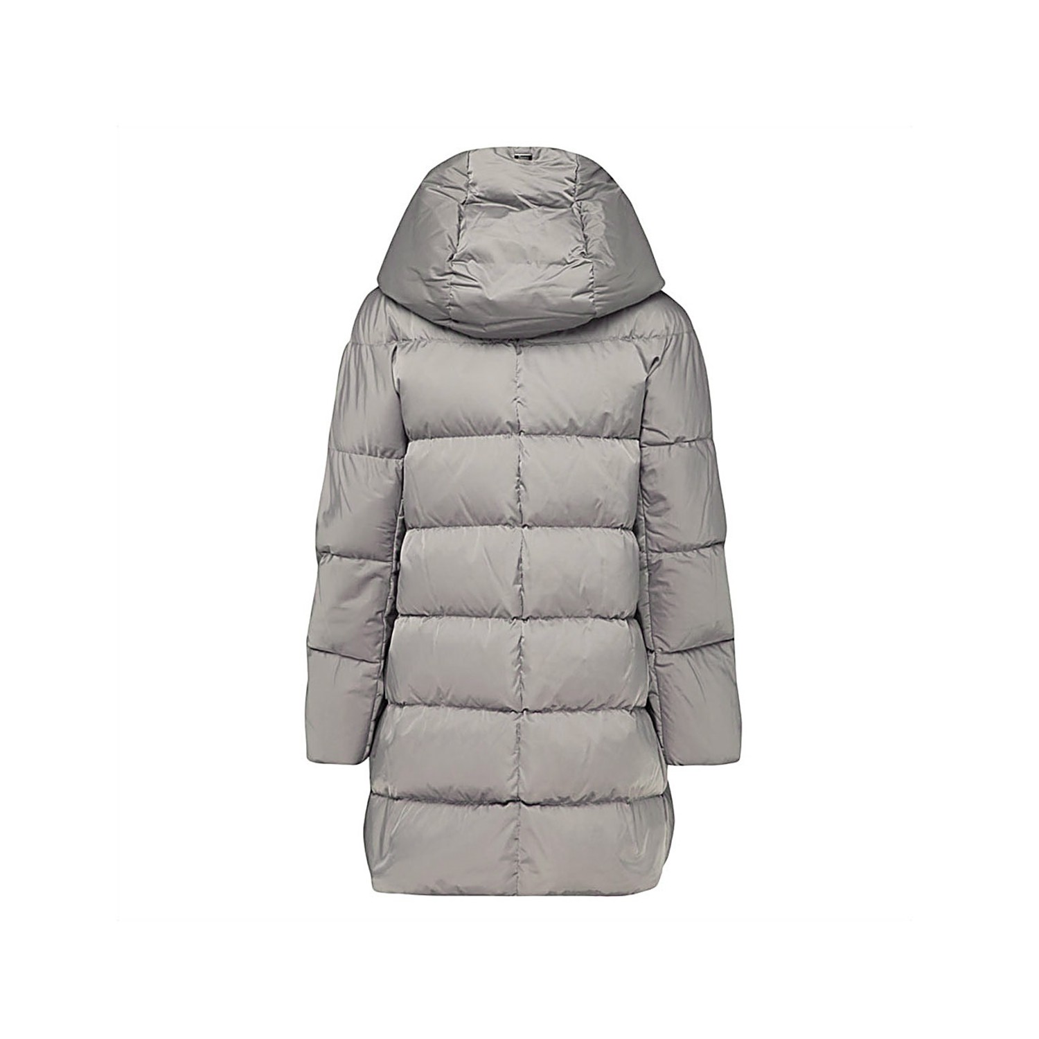 Grey down jacket from Herno featuring high collar, hood, long sleeves, padded, drawstring, zip fastening and midi lenght.