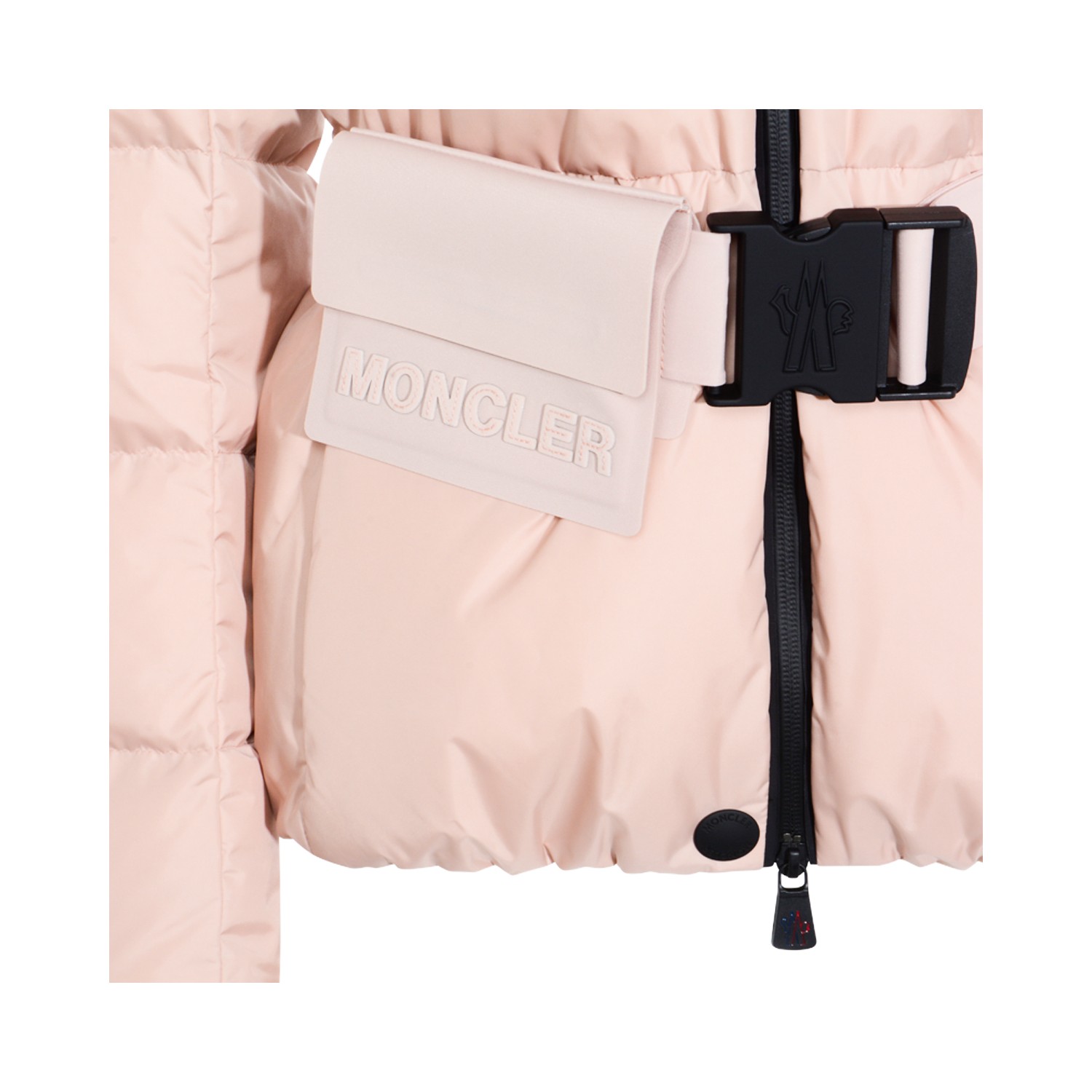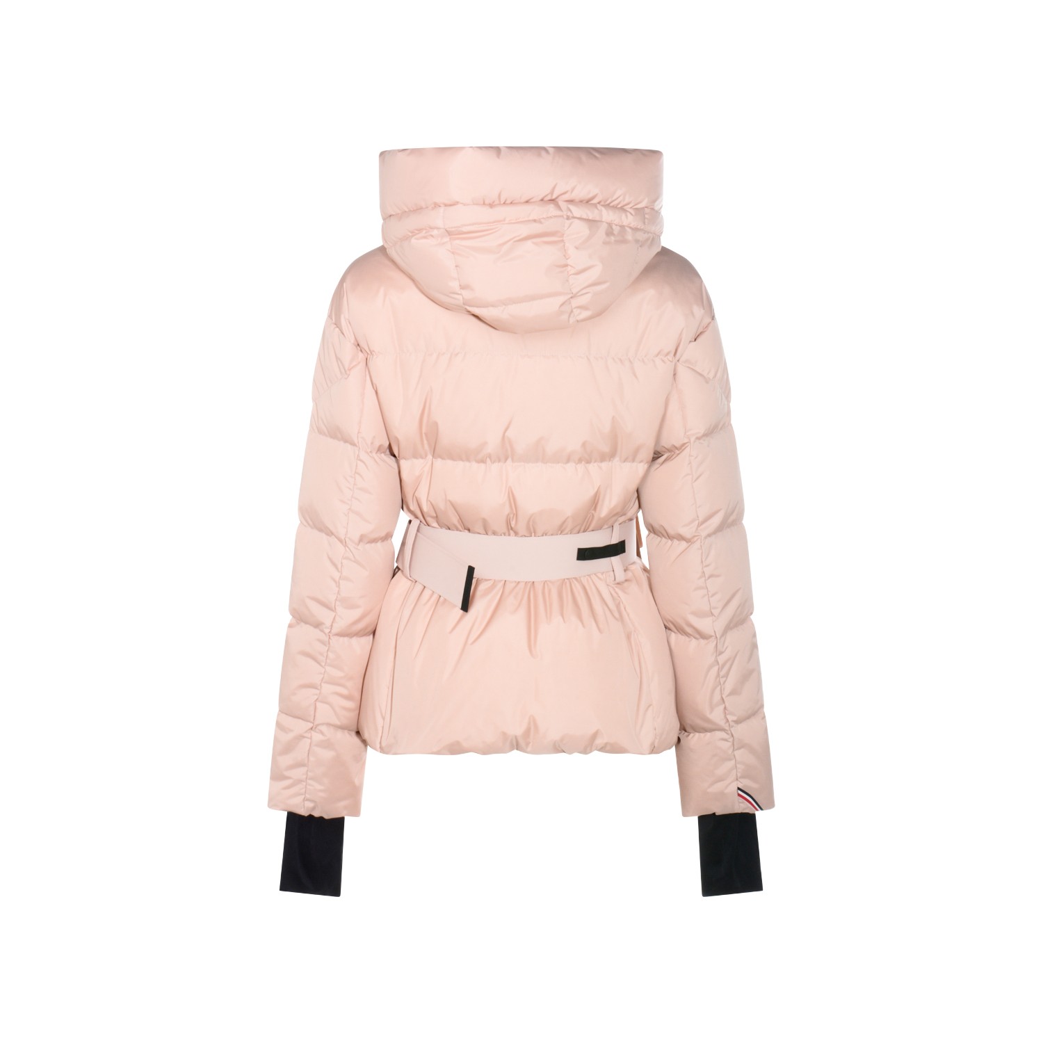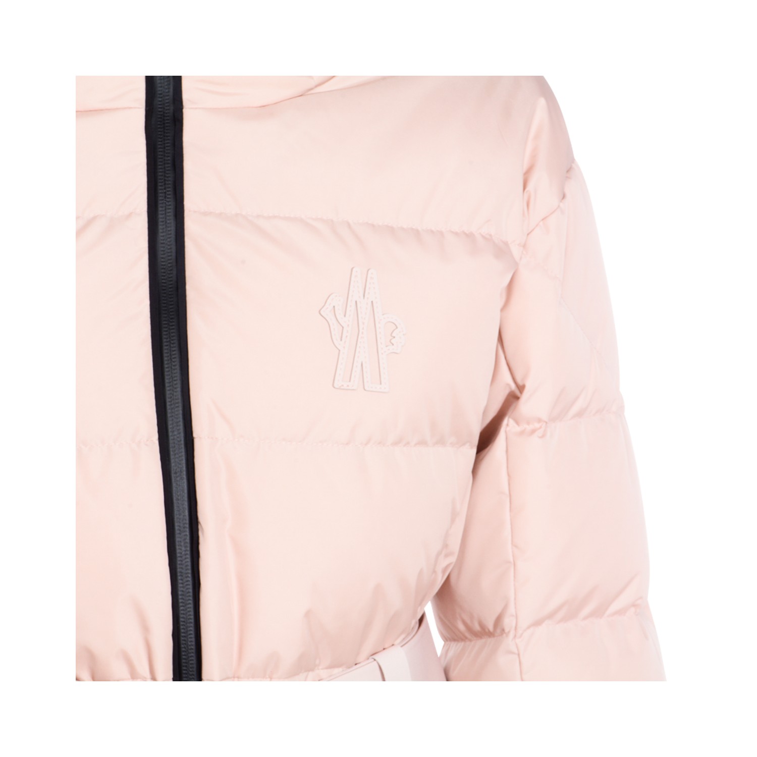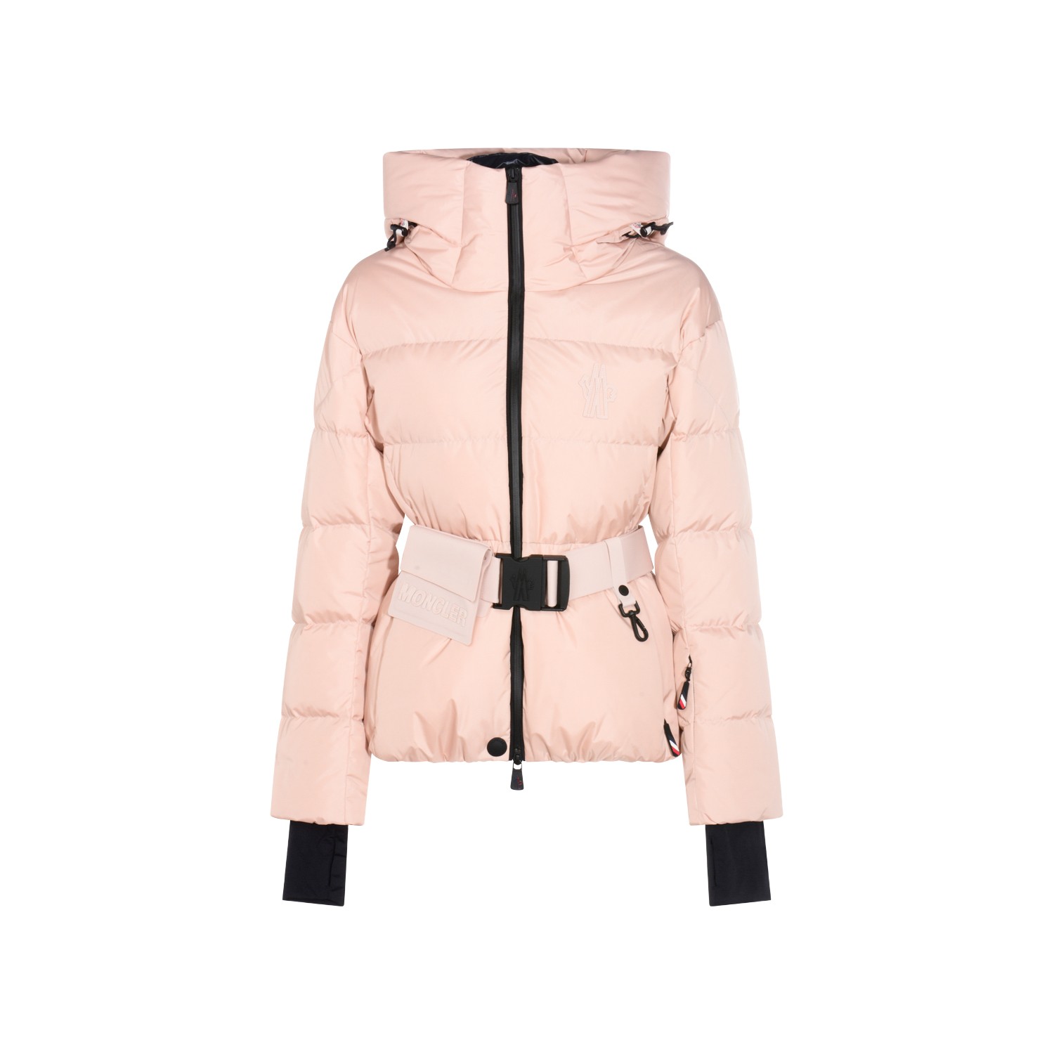 Pink down jacket from Moncler Grenoble featuring high collar, hood, long sleeves, zip gastening, belt waist, elasticated cuffs and regular vestibility.