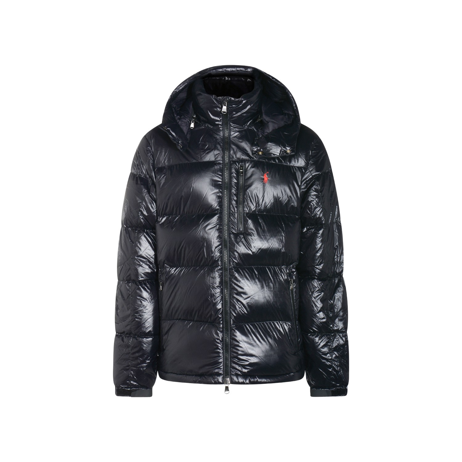 Black down jacket from Polo Ralph Lauren featuring high collar, hood, padded, quilted, long sleeves, zip fastening, logo and regular vestibility.