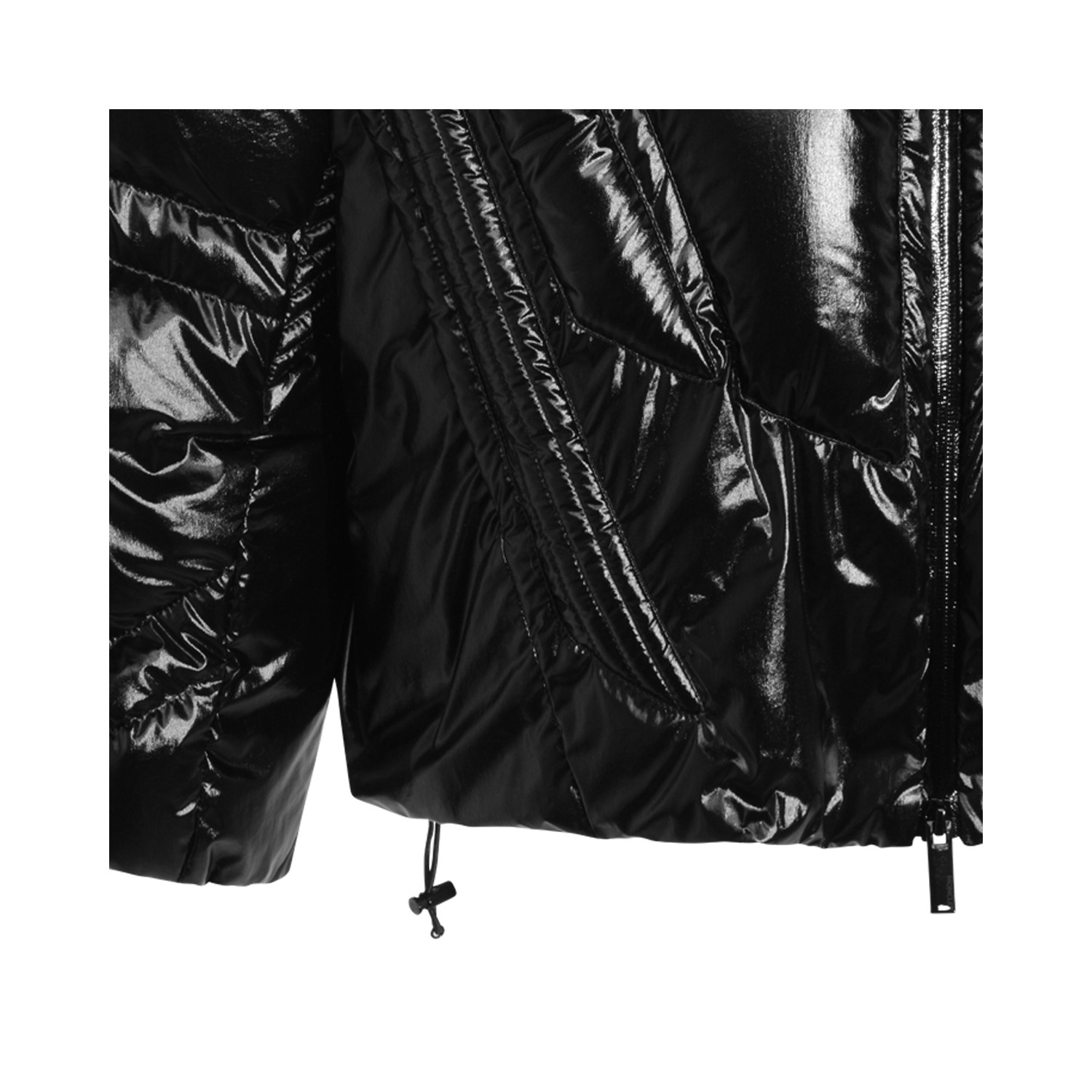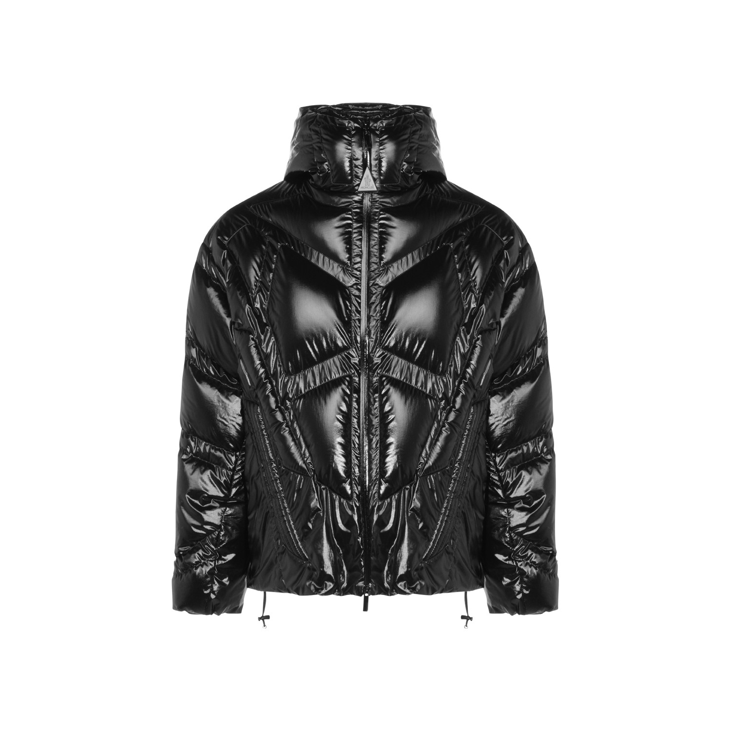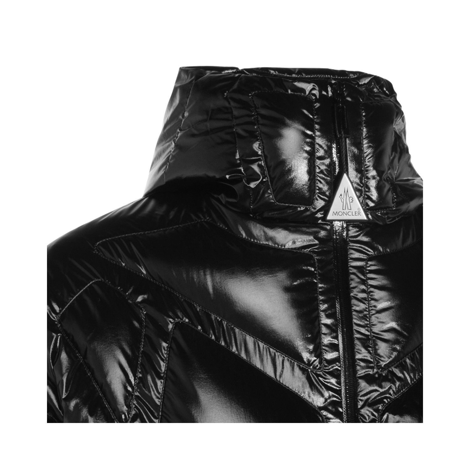 Black down jacket from Moncler Genius Asap Rocky featuring high collar, padded, long sleeves, zip fastening, drawstring at the hem and regular vestibility.