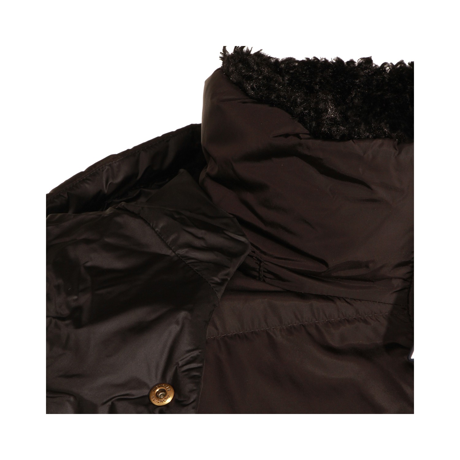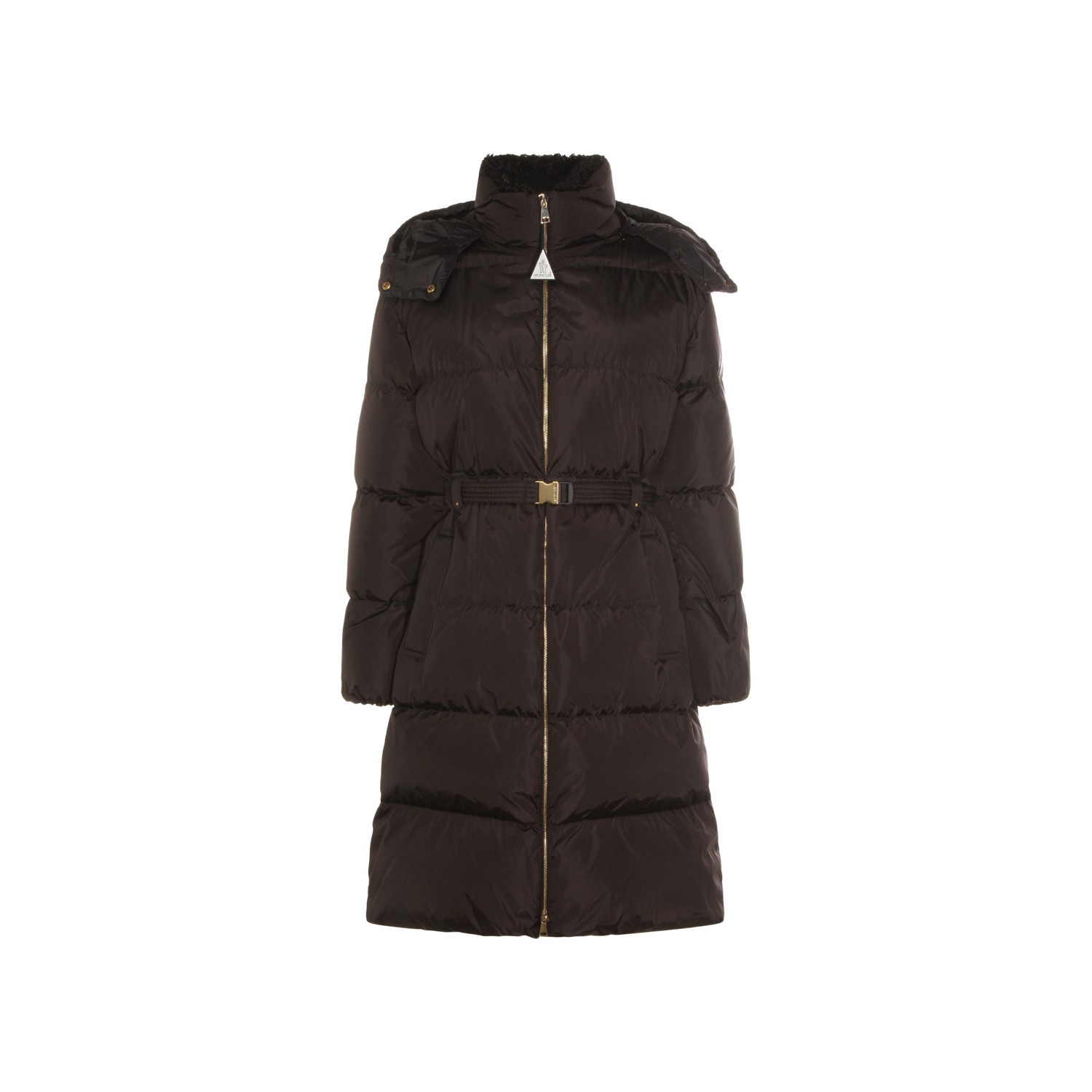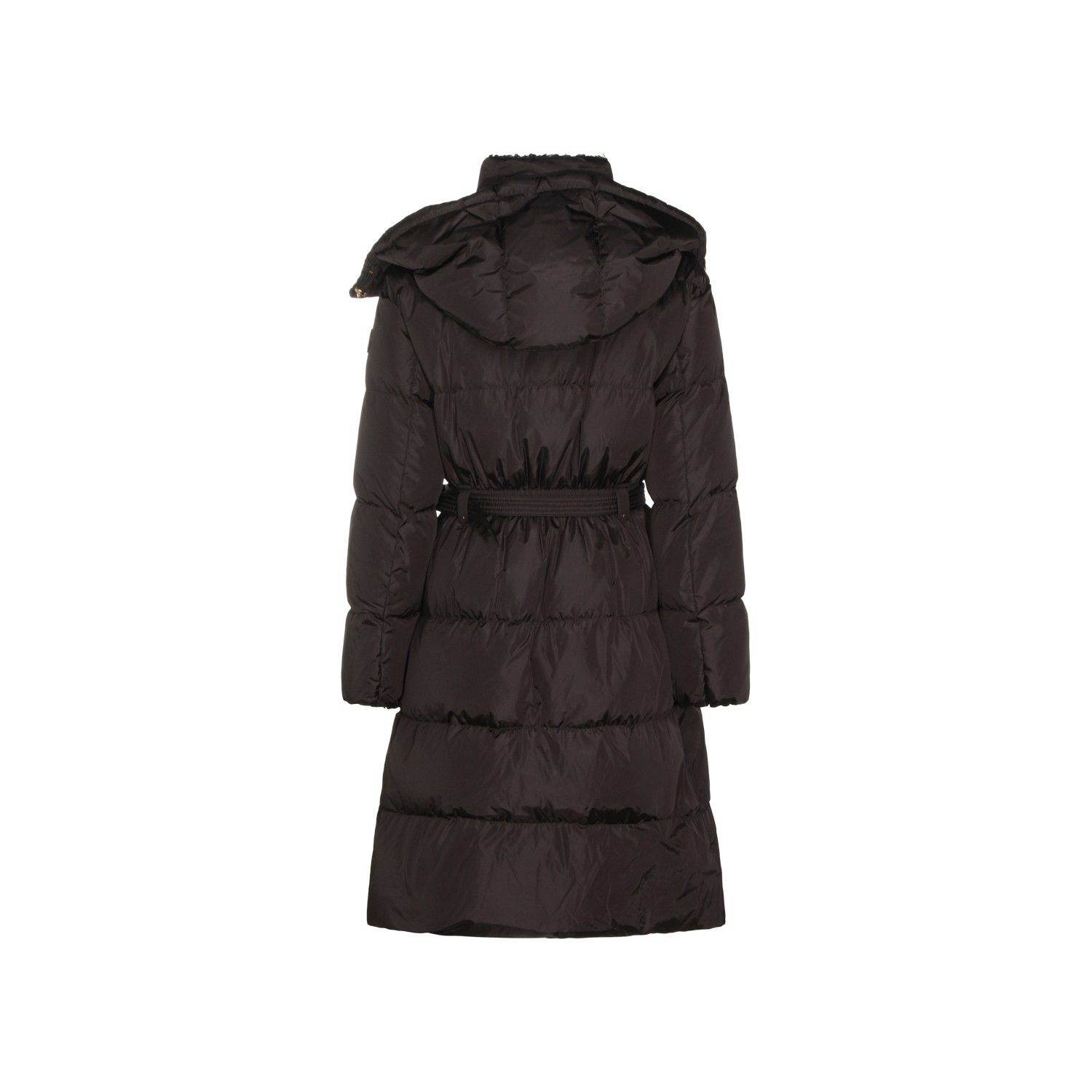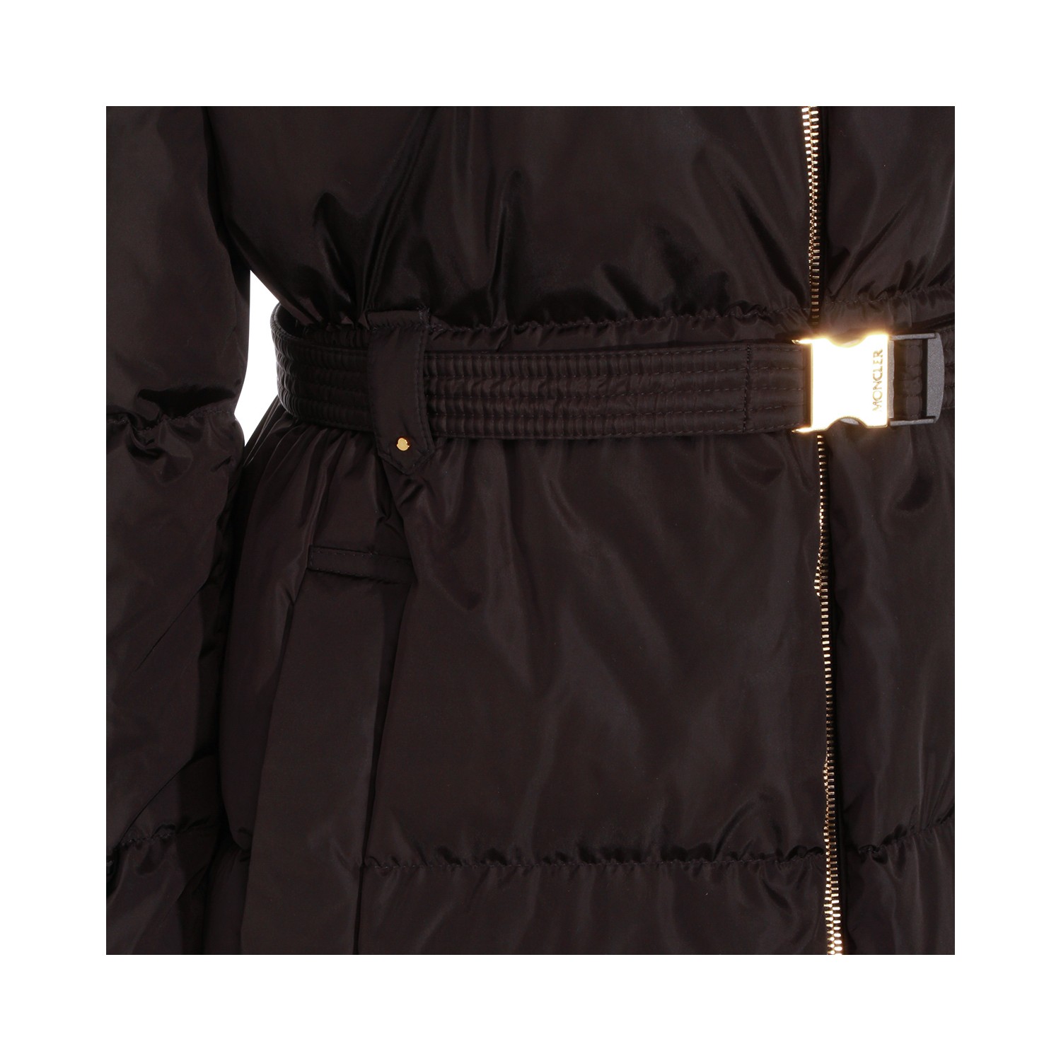 Black down jacket from Moncler featuring high collar, hood, long sleeves, padded, zip fastening, elasticated belt waist and long lenght.