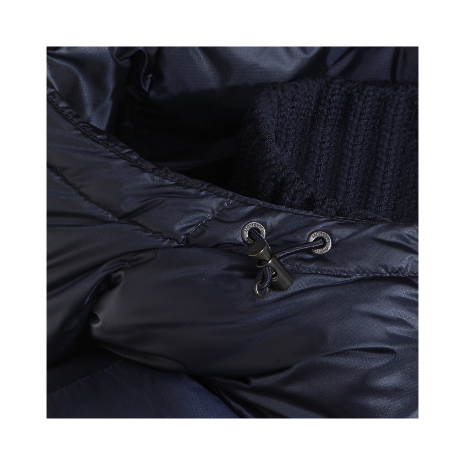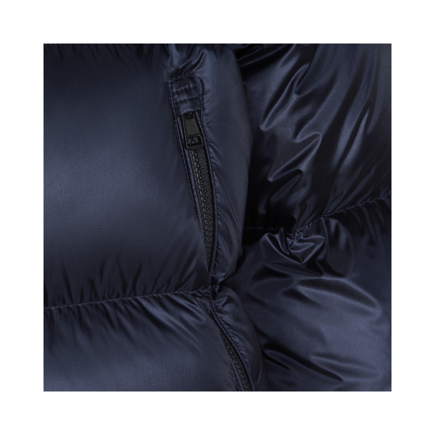 Navy Rivau down jacket from Moncler featuring high collar, hood, long sleeves, padded, zip fastening and regular vestibility.